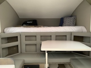 This lightweight truck camper is a more affordable option for those looking for adventure. There is convenient space for additional amenities, such as a portable stove, toilet, and 12V electric cooler depending on your chosen options. You'll sleep soundly each night on the front full-size bed, and the U-shaped dinette can sleep two littles ones. You will also appreciate the pantry system under the dinette for your essentials.