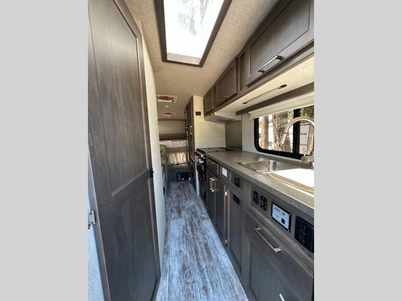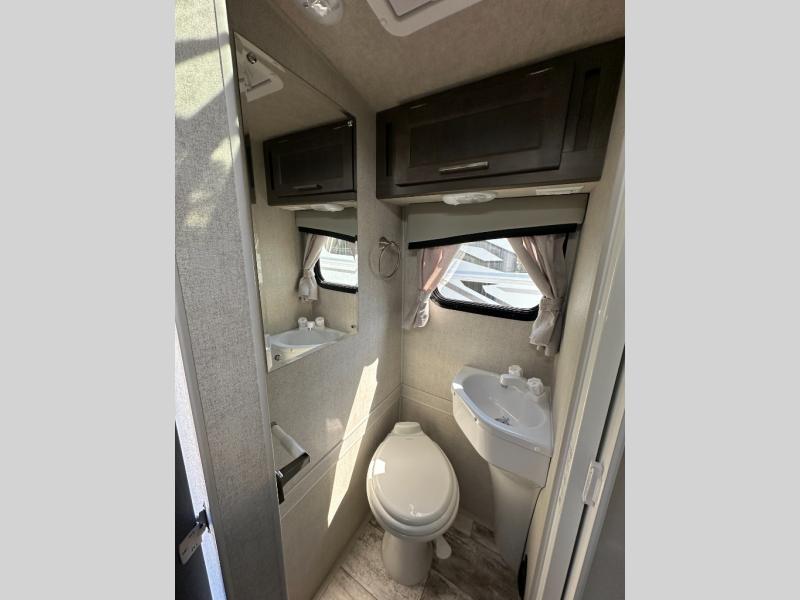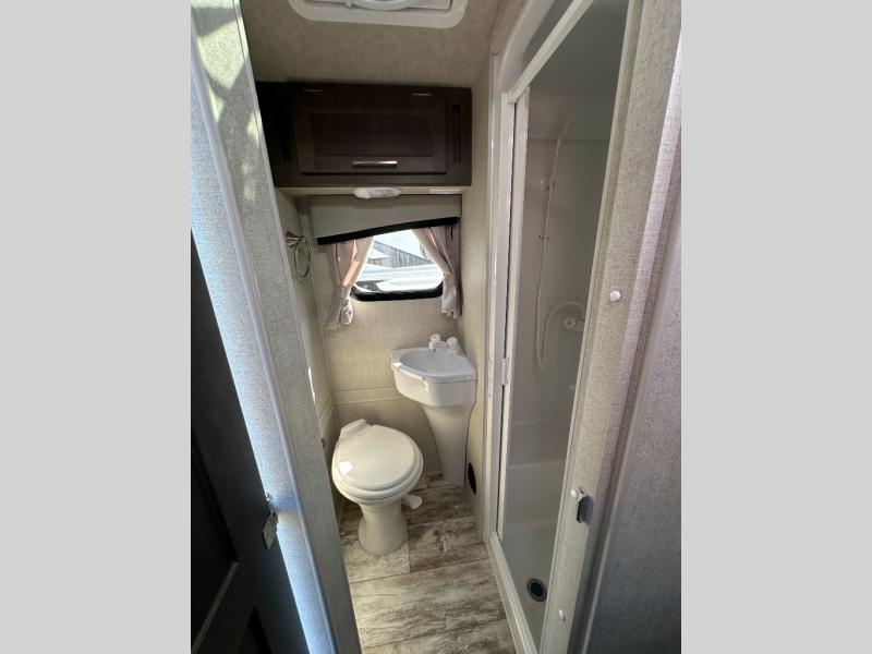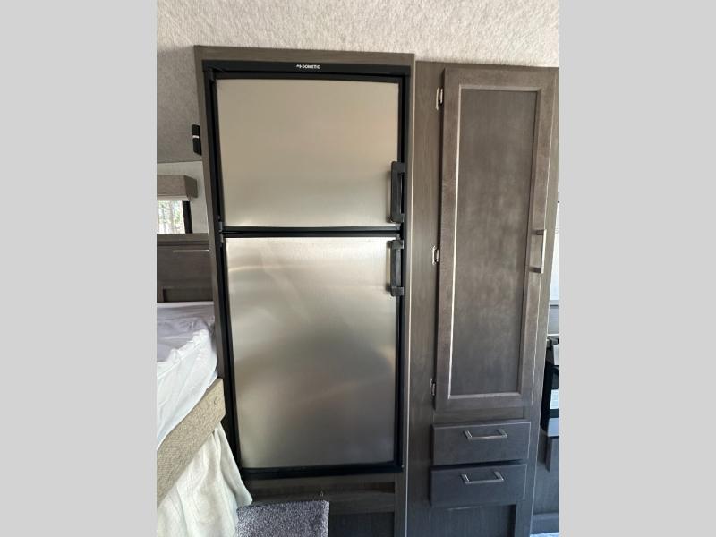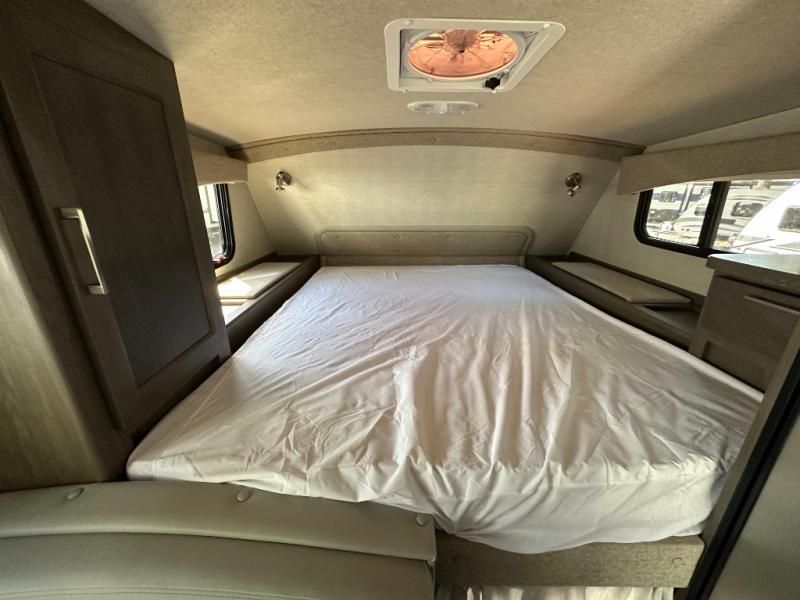 The camping lifestyle is easy when you choose this truck camper with at-home comforts. You can dine at the booth dinette each morning after breakfast is made on the three burner cooktop. There is a stainless steel 2-way 6 cu. ft. refrigerator for perishables, and a cutting board for added convenience when cutting up fresh fruits. After you've spent the day outdoors, you can clean up in the full bath, then head to bed on the front RV queen bed. There are even bedside storage cabinets for your belongings and a shirt closet. How convenient!