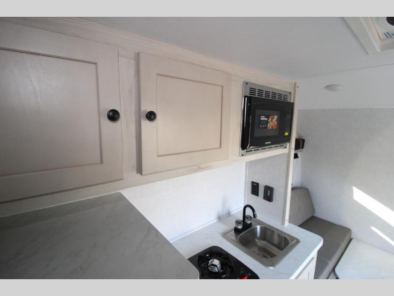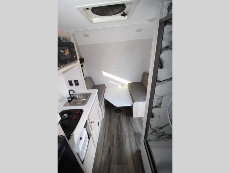 This trailer will feel a little more like home with its queen-size bed! You'll find a convenient wet bath to clean up in each day, plus full kitchen amenities, including a two burner cooktop and a microwave oven. The front dinette will be perfect for dining, playing games, and sleeping an extra guest or two little ones. And since there is a 110V floor mounted A/C included you may just decide to camp all summer!
