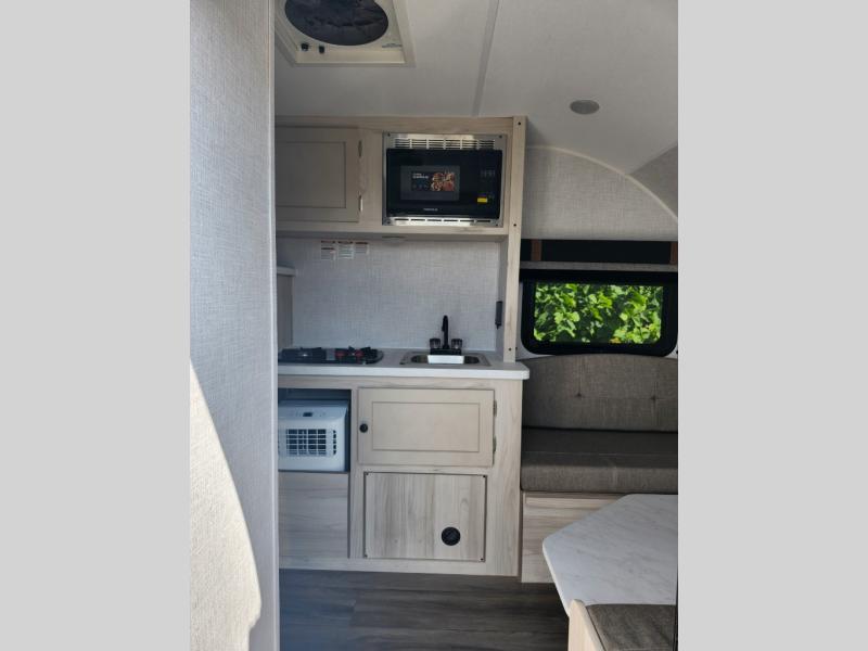 The Standard teardrop trailers by Bontrager Outdoors include a 3,000 lb. high-clearance, torsion-flex, independent axle for smooth towing, and over-sized, all-terrain radial tires with alloy aluminum sport wheels to go off the beaten path. The durable Norco, stamped steel, powder-coated mainframe means you can enjoy your trailer for years to come, and the two rear BAL stabilizing jacks will provide stability as you camp. The Standard teardrop trailers are perfect for those looking for a little extra comfort during their adventures. You'll find an extended wet bath, which you won't find on most teardrop trailers, a small but mighty kitchen area that allows you to make meals each day, plus a 14,300 BTU Truma Combi heater and water heater so you can camp well into the colder months.