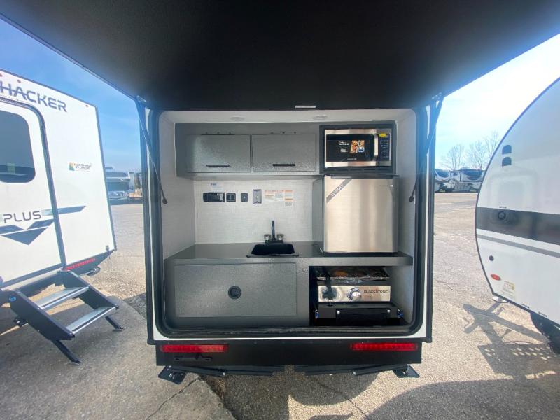 It will be so easy to hitch up and head out in this teardrop trailer! You can sleep two easily since there are comfortable mattresses, and there are storage compartments for your valuables and camp necessities. An outside shower will let you freshen up when you need to, and there is even a portable toilet for added convenience. Within the exterior kitchenette you'll find a microwave, 12V refrigerator and a Blackstone griddle. You'll love the awning included within the Radical Package, along with a high-clearance axle with independent suspension, and Carrera Red Radical graphics!