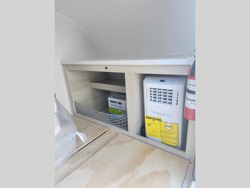 It will be so easy to hitch up and head out in this teardrop trailer! You can sleep two easily since there are comfortable mattresses, and there are storage compartments for your valuables and camp necessities. An outside shower will let you freshen up when you need to, and there is even a portable toilet for added convenience. Within the exterior kitchenette you'll find a microwave, 12V refrigerator and a Blackstone griddle. You'll love the awning included within the Radical Package, along with a high-clearance axle with independent suspension, and Carrera Red Radical graphics!