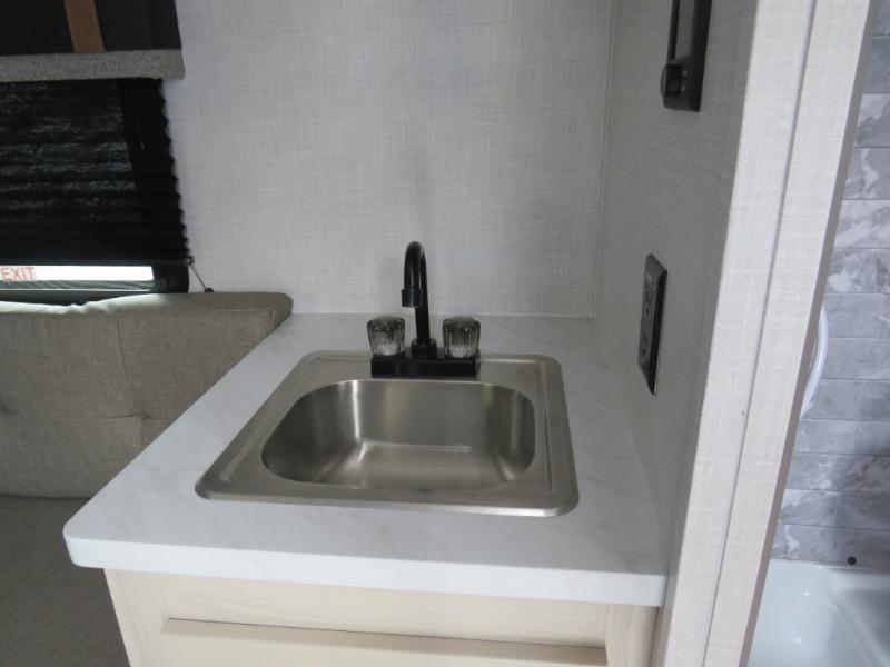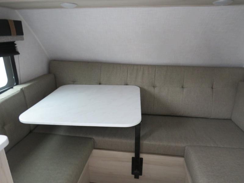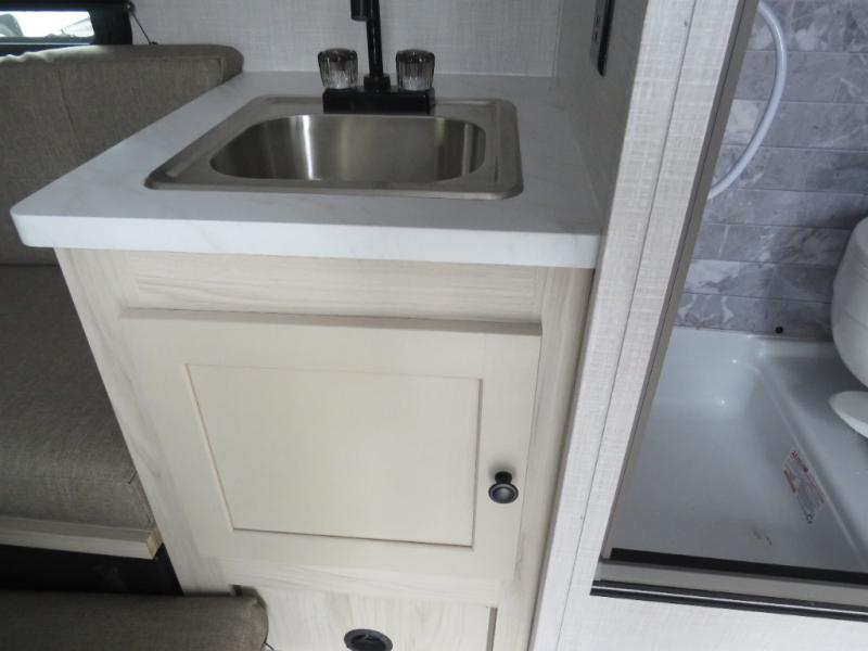Comfort and convenience is found in this cozy trailer for two! Once you've found your campsite you can unpack your things and freshen up in the wet bath. Whip up a hearty lunch on the two burner cooktop, grab a cold drink from the 12V refrigerator, then dine around the U-shaped dinette that can also double as your sleeping space. You will find a large shelf and overhead cabinets for all your belongings, and the 110V floor mounted A/C will keep you cool during the hot summer months!