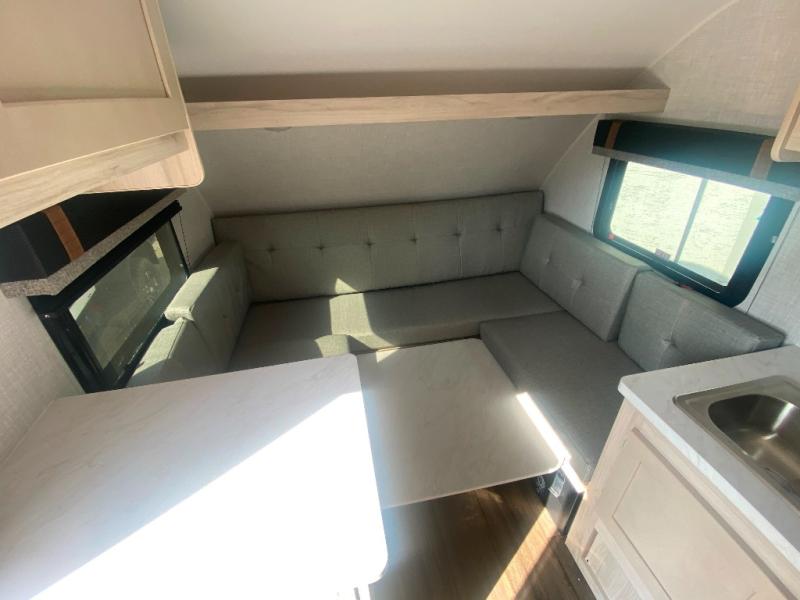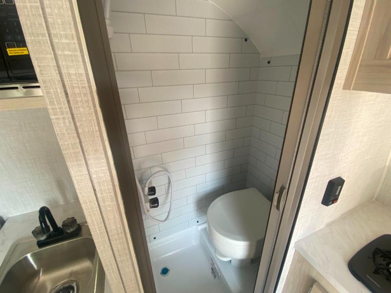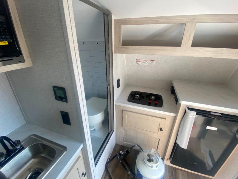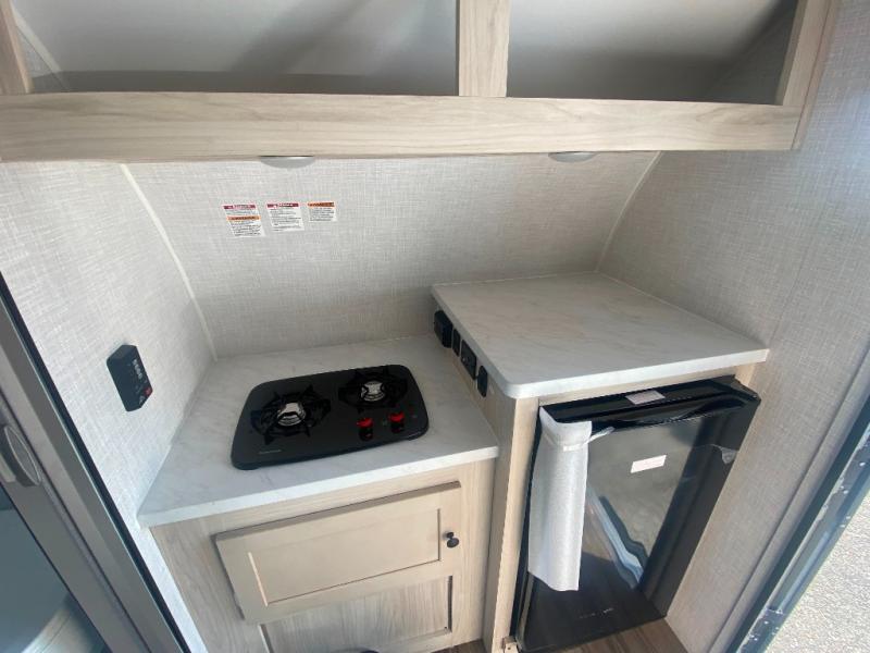 Comfort and convenience is found in this cozy trailer for two! Once you've found your campsite you can unpack your things and freshen up in the wet bath. Whip up a hearty lunch on the two burner cooktop, grab a cold drink from the 12V refrigerator, then dine around the U-shaped dinette that can also double as your sleeping space. You will find a large shelf and overhead cabinets for all your belongings, and the 110V floor mounted A/C will keep you cool during the hot summer months!