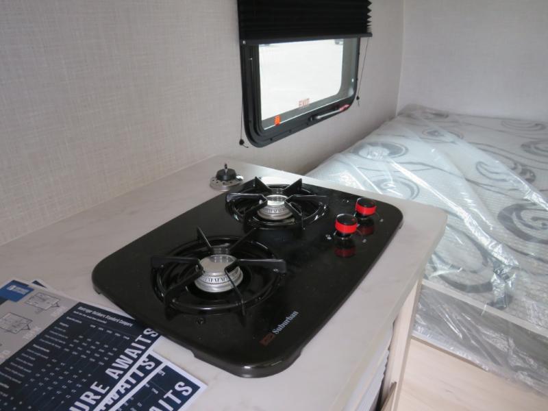 The Standard teardrop trailers by Bontrager Outdoors include a 3,000 lb. high-clearance, torsion-flex, independent axle for smooth towing, and over-sized, all-terrain radial tires with alloy aluminum sport wheels to go off the beaten path. The durable Norco, stamped steel, powder-coated mainframe means you can enjoy your trailer for years to come, and the two rear BAL stabilizing jacks will provide stability as you camp. The Standard teardrop trailers are perfect for those looking for a little extra comfort during their adventures. You'll find an extended wet bath, which you won't find on most teardrop trailers, a small but mighty kitchen area that allows you to make meals each day, plus a 14,300 BTU Truma Combi heater and water heater so you can camp well into the colder months.
