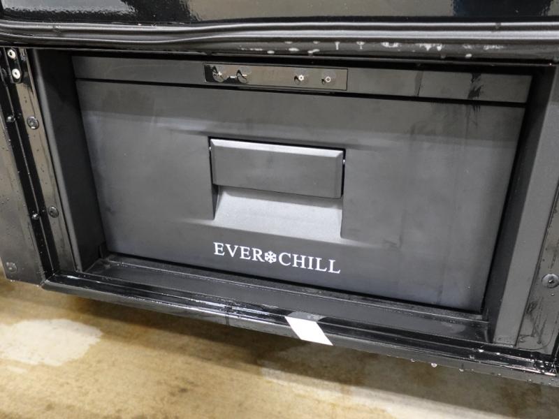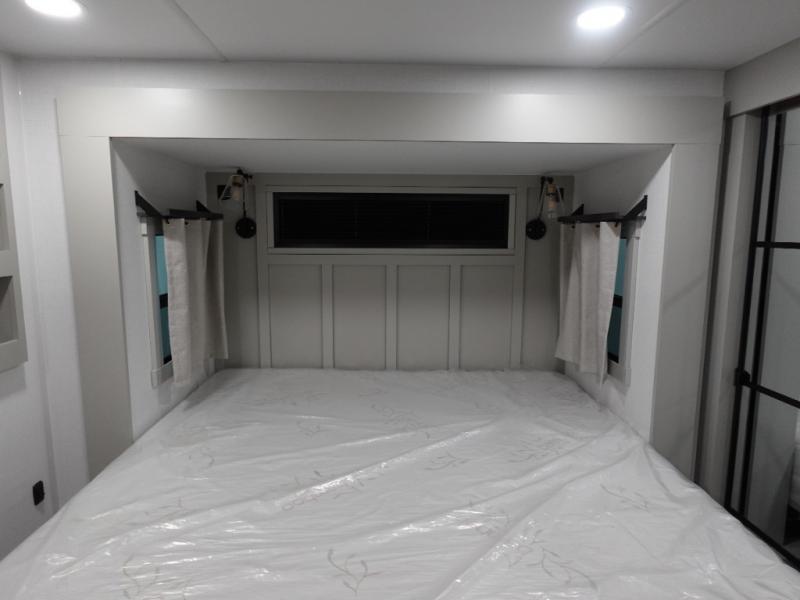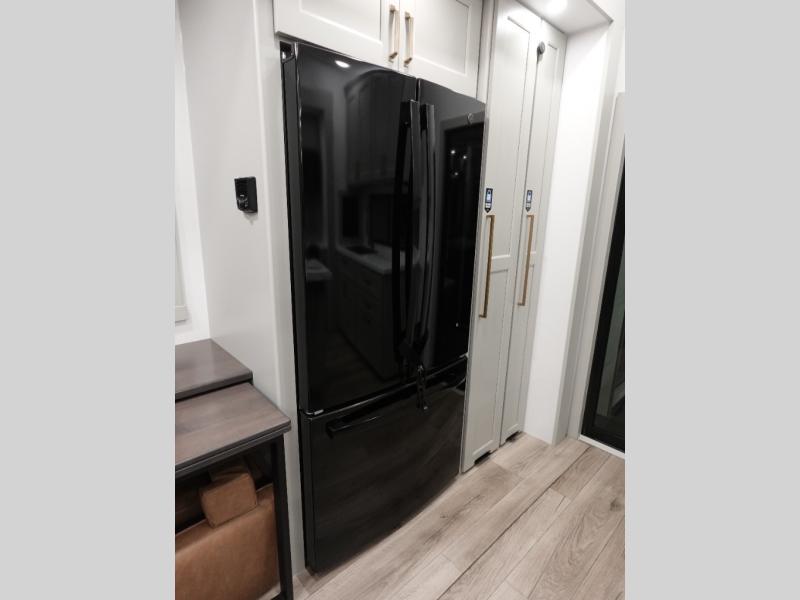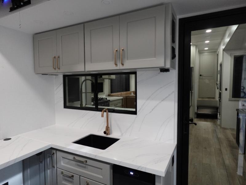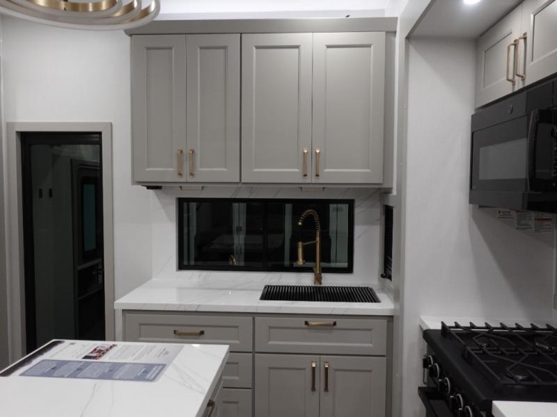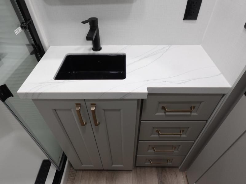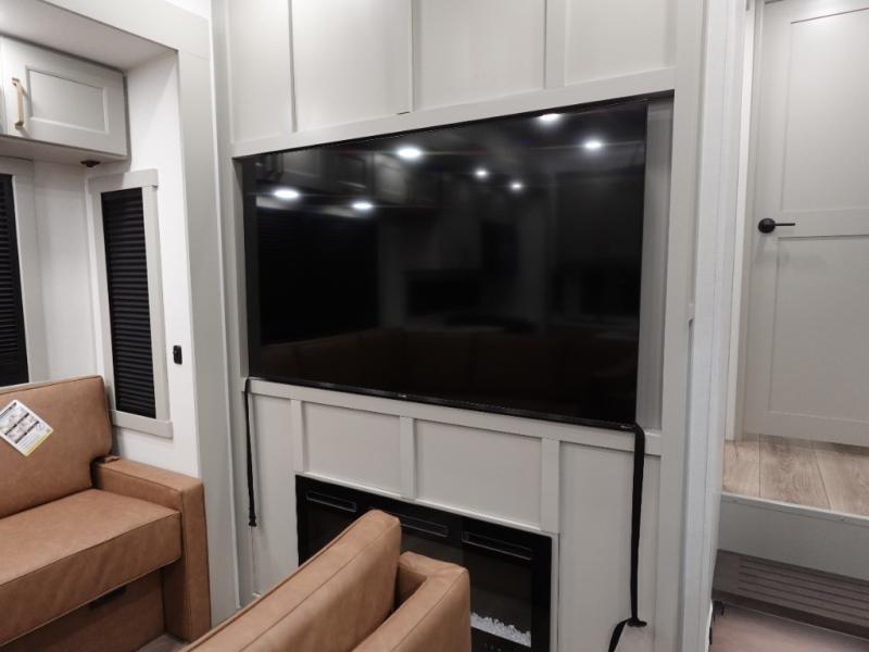 You can't imagine how much this toy hauler has to offer! The garage/outdoor kitchen/office space will allow you to utilize the garage how you need it, plus there is an adjustable tie-down system, as well as a loft for storage and a twin bed to sleep more campers! The garage patio with a 1,500 lb. capacity is another feature you are sure to love, especially with its own awning to keep you protected from the elements. Head to the kitchen to prepare meals with a 24" GE oven with a four burner range, a GE microwave with an air fryer, plus a spacious GE Energy Star 19 cu. ft. refrigerator. The island with two stools will let others visit with you while you cook, and there are even dog bowls to easily feed Frodo. You'll find the convertible dining table/L-desk will be accommodating since it can be use to dine at, and to get some work done. You may just find yourselves spending most of your time on the U-sofa in front of the entertainment center with a TV, fireplace and storage. A full bath is up front by the bedroom, and here you'll find a 30" x 43" shower and and pull-out linen storage with a trash bin to keep towels ready to use. After a day outdoors you'll love nothing more than coming back to your own bedroom with a king bed slide out, TV, a walk-in closet, and many more storage spaces. And we haven't even touched on the exterior features, like the 3-way pass-through storage, three power awnings, an air compressor to fill up tires, and the list goes on and on! This is a pre-production preview, all features and layout placement subject to change.