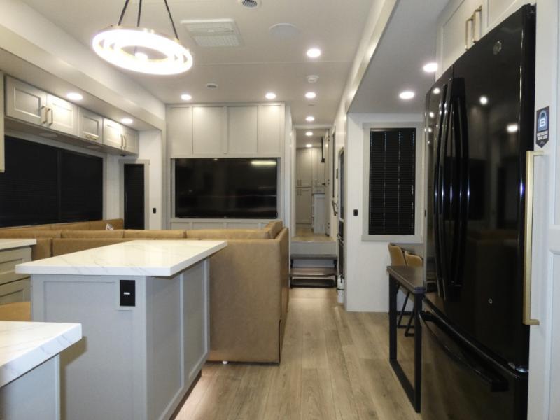 With any Model G toy hauler fifth wheel by Brinkley you will enjoy luxurious amenities, tons of storage space, and innovative features that have been developed and tested in the real world. Durable construction includes an industry leading PDI process, an industry best insulation package, and reinforced and walkable slide roofs. Some of the exterior features you'll find are a 3-way pass-through with a multi-functional flip-up bulkhead wall, under I-beam storage, a MAX-Vision reverse lighting system, and a low-maintenance roof to name a few. A Rockford Fosgate audio system comes standard, along with a OneControl app system that lets you control your fifth wheel's functions right from your mobile device. You will find the solar system with a designated storage area to be ultra convenient, plus there is a FlexPower 5500 with a dual fuel inverter generator for all your power needs. Head inside to find a residential interior with Brinkley's CraftSense wood trim construction, floating entrance steps, integrated window screens and insulated blackout blinds, and residential solid surface countertops plus backsplash. You will also enjoy the neon shower lighting and recessed medicine cabinets in the bath, plus motion activated LED bed lights and dual bedside outlets in the bedroom. Choose a Model G toy hauler fifth wheel to experience all the luxury it has to offer!