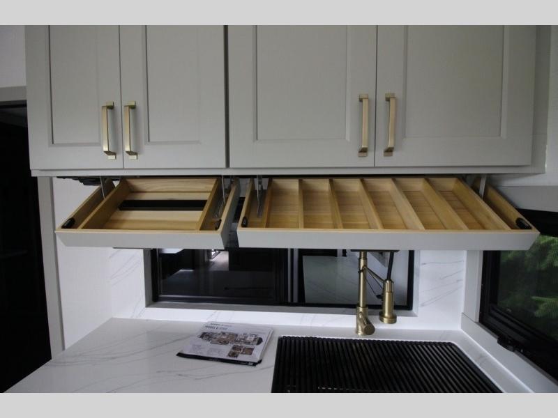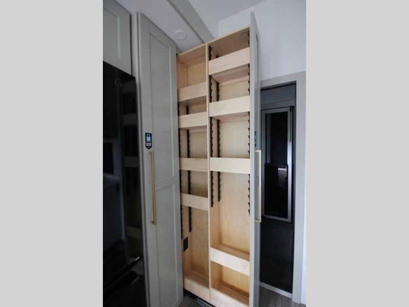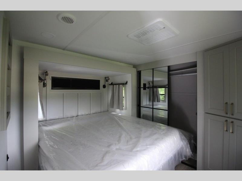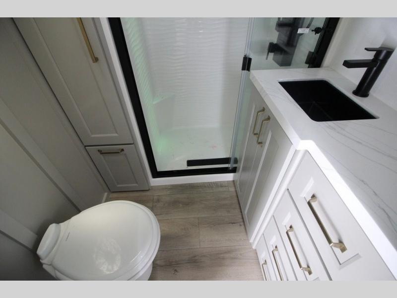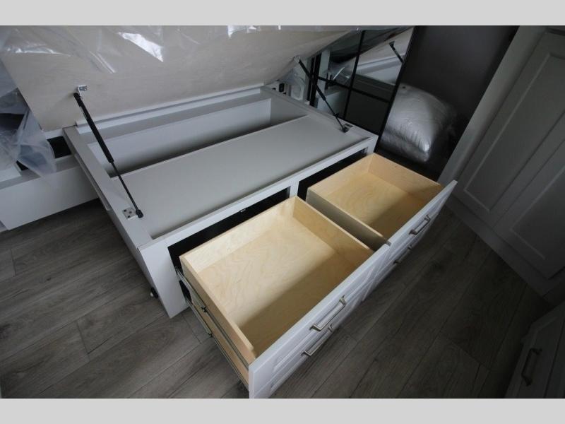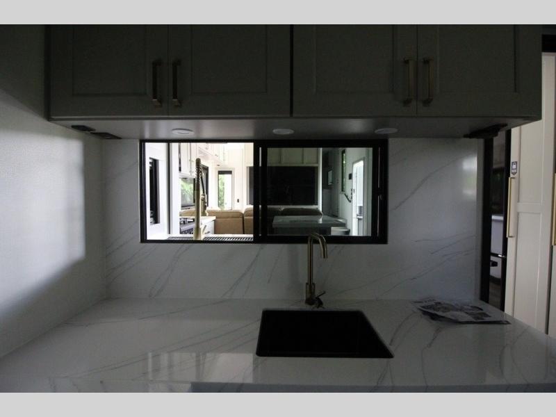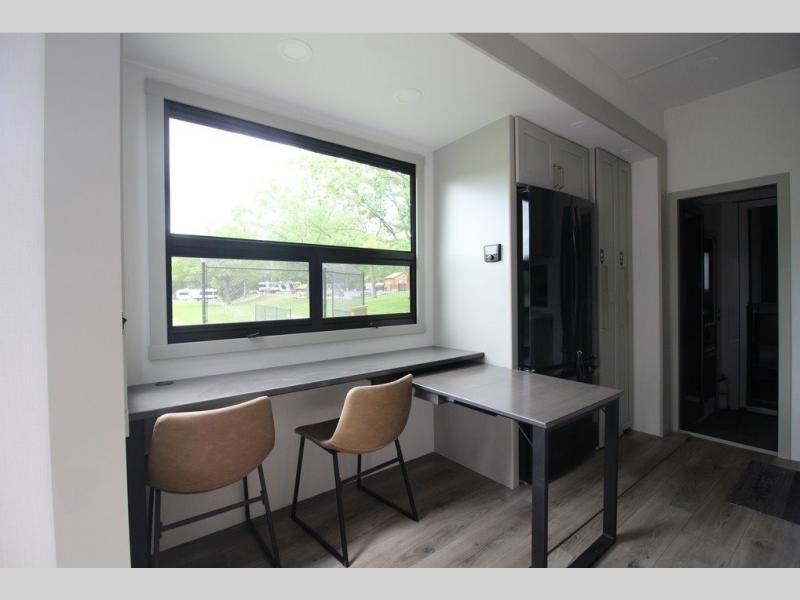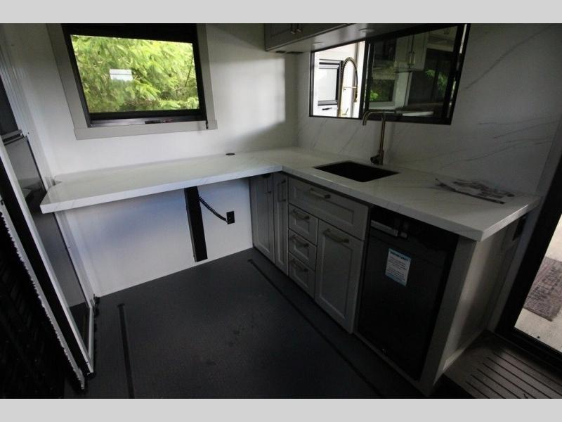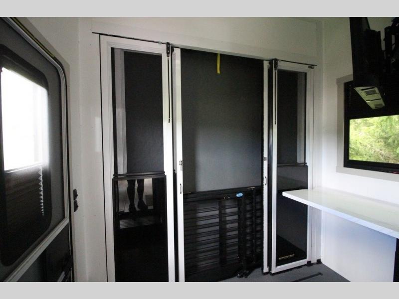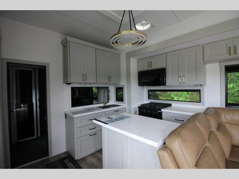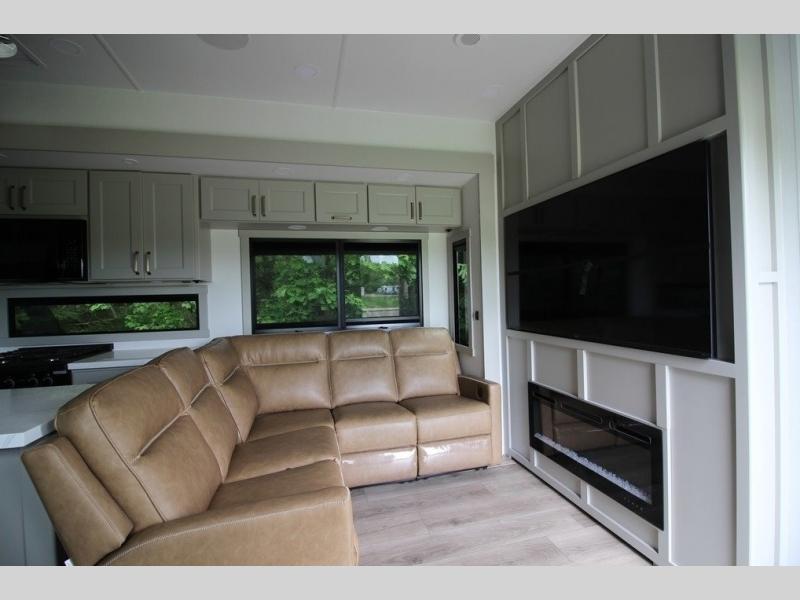 You can't imagine how much this toy hauler has to offer! The garage/outdoor kitchen/office space will allow you to utilize the garage how you need it, plus there is an adjustable tie-down system, as well as a loft for storage and a twin bed to sleep more campers! The garage patio with a 1,500 lb. capacity is another feature you are sure to love, especially with its own awning to keep you protected from the elements. Head to the kitchen to prepare meals with a 24" GE oven with a four burner range, a GE microwave with an air fryer, plus a spacious GE Energy Star 19 cu. ft. refrigerator. The island with two stools will let others visit with you while you cook, and there are even dog bowls to easily feed Frodo. You'll find the convertible dining table/L-desk will be accommodating since it can be use to dine at, and to get some work done. You may just find yourselves spending most of your time on the U-sofa in front of the entertainment center with a TV, fireplace and storage. A full bath is up front by the bedroom, and here you'll find a 30" x 43" shower and and pull-out linen storage with a trash bin to keep towels ready to use. After a day outdoors you'll love nothing more than coming back to your own bedroom with a king bed slide out, TV, a walk-in closet, and many more storage spaces. And we haven't even touched on the exterior features, like the 3-way pass-through storage, three power awnings, an air compressor to fill up tires, and the list goes on and on! This is a pre-production preview, all features and layout placement subject to change.