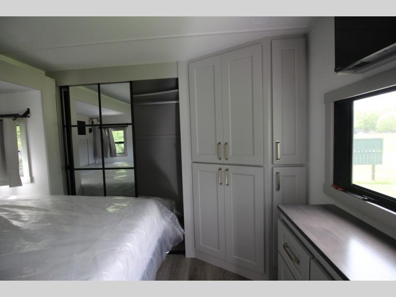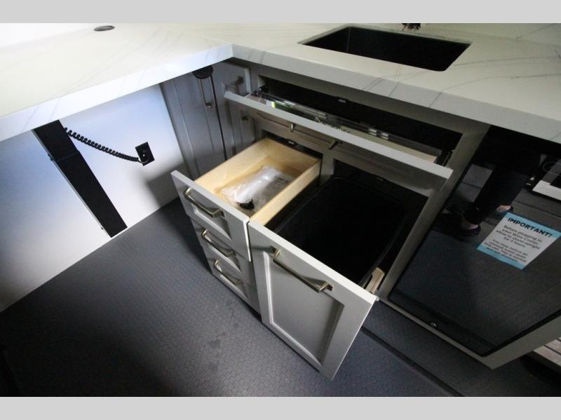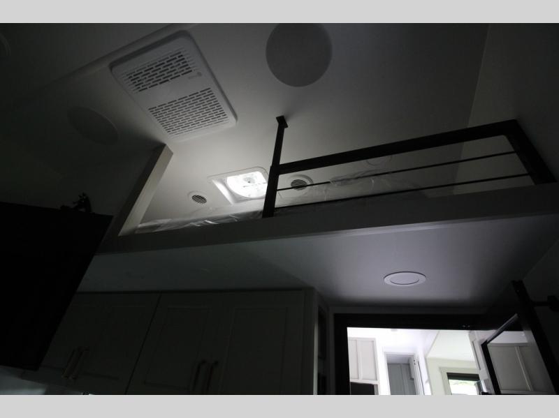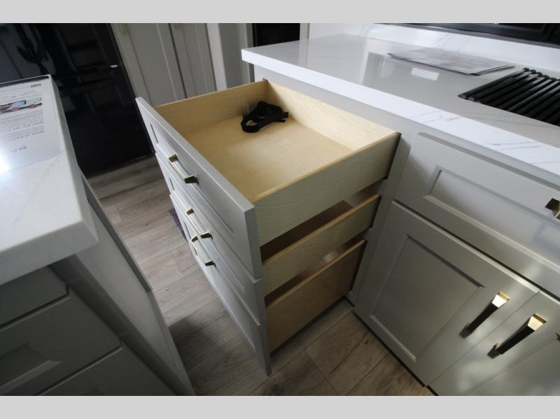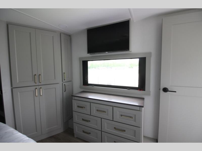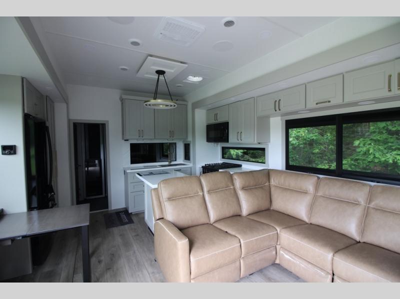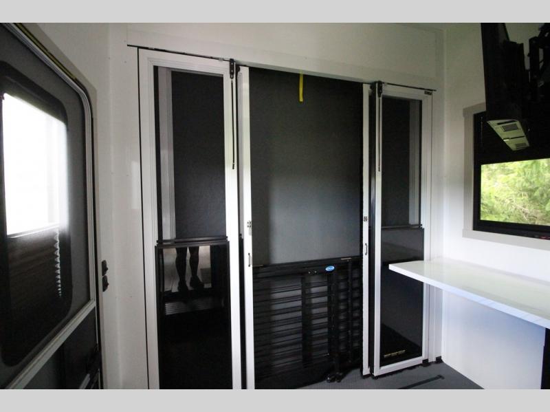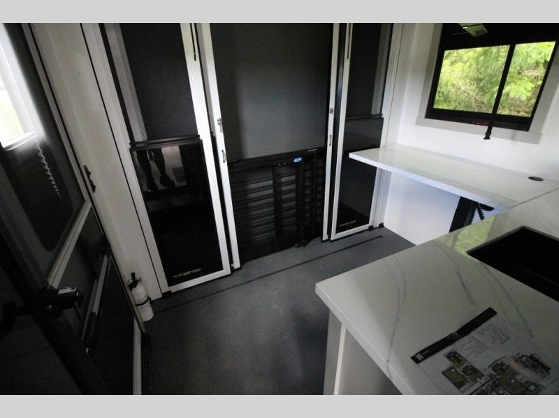 You can't imagine how much this toy hauler has to offer! The garage/outdoor kitchen/office space will allow you to utilize the garage how you need it, plus there is an adjustable tie-down system, as well as a loft for storage and a twin bed to sleep more campers! The garage patio with a 1,500 lb. capacity is another feature you are sure to love, especially with its own awning to keep you protected from the elements. Head to the kitchen to prepare meals with a 24" GE oven with a four burner range, a GE microwave with an air fryer, plus a spacious GE Energy Star 19 cu. ft. refrigerator. The island with two stools will let others visit with you while you cook, and there are even dog bowls to easily feed Frodo. You'll find the convertible dining table/L-desk will be accommodating since it can be use to dine at, and to get some work done. You may just find yourselves spending most of your time on the U-sofa in front of the entertainment center with a TV, fireplace and storage. A full bath is up front by the bedroom, and here you'll find a 30" x 43" shower and and pull-out linen storage with a trash bin to keep towels ready to use. After a day outdoors you'll love nothing more than coming back to your own bedroom with a king bed slide out, TV, a walk-in closet, and many more storage spaces. And we haven't even touched on the exterior features, like the 3-way pass-through storage, three power awnings, an air compressor to fill up tires, and the list goes on and on! This is a pre-production preview, all features and layout placement subject to change.