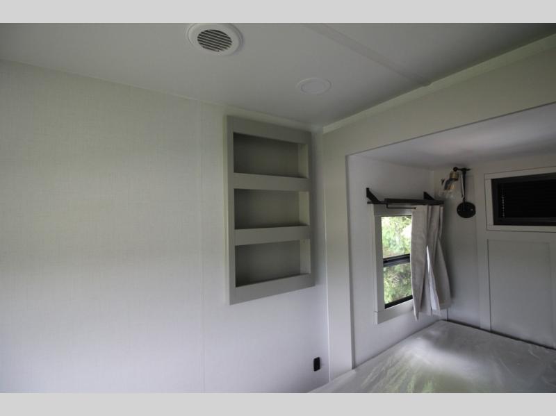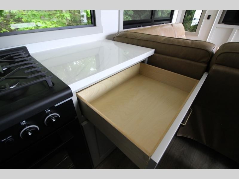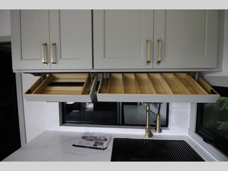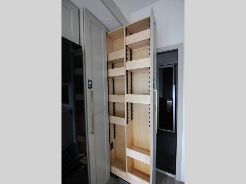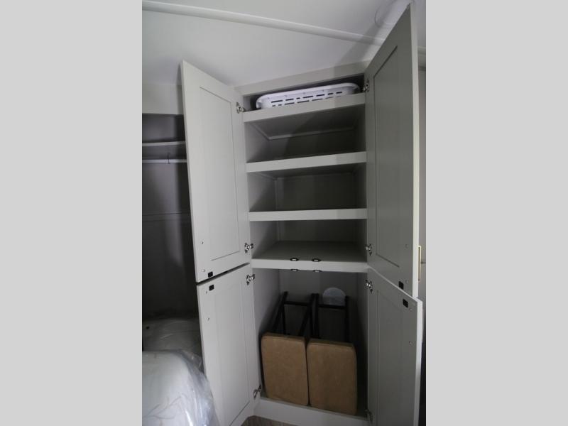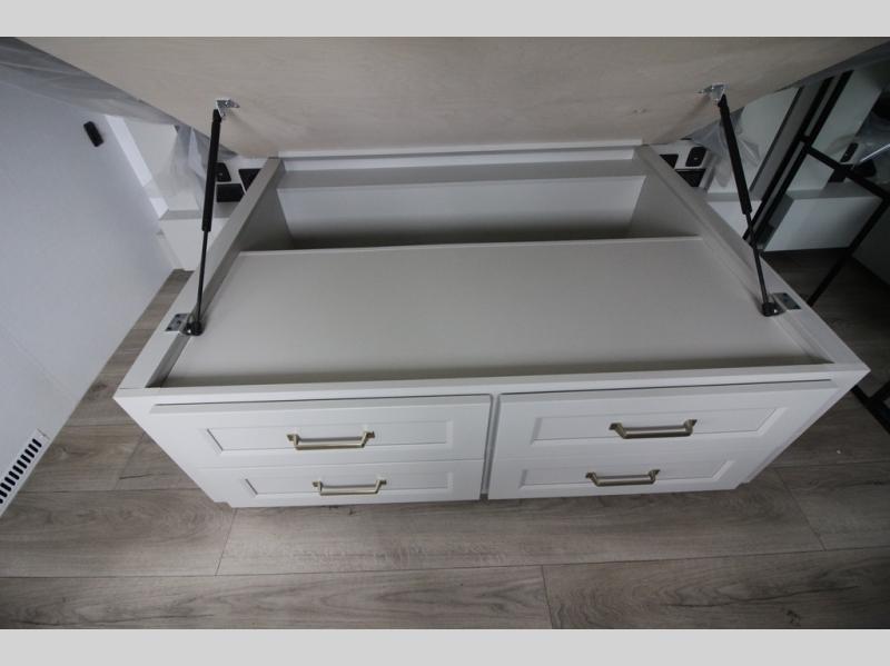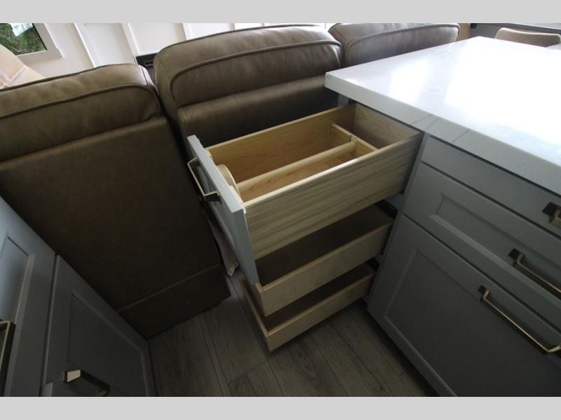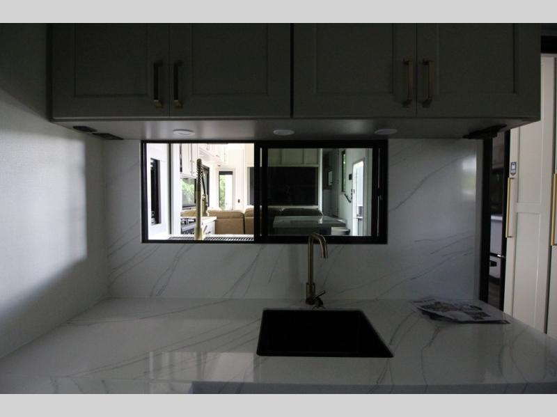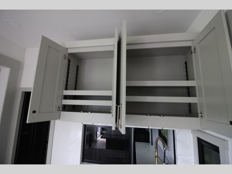 You can't imagine how much this toy hauler has to offer! The garage/outdoor kitchen/office space will allow you to utilize the garage how you need it, plus there is an adjustable tie-down system, as well as a loft for storage and a twin bed to sleep more campers! The garage patio with a 1,500 lb. capacity is another feature you are sure to love, especially with its own awning to keep you protected from the elements. Head to the kitchen to prepare meals with a 24" GE oven with a four burner range, a GE microwave with an air fryer, plus a spacious GE Energy Star 19 cu. ft. refrigerator. The island with two stools will let others visit with you while you cook, and there are even dog bowls to easily feed Frodo. You'll find the convertible dining table/L-desk will be accommodating since it can be use to dine at, and to get some work done. You may just find yourselves spending most of your time on the U-sofa in front of the entertainment center with a TV, fireplace and storage. A full bath is up front by the bedroom, and here you'll find a 30" x 43" shower and and pull-out linen storage with a trash bin to keep towels ready to use. After a day outdoors you'll love nothing more than coming back to your own bedroom with a king bed slide out, TV, a walk-in closet, and many more storage spaces. And we haven't even touched on the exterior features, like the 3-way pass-through storage, three power awnings, an air compressor to fill up tires, and the list goes on and on! This is a pre-production preview, all features and layout placement subject to change.