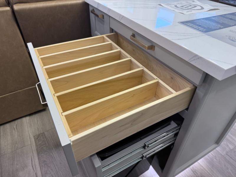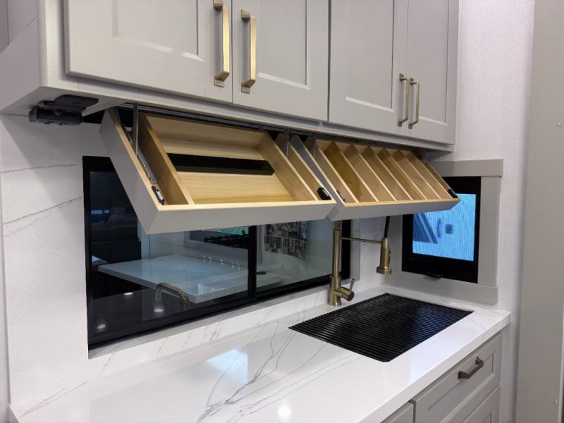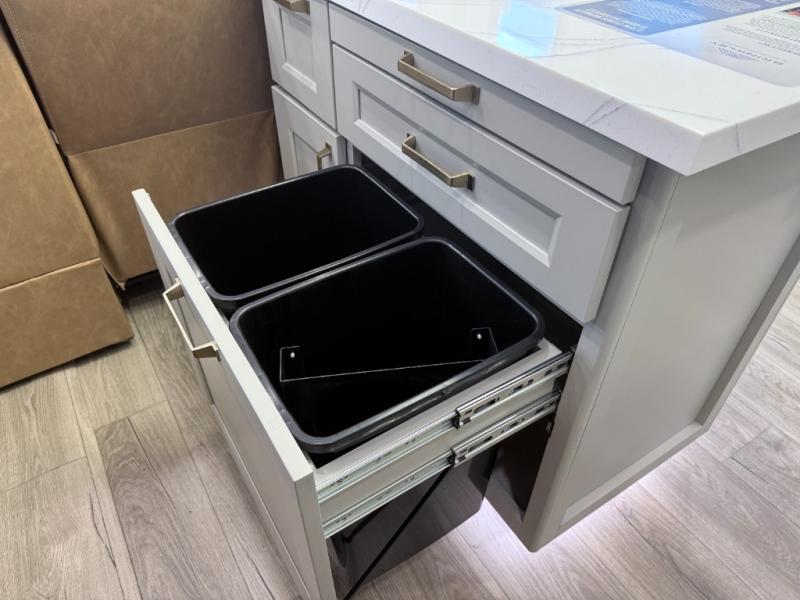 - Pull-out trash bins and built-in dog bowls