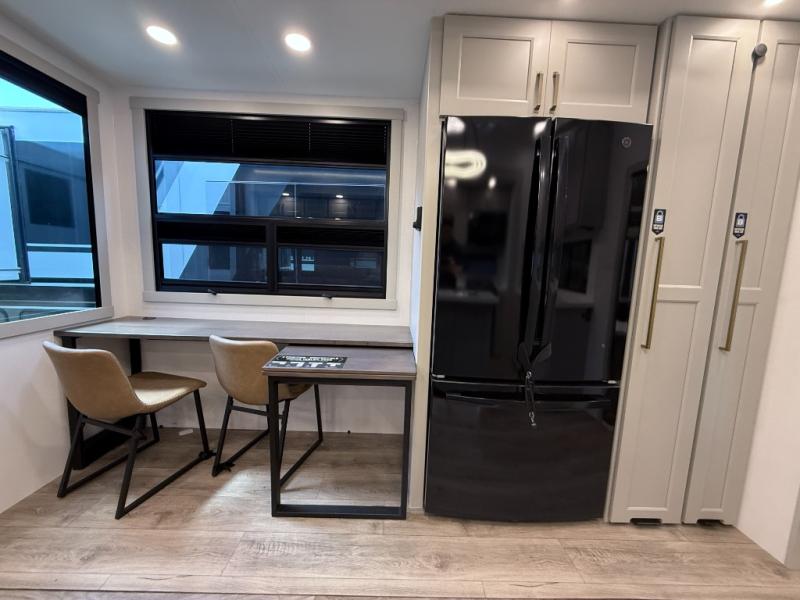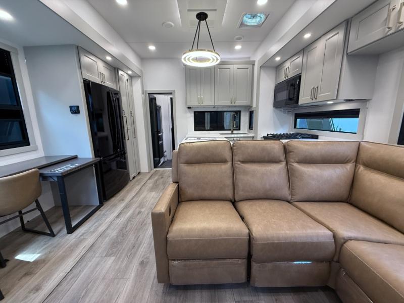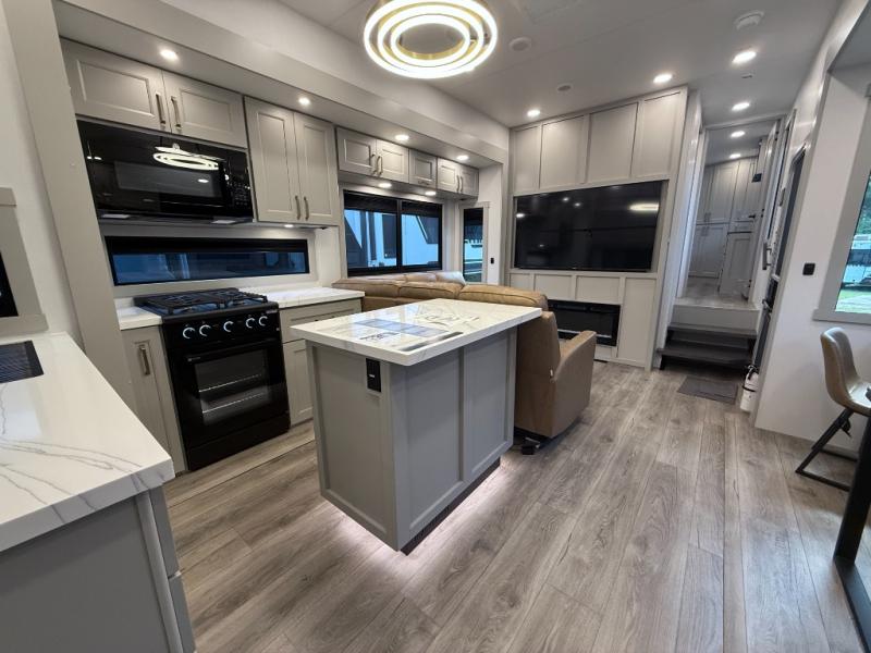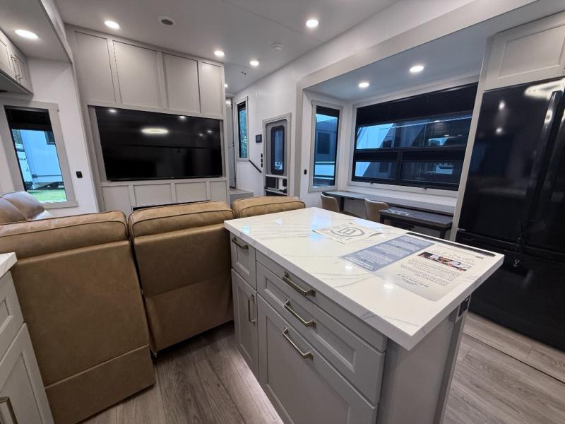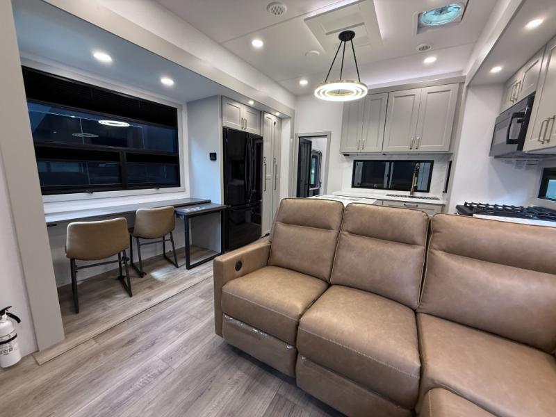 The Brinkley Model G 3250 combines luxury, innovation, and versatility in a toy hauler designed for both adventure and comfort. With its flexible garage space that doubles as an office or outdoor kitchen, plus a loft for extra sleeping or storage, this model adapts to your lifestyle. Inside, you’ll find an upgraded L-shape sofa with four recliners, a spacious kitchen with GE appliances, and thoughtful touches like pull-out trash bins and built-in dog bowls. The result is a fifth wheel that feels like home wherever the road takes you.