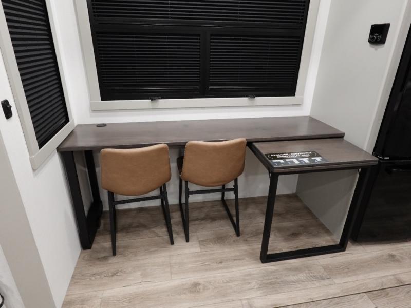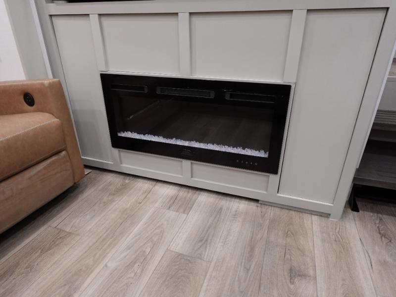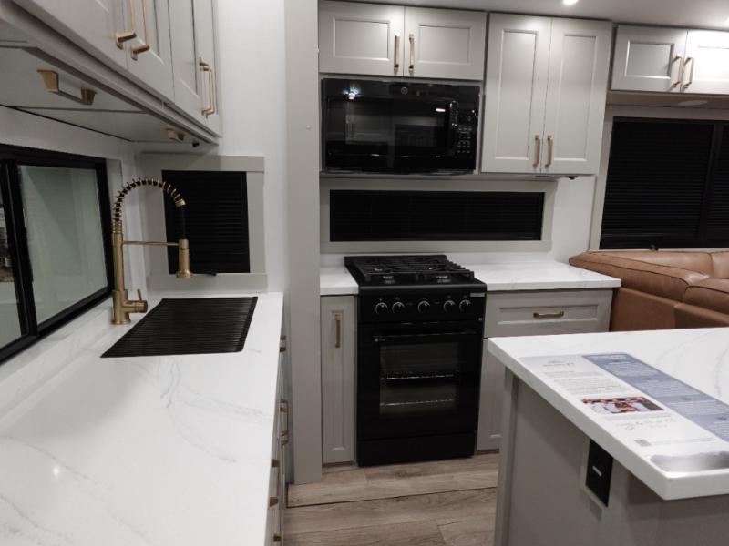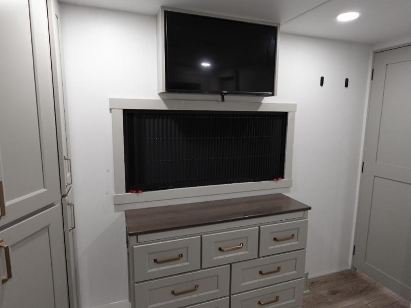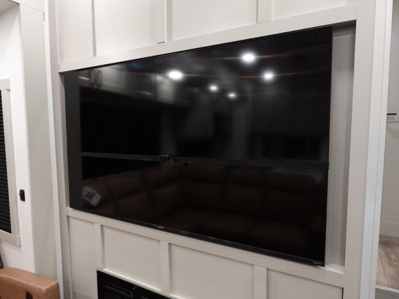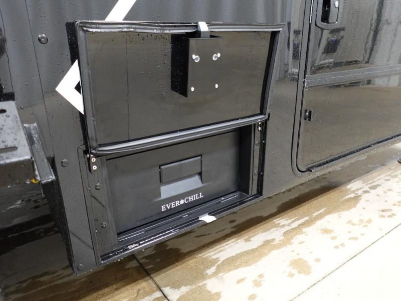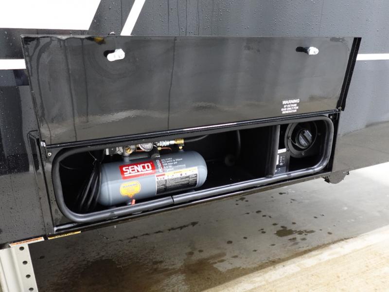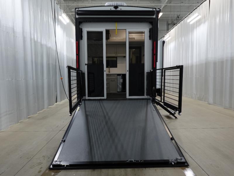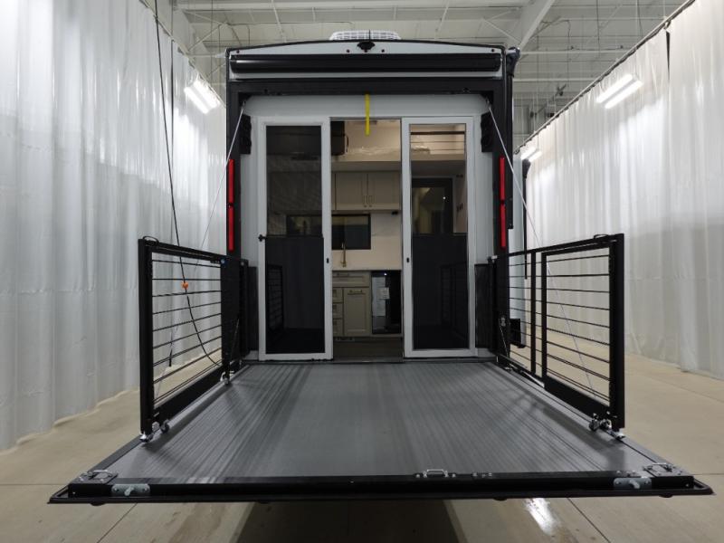 You can't imagine how much this toy hauler has to offer! The garage/outdoor kitchen/office space will allow you to utilize the garage how you need it, plus there is an adjustable tie-down system, as well as a loft for storage and a twin bed to sleep more campers! The garage patio with a 1,500 lb. capacity is another feature you are sure to love, especially with its own awning to keep you protected from the elements. Head to the kitchen to prepare meals with a 24" GE oven with a four burner range, a GE microwave with an air fryer, plus a spacious GE Energy Star 19 cu. ft. refrigerator. The island with two stools will let others visit with you while you cook, and there are even dog bowls to easily feed Frodo. You'll find the convertible dining table/L-desk will be accommodating since it can be use to dine at, and to get some work done. You may just find yourselves spending most of your time on the L-sofa in front of the entertainment center with a TV, fireplace and storage. A full bath is up front by the bedroom, and here you'll find a 30" x 42" shower and and pull-out linen storage with a trash bin to keep towels ready to use. After a day outdoors you'll love nothing more than coming back to your own bedroom with a king bed slide out, TV, a walk-in closet, and many more storage spaces. And we haven't even touched on the exterior features, like the 3-way pass-through storage, three power awnings, an air compressor to fill up tires, and the list goes on and on! This is a pre-production preview, all features and layout placement subject to change.