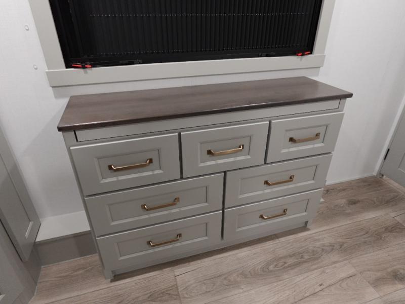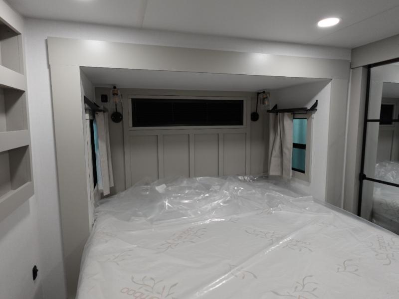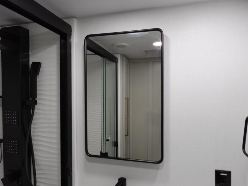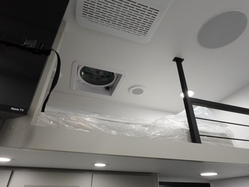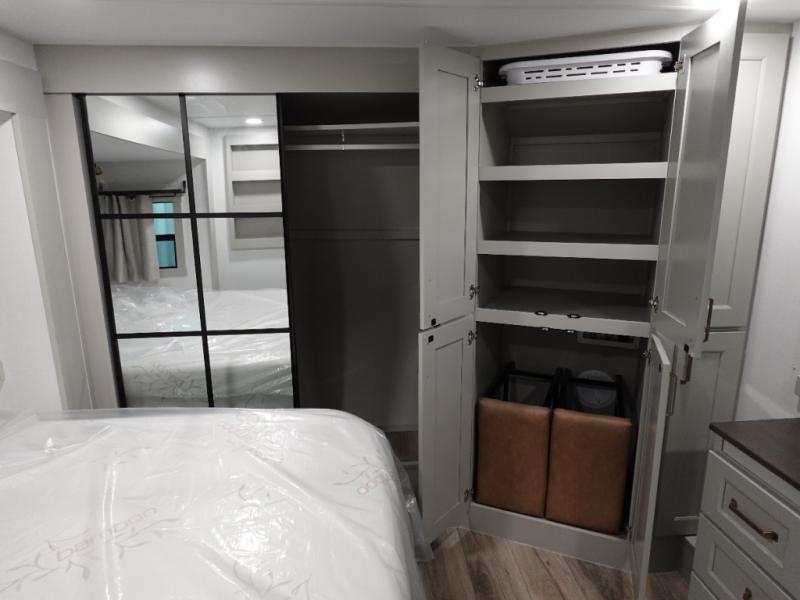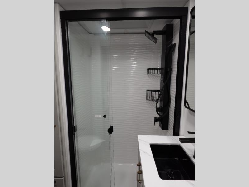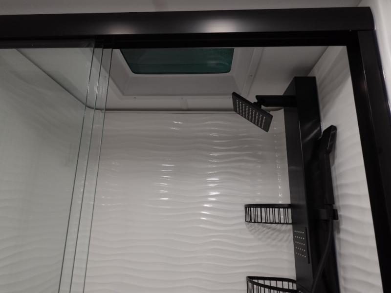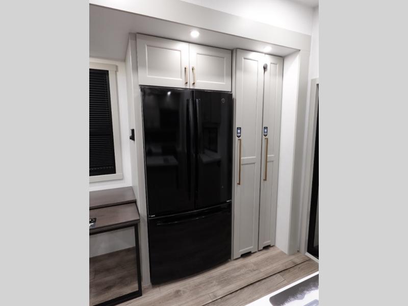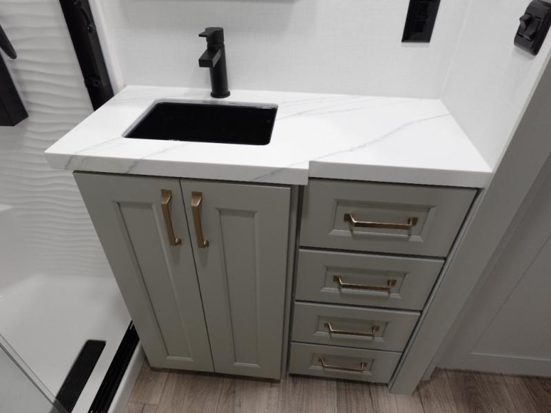 You can't imagine how much this toy hauler has to offer! The garage/outdoor kitchen/office space will allow you to utilize the garage how you need it, plus there is an adjustable tie-down system, as well as a loft for storage and a twin bed to sleep more campers! The garage patio with a 1,500 lb. capacity is another feature you are sure to love, especially with its own awning to keep you protected from the elements. Head to the kitchen to prepare meals with a 24" GE oven with a four burner range, a GE microwave with an air fryer, plus a spacious GE Energy Star 19 cu. ft. refrigerator. The island with two stools will let others visit with you while you cook, and there are even dog bowls to easily feed Frodo. You'll find the convertible dining table/L-desk will be accommodating since it can be use to dine at, and to get some work done. You may just find yourselves spending most of your time on the L-sofa in front of the entertainment center with a TV, fireplace and storage. A full bath is up front by the bedroom, and here you'll find a 30" x 42" shower and and pull-out linen storage with a trash bin to keep towels ready to use. After a day outdoors you'll love nothing more than coming back to your own bedroom with a king bed slide out, TV, a walk-in closet, and many more storage spaces. And we haven't even touched on the exterior features, like the 3-way pass-through storage, three power awnings, an air compressor to fill up tires, and the list goes on and on! This is a pre-production preview, all features and layout placement subject to change.