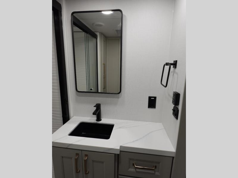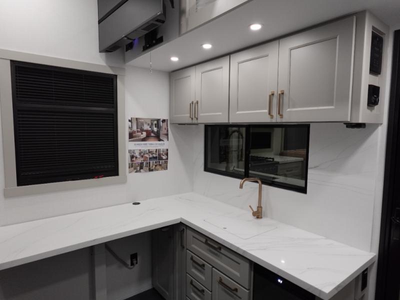 With any Model G toy hauler fifth wheel by Brinkley you will enjoy luxurious amenities, tons of storage space, and innovative features that have been developed and tested in the real world. Durable construction includes an industry leading PDI process, an industry best insulation package, and reinforced and walkable slide roofs. Some of the exterior features you'll find are a 3-way pass-through with a multi-functional flip-up bulkhead wall, under I-beam storage, a MAX-Vision reverse lighting system, and a low-maintenance roof to name a few. A Rockford Fosgate audio system comes standard, along with a Full app-based coach control system (iOS & Android) that lets you control your fifth wheel's functions right from your mobile device. You will find the solar system with a designated storage area to be ultra convenient, plus there is a FlexPower 5500 with a dual fuel inverter generator for all your power needs. Head inside to find a residential interior with Brinkley's CraftSense wood trim construction, floating entrance steps, integrated window screens and insulated blackout blinds, and residential solid surface countertops plus backsplash. You will also enjoy the neon shower lighting and recessed medicine cabinets in the bath, plus motion activated LED bed lights and dual bedside outlets in the bedroom. Choose a Model G toy hauler fifth wheel to experience all the luxury it has to offer!
