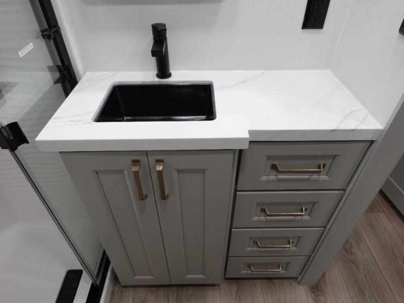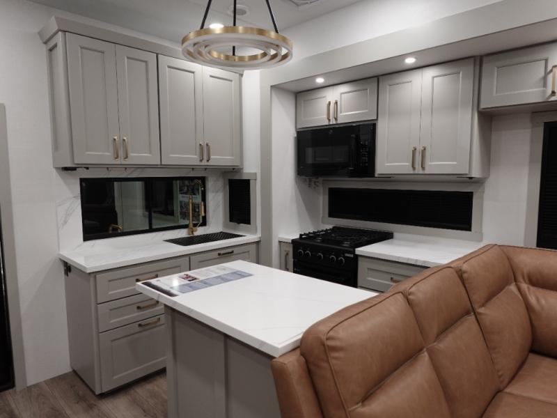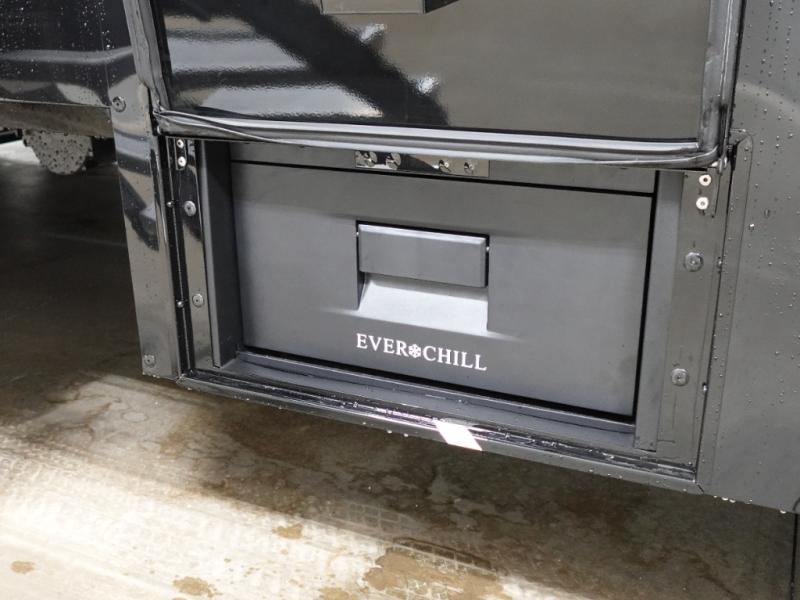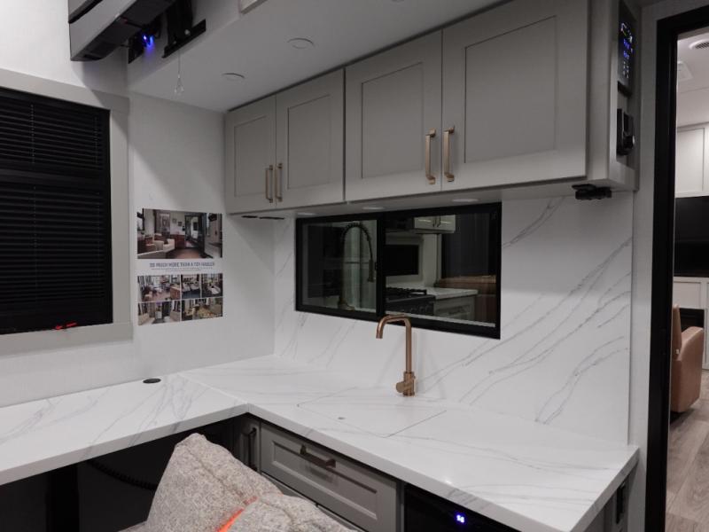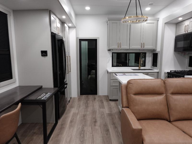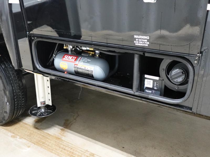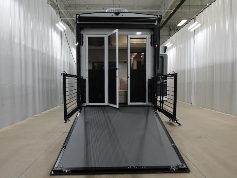 You can't imagine how much this toy hauler has to offer! The garage/outdoor kitchen/office space will allow you to utilize the garage how you need it, plus there is an adjustable tie-down system, as well as a loft for storage and a twin bed to sleep more campers! The garage patio with a 1,500 lb. capacity is another feature you are sure to love, especially with its own awning to keep you protected from the elements. Head to the kitchen to prepare meals with a 24" GE oven with a four burner range, a GE microwave with an air fryer, plus a spacious GE Energy Star 19 cu. ft. refrigerator. The island with two stools will let others visit with you while you cook, and there are even dog bowls to easily feed Frodo. You'll find the convertible dining table/L-desk will be accommodating since it can be use to dine at, and to get some work done. You may just find yourselves spending most of your time on the L-sofa in front of the entertainment center with a TV, fireplace and storage. A full bath is up front by the bedroom, and here you'll find a 30" x 42" shower and and pull-out linen storage with a trash bin to keep towels ready to use. After a day outdoors you'll love nothing more than coming back to your own bedroom with a king bed slide out, TV, a walk-in closet, and many more storage spaces. And we haven't even touched on the exterior features, like the 3-way pass-through storage, three power awnings, an air compressor to fill up tires, and the list goes on and on! This is a pre-production preview, all features and layout placement subject to change.