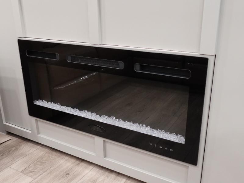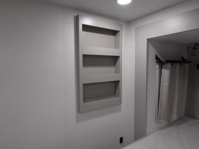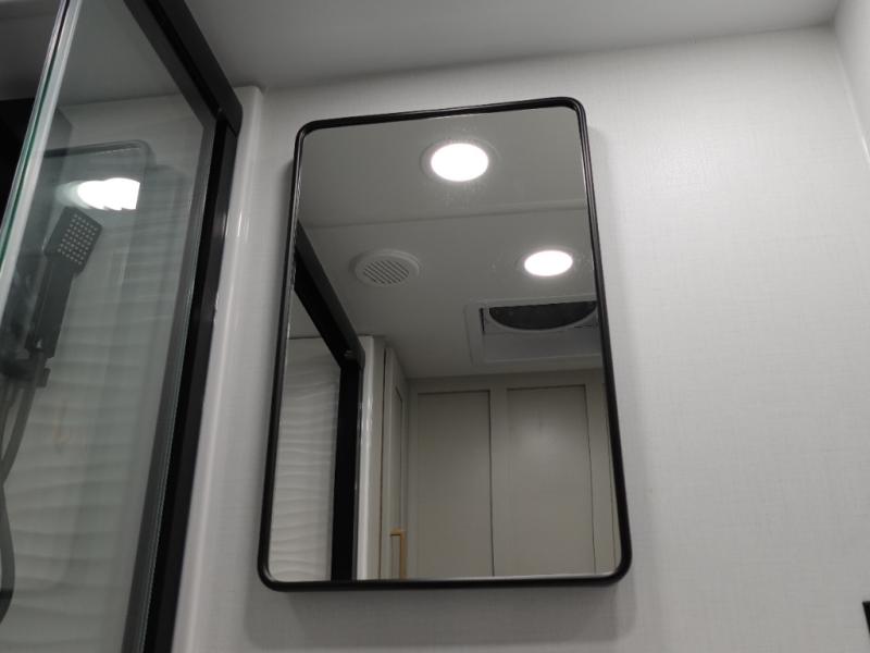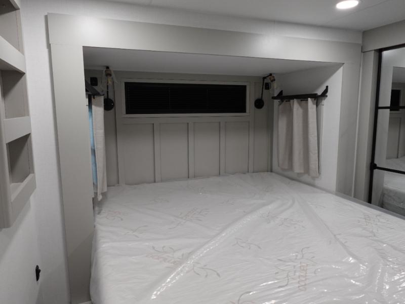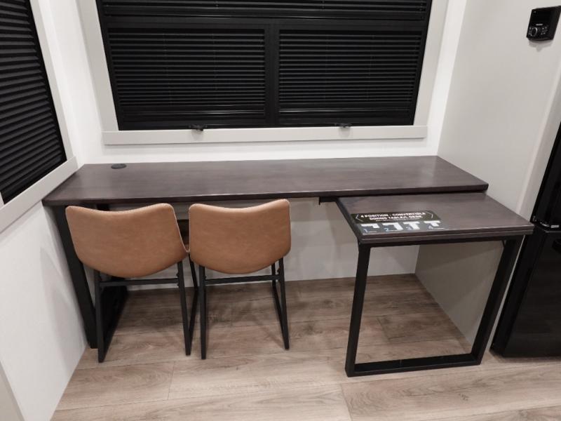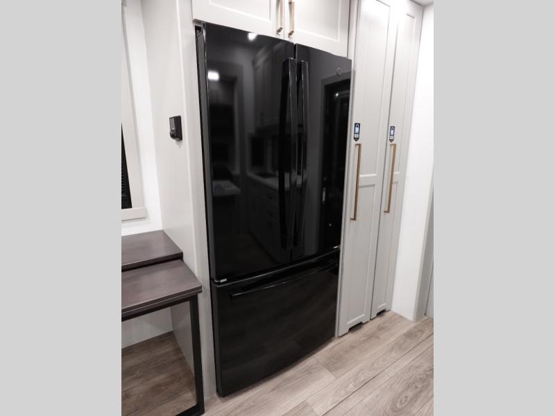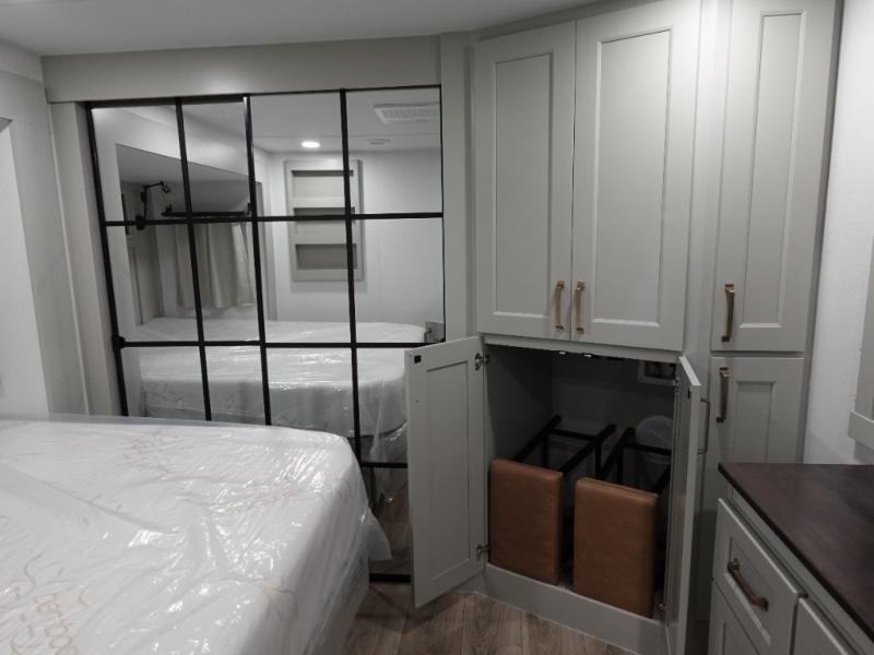 You can't imagine how much this toy hauler has to offer! The garage/outdoor kitchen/office space will allow you to utilize the garage how you need it, plus there is an adjustable tie-down system, as well as a loft for storage and a twin bed to sleep more campers! The garage patio with a 1,500 lb. capacity is another feature you are sure to love, especially with its own awning to keep you protected from the elements. Head to the kitchen to prepare meals with a 24" GE oven with a four burner range, a GE microwave with an air fryer, plus a spacious GE Energy Star 19 cu. ft. refrigerator. The island with two stools will let others visit with you while you cook, and there are even dog bowls to easily feed Frodo. You'll find the convertible dining table/L-desk will be accommodating since it can be use to dine at, and to get some work done. You may just find yourselves spending most of your time on the L-sofa in front of the entertainment center with a TV, fireplace and storage. A full bath is up front by the bedroom, and here you'll find a 30" x 42" shower and and pull-out linen storage with a trash bin to keep towels ready to use. After a day outdoors you'll love nothing more than coming back to your own bedroom with a king bed slide out, TV, a walk-in closet, and many more storage spaces. And we haven't even touched on the exterior features, like the 3-way pass-through storage, three power awnings, an air compressor to fill up tires, and the list goes on and on! This is a pre-production preview, all features and layout placement subject to change.