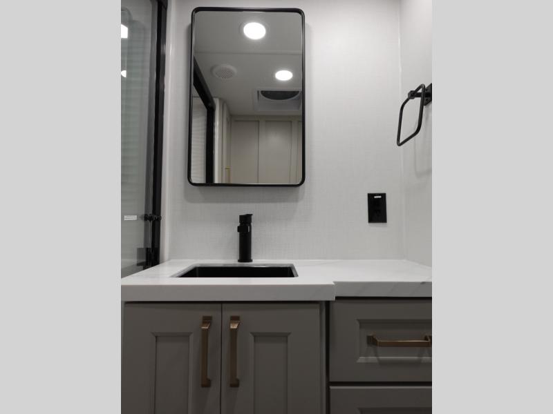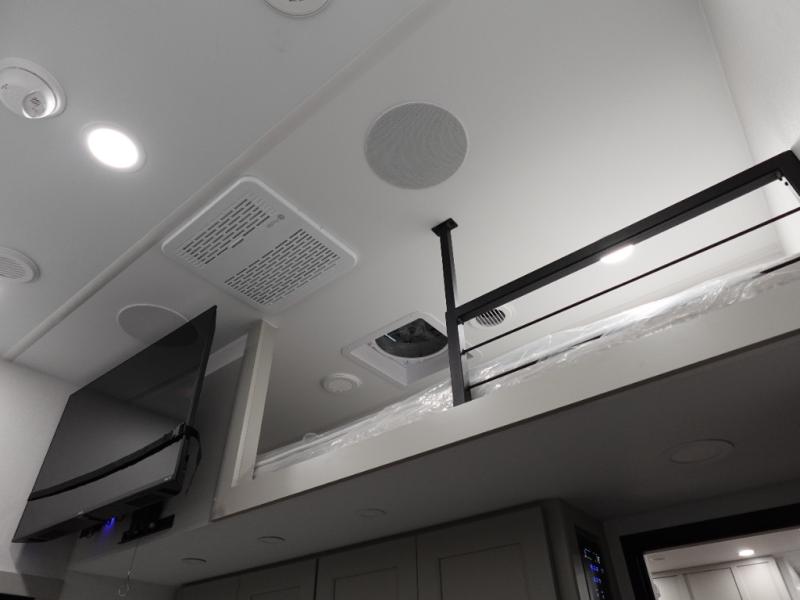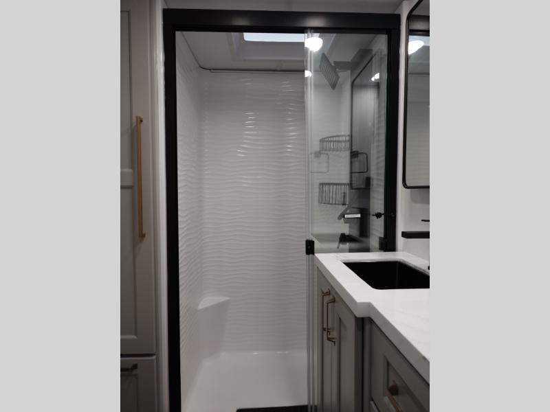 With any Model G toy hauler fifth wheel by Brinkley you will enjoy luxurious amenities, tons of storage space, and innovative features that have been developed and tested in the real world. Durable construction includes an industry leading PDI process, an industry best insulation package, and reinforced and walkable slide roofs. Some of the exterior features you'll find are a 3-way pass-through with a multi-functional flip-up bulkhead wall, under I-beam storage, a MAX-Vision reverse lighting system, and a low-maintenance roof to name a few. A Rockford Fosgate audio system comes standard, along with a Full app-based coach control system (iOS & Android) that lets you control your fifth wheel's functions right from your mobile device. You will find the solar system with a designated storage area to be ultra convenient, plus there is a FlexPower 5500 with a dual fuel inverter generator for all your power needs. Head inside to find a residential interior with Brinkley's CraftSense wood trim construction, floating entrance steps, integrated window screens and insulated blackout blinds, and residential solid surface countertops plus backsplash. You will also enjoy the neon shower lighting and recessed medicine cabinets in the bath, plus motion activated LED bed lights and dual bedside outlets in the bedroom. Choose a Model G toy hauler fifth wheel to experience all the luxury it has to offer!