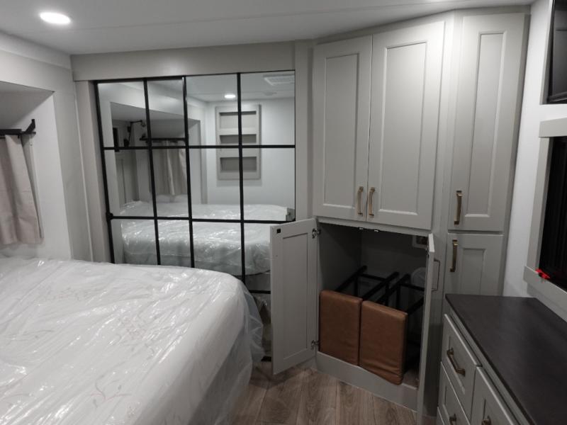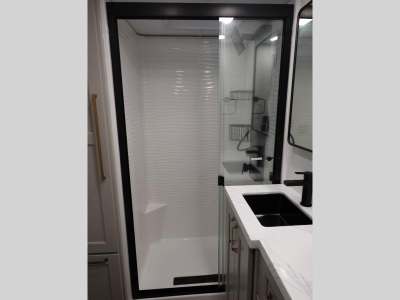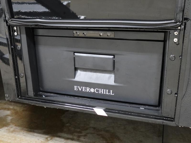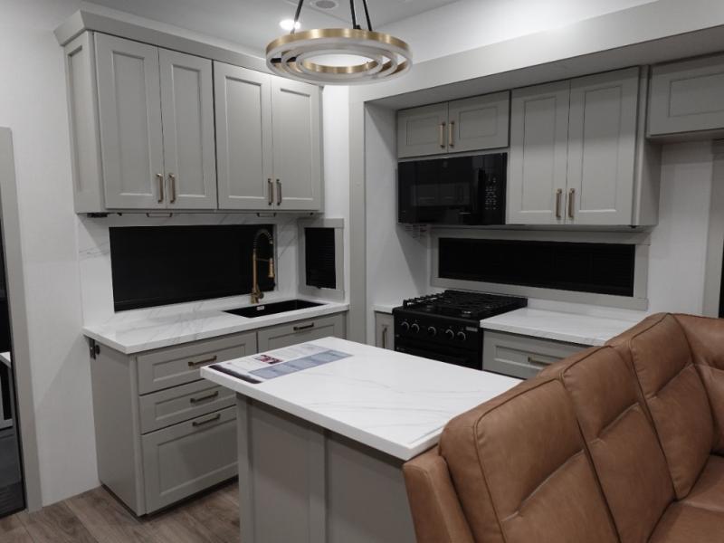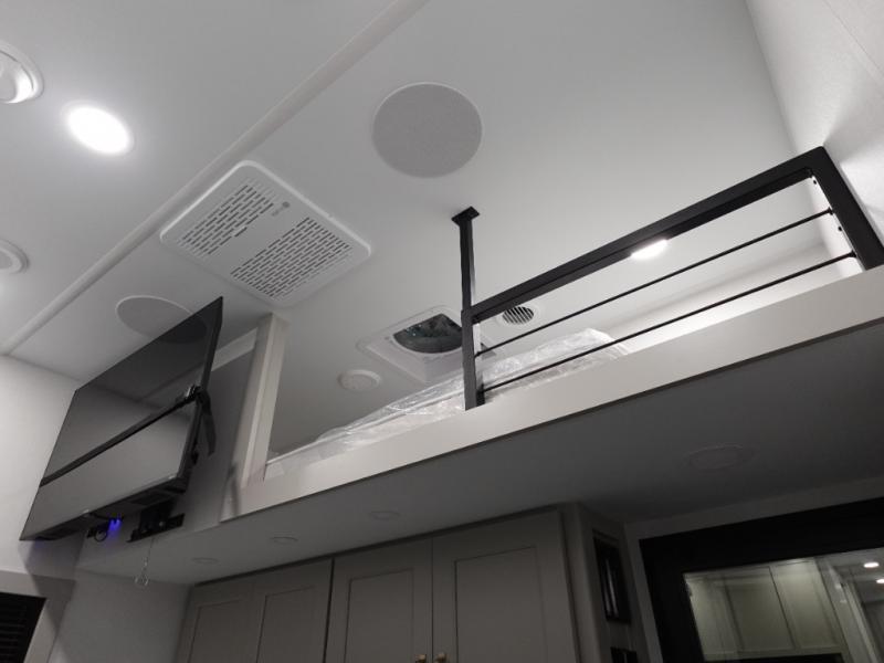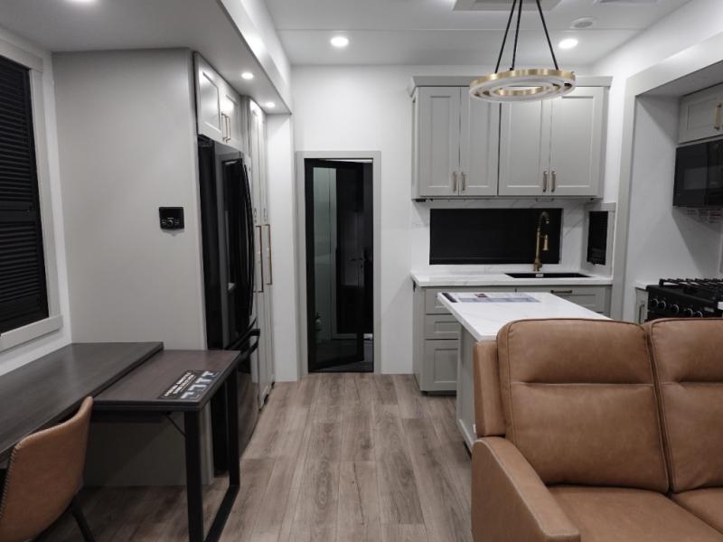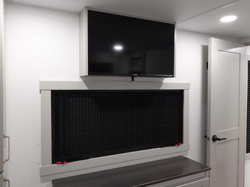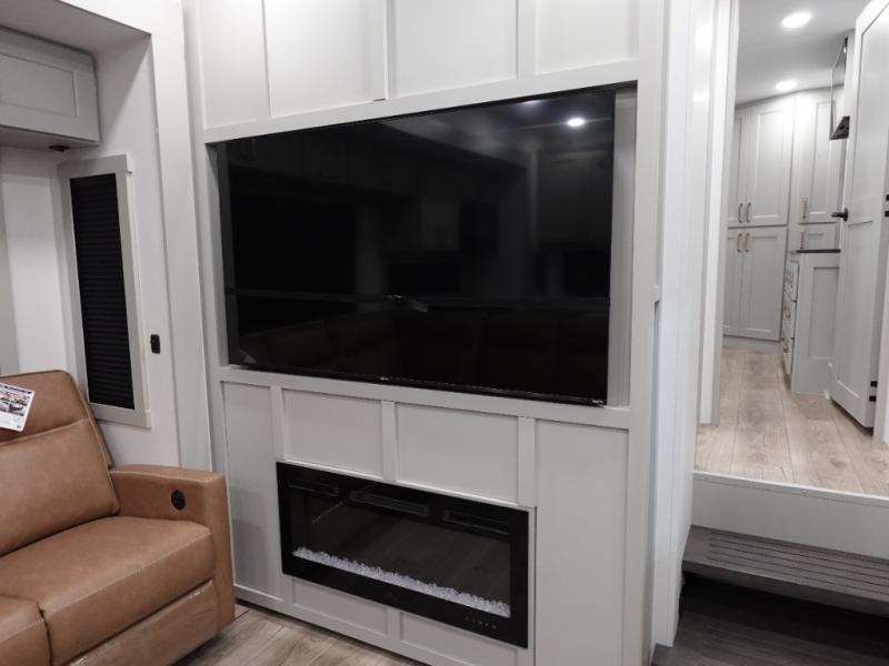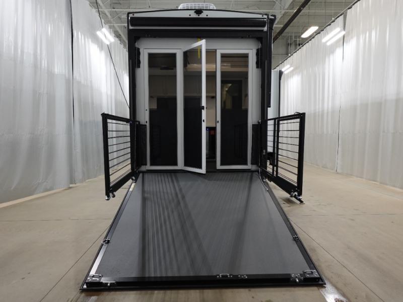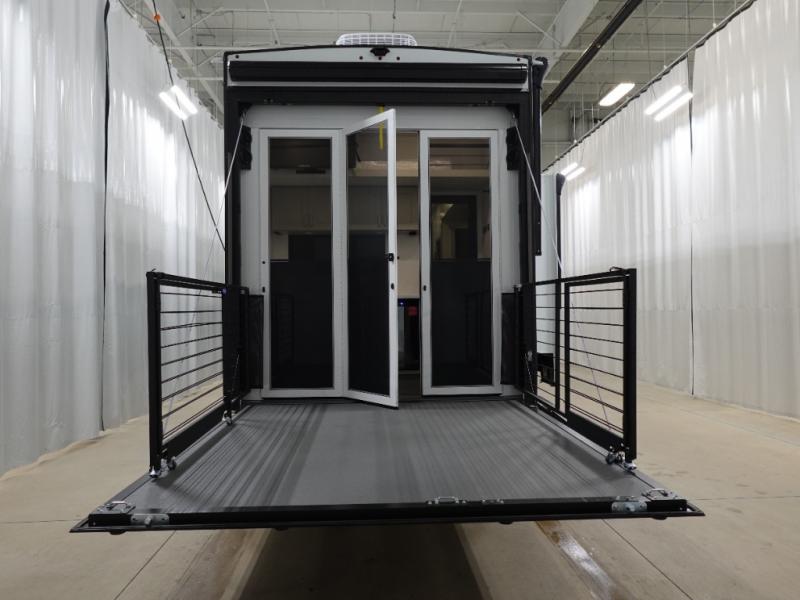 You can't imagine how much this toy hauler has to offer! The garage/outdoor kitchen/office space will allow you to utilize the garage how you need it, plus there is an adjustable tie-down system, as well as a loft for storage and a twin bed to sleep more campers! The garage patio with a 1,500 lb. capacity is another feature you are sure to love, especially with its own awning to keep you protected from the elements. Head to the kitchen to prepare meals with a 24" GE oven with a four burner range, a GE microwave with an air fryer, plus a spacious GE Energy Star 19 cu. ft. refrigerator. The island with two stools will let others visit with you while you cook, and there are even dog bowls to easily feed Frodo. You'll find the convertible dining table/L-desk will be accommodating since it can be use to dine at, and to get some work done. You may just find yourselves spending most of your time on the L-sofa in front of the entertainment center with a TV, fireplace and storage. A full bath is up front by the bedroom, and here you'll find a 30" x 42" shower and and pull-out linen storage with a trash bin to keep towels ready to use. After a day outdoors you'll love nothing more than coming back to your own bedroom with a king bed slide out, TV, a walk-in closet, and many more storage spaces. And we haven't even touched on the exterior features, like the 3-way pass-through storage, three power awnings, an air compressor to fill up tires, and the list goes on and on! This is a pre-production preview, all features and layout placement subject to change.