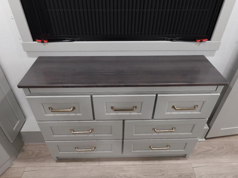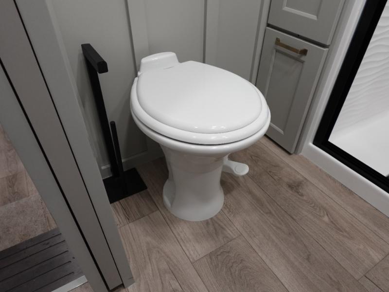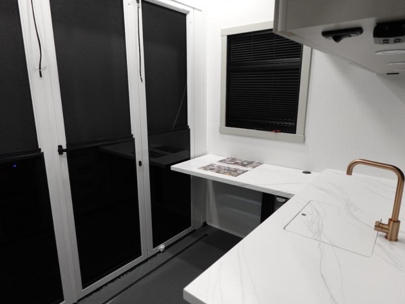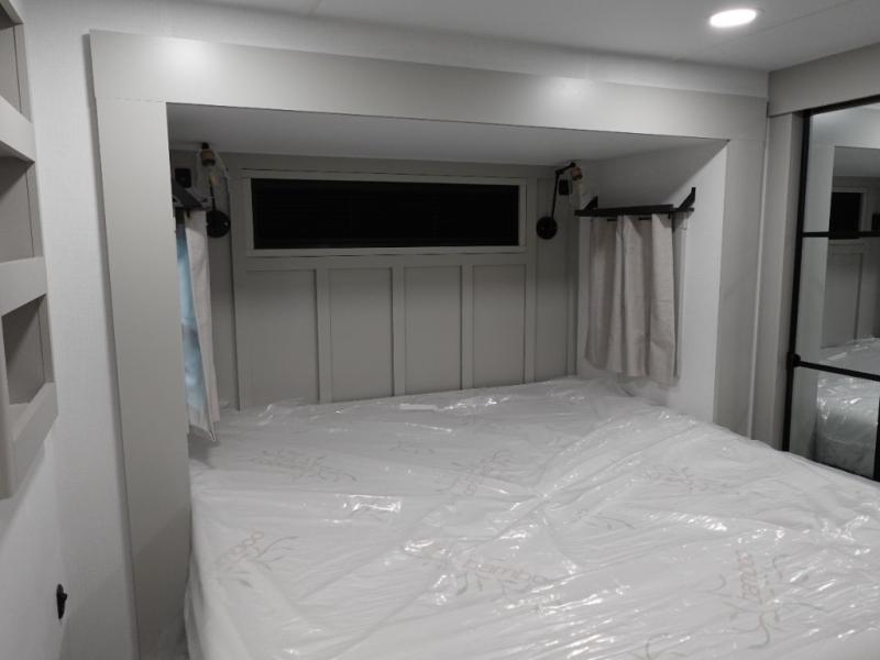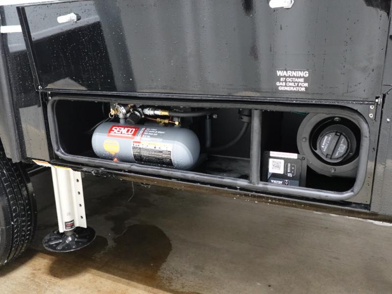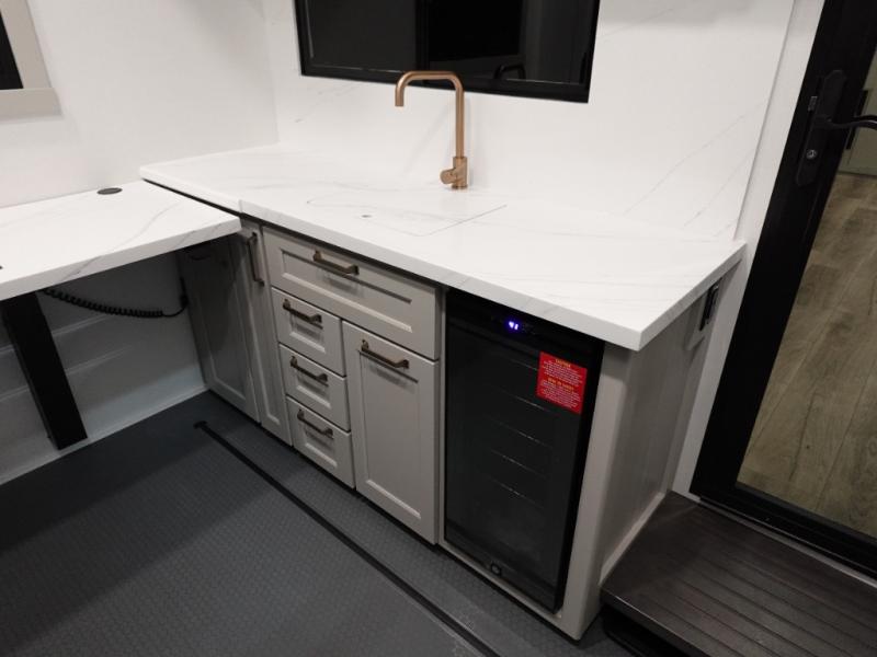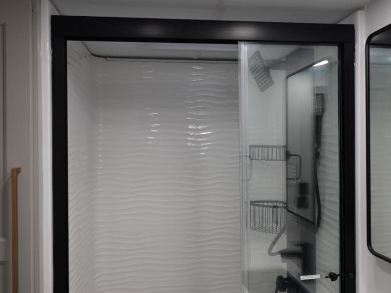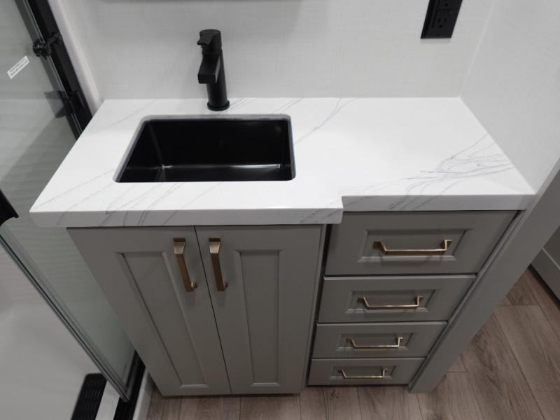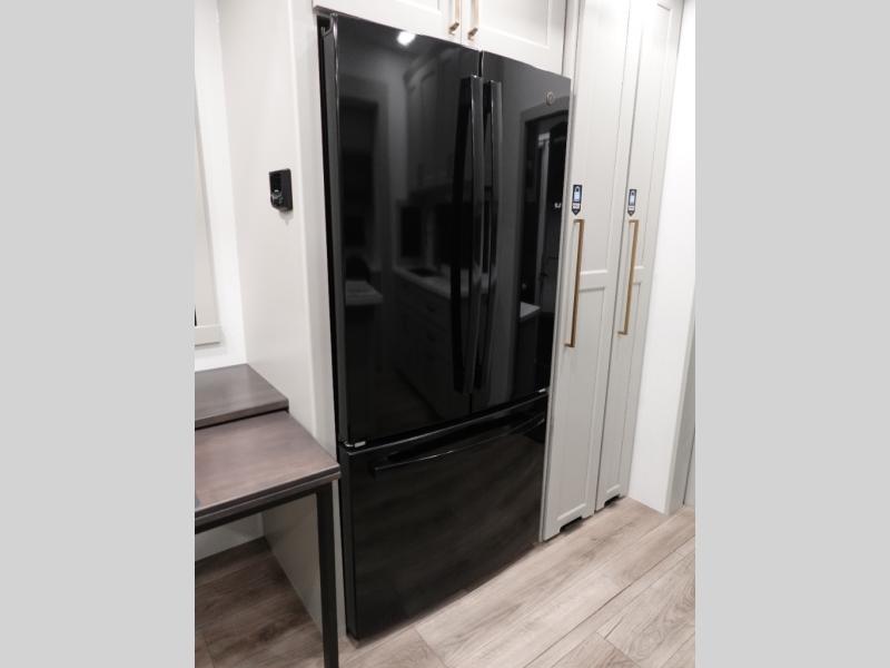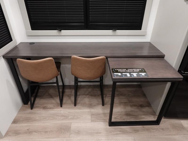 You can't imagine how much this toy hauler has to offer! The garage/outdoor kitchen/office space will allow you to utilize the garage how you need it, plus there is an adjustable tie-down system, as well as a loft for storage and a twin bed to sleep more campers! The garage patio with a 1,500 lb. capacity is another feature you are sure to love, especially with its own awning to keep you protected from the elements. Head to the kitchen to prepare meals with a 24" GE oven with a four burner range, a GE microwave with an air fryer, plus a spacious GE Energy Star 19 cu. ft. refrigerator. The island with two stools will let others visit with you while you cook, and there are even dog bowls to easily feed Frodo. You'll find the convertible dining table/L-desk will be accommodating since it can be use to dine at, and to get some work done. You may just find yourselves spending most of your time on the L-sofa in front of the entertainment center with a TV, fireplace and storage. A full bath is up front by the bedroom, and here you'll find a 30" x 42" shower and and pull-out linen storage with a trash bin to keep towels ready to use. After a day outdoors you'll love nothing more than coming back to your own bedroom with a king bed slide out, TV, a walk-in closet, and many more storage spaces. And we haven't even touched on the exterior features, like the 3-way pass-through storage, three power awnings, an air compressor to fill up tires, and the list goes on and on! This is a pre-production preview, all features and layout placement subject to change.
