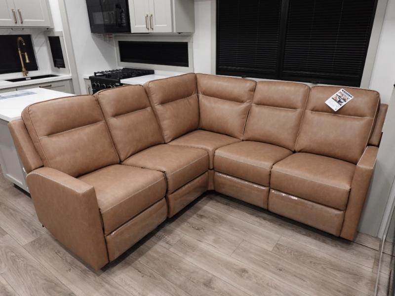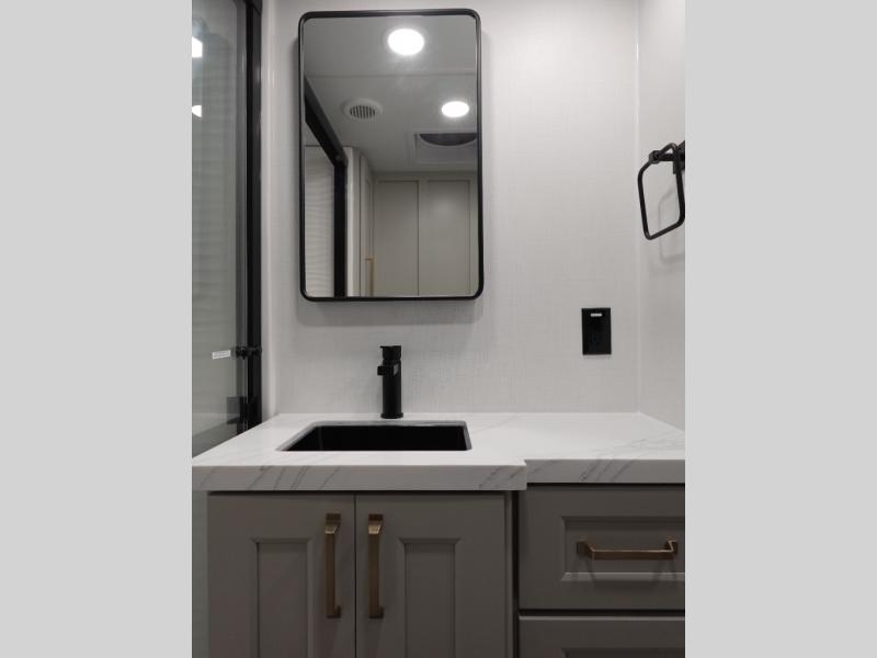 With any Model G toy hauler fifth wheel by Brinkley you will enjoy luxurious amenities, tons of storage space, and innovative features that have been developed and tested in the real world. Durable construction includes an industry leading PDI process, an industry best insulation package, and reinforced and walkable slide roofs. Some of the exterior features you'll find are a 3-way pass-through with a multi-functional flip-up bulkhead wall, under I-beam storage, a MAX-Vision reverse lighting system, and a low-maintenance roof to name a few. A Rockford Fosgate audio system comes standard, along with a Full app-based coach control system (iOS & Android) that lets you control your fifth wheel's functions right from your mobile device. You will find the solar system with a designated storage area to be ultra convenient, plus there is a FlexPower 5500 with a dual fuel inverter generator for all your power needs. Head inside to find a residential interior with Brinkley's CraftSense wood trim construction, floating entrance steps, integrated window screens and insulated blackout blinds, and residential solid surface countertops plus backsplash. You will also enjoy the neon shower lighting and recessed medicine cabinets in the bath, plus motion activated LED bed lights and dual bedside outlets in the bedroom. Choose a Model G toy hauler fifth wheel to experience all the luxury it has to offer!
