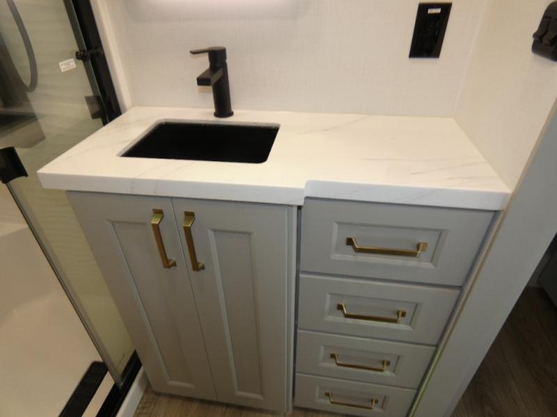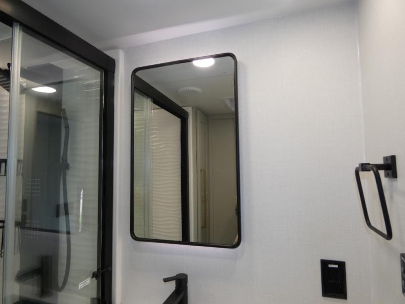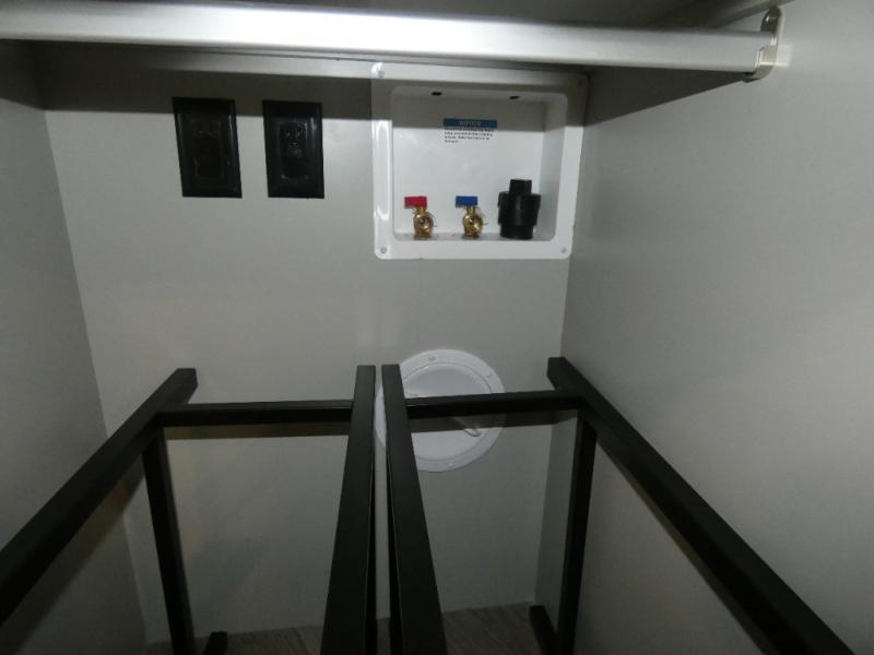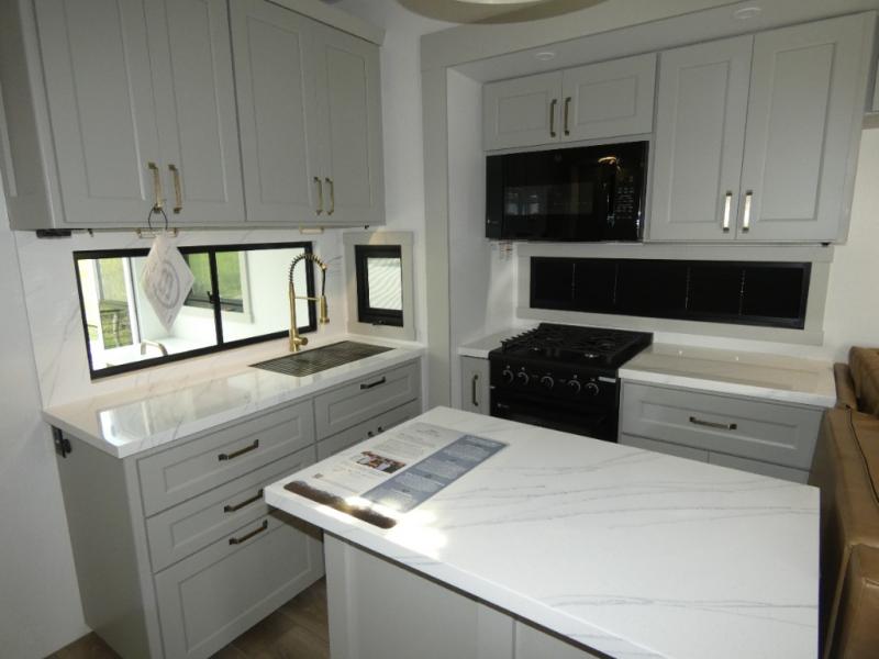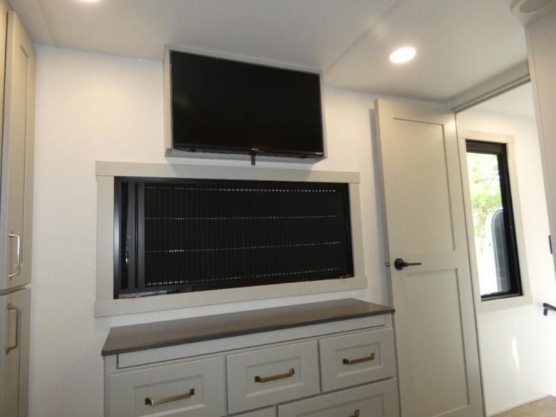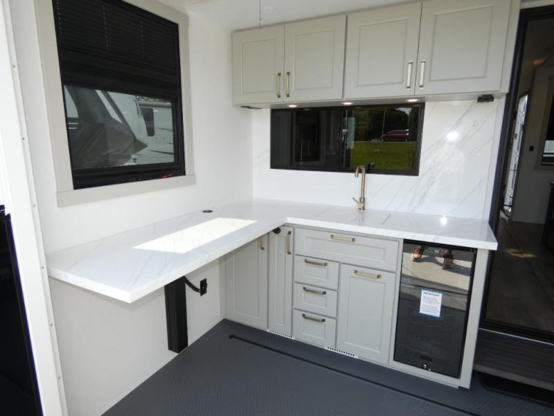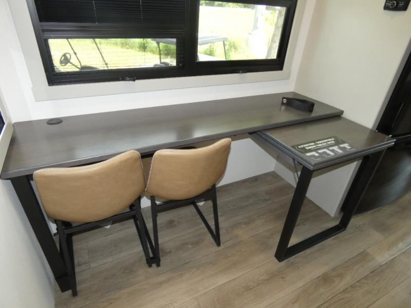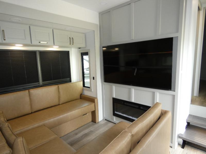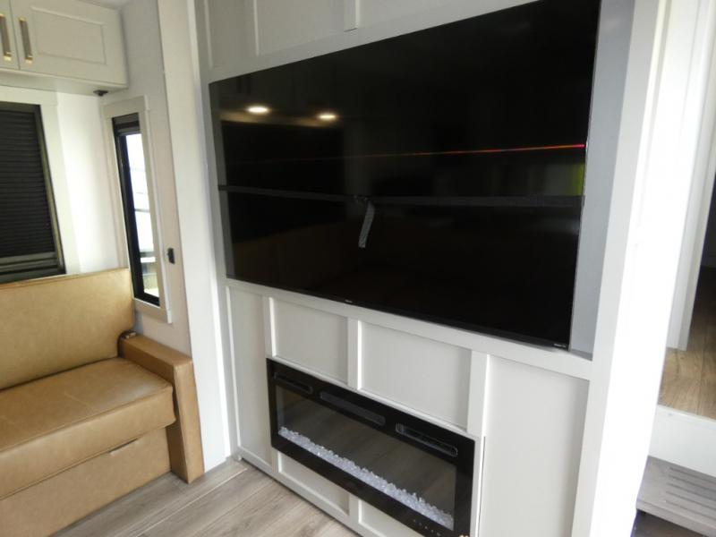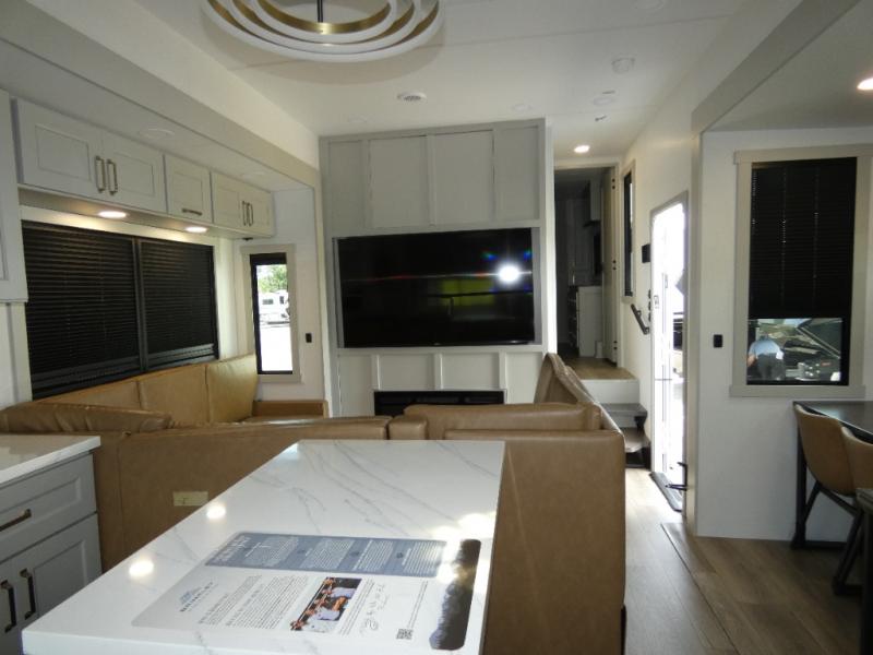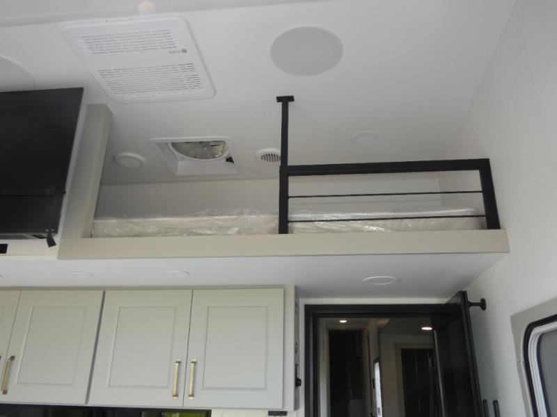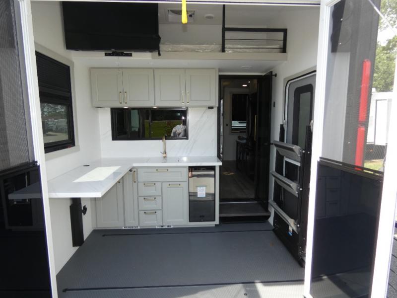 You can't imagine how much this toy hauler has to offer! The garage/outdoor kitchen/office space will allow you to utilize the garage how you need it, plus there is an adjustable tie-down system, as well as a loft for storage and a twin bed to sleep more campers! The garage patio with a 1,500 lb. capacity is another feature you are sure to love, especially with its own awning to keep you protected from the elements. Head to the kitchen to prepare meals with a 24" GE oven with a four burner range, a GE microwave with an air fryer, plus a spacious GE Energy Star 19 cu. ft. refrigerator. The island with two stools will let others visit with you while you cook, and there are even dog bowls to easily feed Frodo. You'll find the convertible dining table/L-desk will be accommodating since it can be use to dine at, and to get some work done. You may just find yourselves spending most of your time on the U-sofa in front of the entertainment center with a TV, fireplace and storage. A full bath is up front by the bedroom, and here you'll find a 30" x 43" shower and and pull-out linen storage with a trash bin to keep towels ready to use. After a day outdoors you'll love nothing more than coming back to your own bedroom with a king bed slide out, TV, a walk-in closet, and many more storage spaces. And we haven't even touched on the exterior features, like the 3-way pass-through storage, three power awnings, an air compressor to fill up tires, and the list goes on and on! This is a pre-production preview, all features and layout placement subject to change.