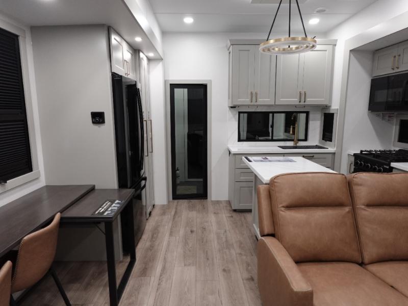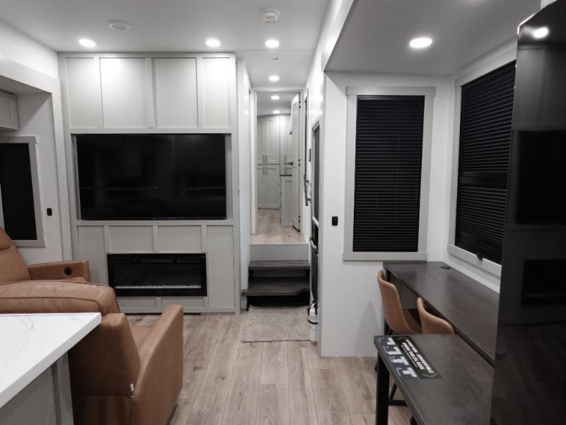 You can't imagine how much this toy hauler has to offer! The garage/outdoor kitchen/office space will allow you to utilize the garage how you need it, plus there is an adjustable tie-down system, as well as a loft for storage and a twin bed to sleep more campers! The garage patio with a 1,500 lb. capacity is another feature you are sure to love, especially with its own awning to keep you protected from the elements. Head to the kitchen to prepare meals with a 24" GE oven with a four burner range, a GE microwave with an air fryer, plus a spacious GE Energy Star 19 cu. ft. refrigerator. The island with two stools will let others visit with you while you cook, and there are even dog bowls to easily feed Frodo. You'll find the convertible dining table/L-desk will be accommodating since it can be use to dine at, and to get some work done. You may just find yourselves spending most of your time on the L-sofa in front of the entertainment center with a TV, fireplace and storage. A full bath is up front by the bedroom, and here you'll find a 30" x 42" shower and and pull-out linen storage with a trash bin to keep towels ready to use. After a day outdoors you'll love nothing more than coming back to your own bedroom with a king bed slide out, TV, a walk-in closet, and many more storage spaces. And we haven't even touched on the exterior features, like the 3-way pass-through storage, three power awnings, an air compressor to fill up tires, and the list goes on and on! This is a pre-production preview, all features and layout placement subject to change.