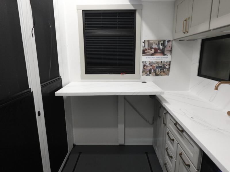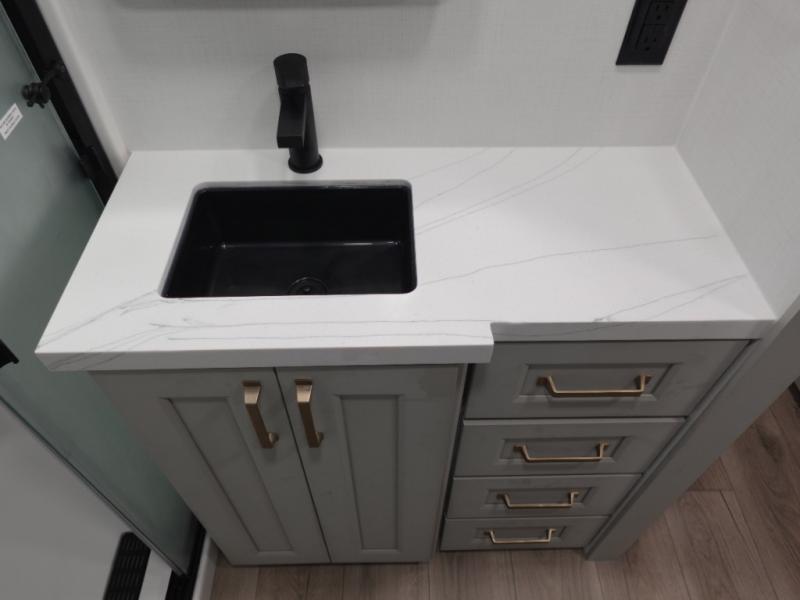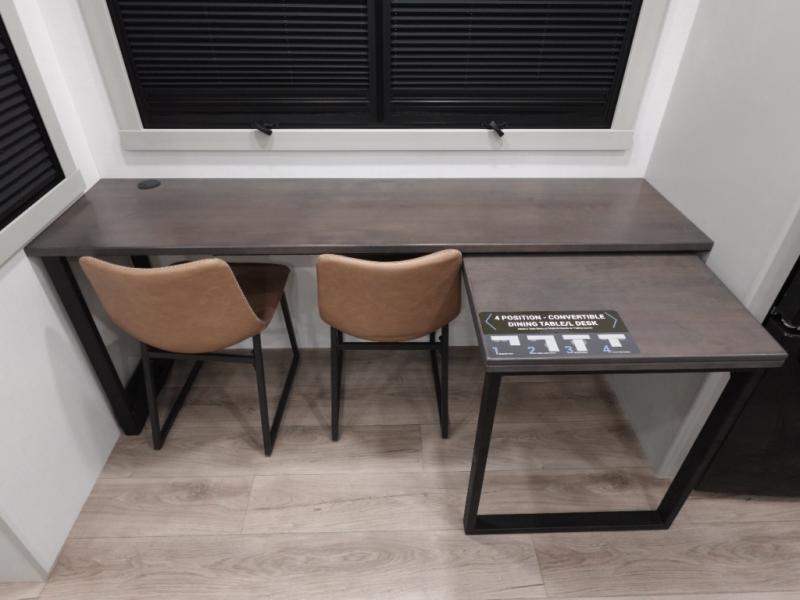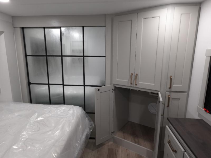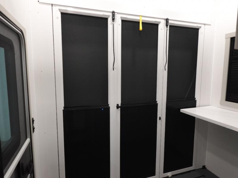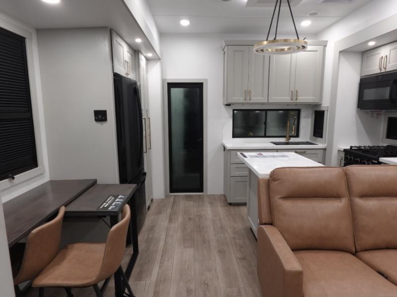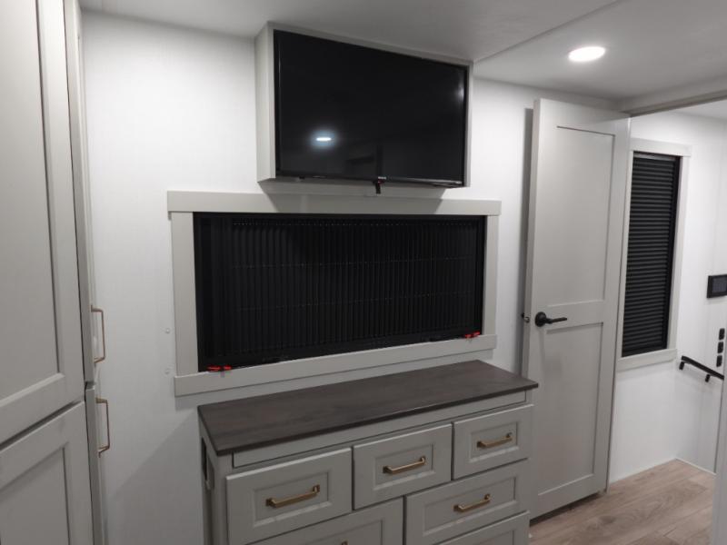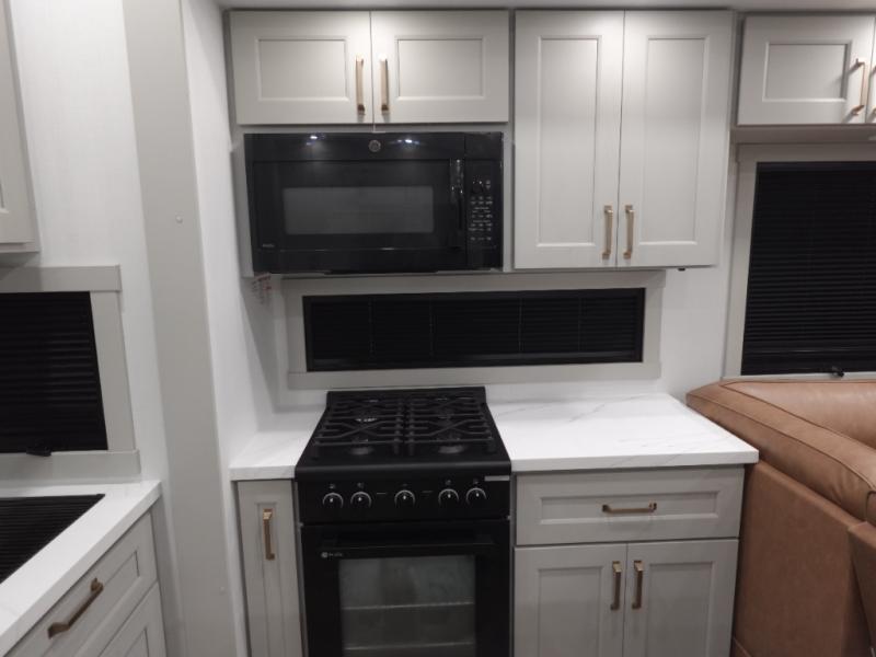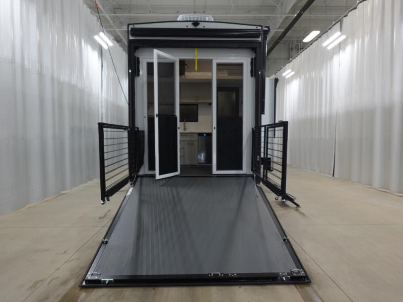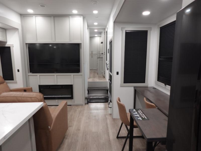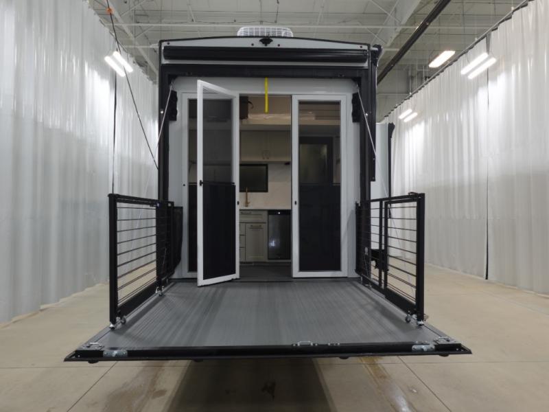 You can't imagine how much this toy hauler has to offer! The garage/outdoor kitchen/office space will allow you to utilize the garage how you need it, plus there is an adjustable tie-down system, as well as a loft for storage and a twin bed to sleep more campers! The garage patio with a 1,500 lb. capacity is another feature you are sure to love, especially with its own awning to keep you protected from the elements. Head to the kitchen to prepare meals with a 24" GE oven with a four burner range, a GE microwave with an air fryer, plus a spacious GE Energy Star 19 cu. ft. refrigerator. The island with two stools will let others visit with you while you cook, and there are even dog bowls to easily feed Frodo. You'll find the convertible dining table/L-desk will be accommodating since it can be use to dine at, and to get some work done. You may just find yourselves spending most of your time on the L-sofa in front of the entertainment center with a TV, fireplace and storage. A full bath is up front by the bedroom, and here you'll find a 30" x 42" shower and and pull-out linen storage with a trash bin to keep towels ready to use. After a day outdoors you'll love nothing more than coming back to your own bedroom with a king bed slide out, TV, a walk-in closet, and many more storage spaces. And we haven't even touched on the exterior features, like the 3-way pass-through storage, three power awnings, an air compressor to fill up tires, and the list goes on and on! This is a pre-production preview, all features and layout placement subject to change.
