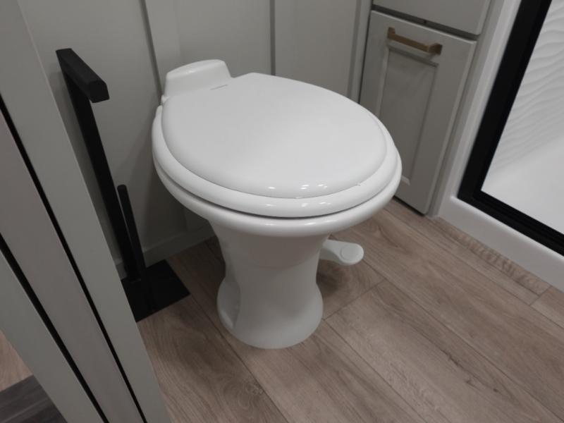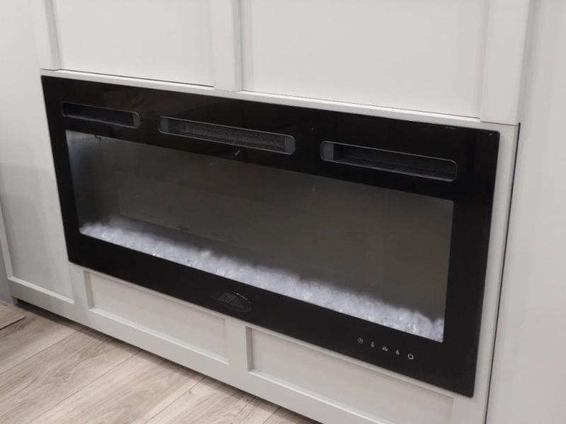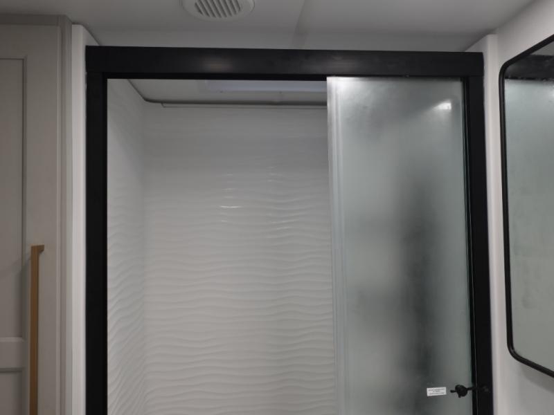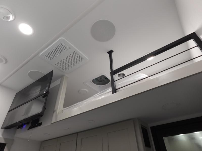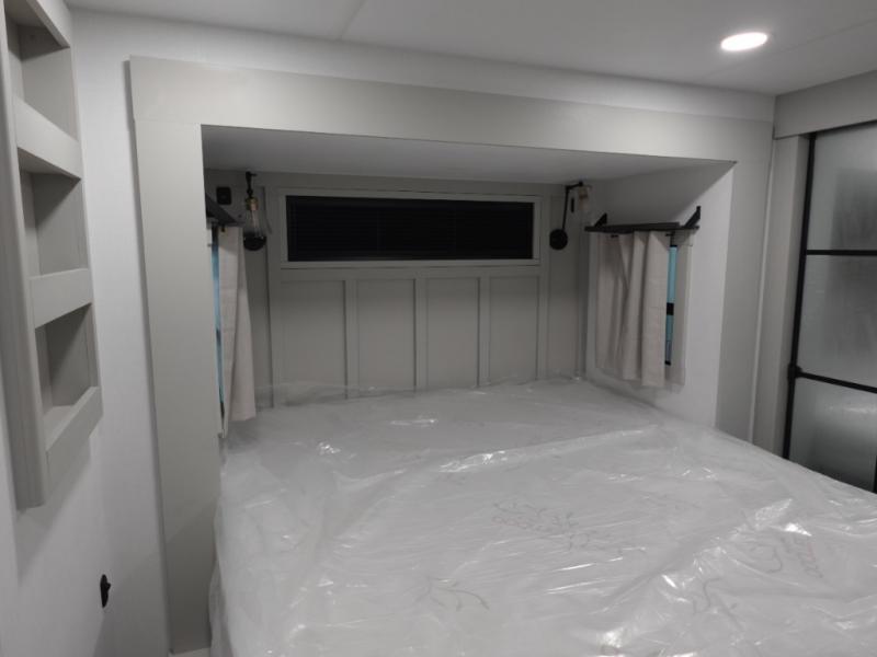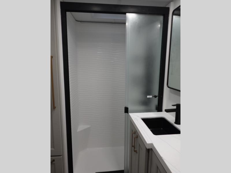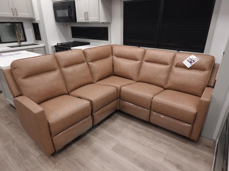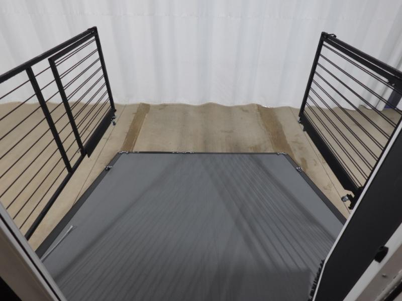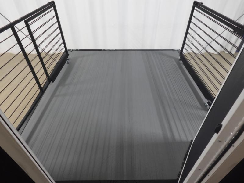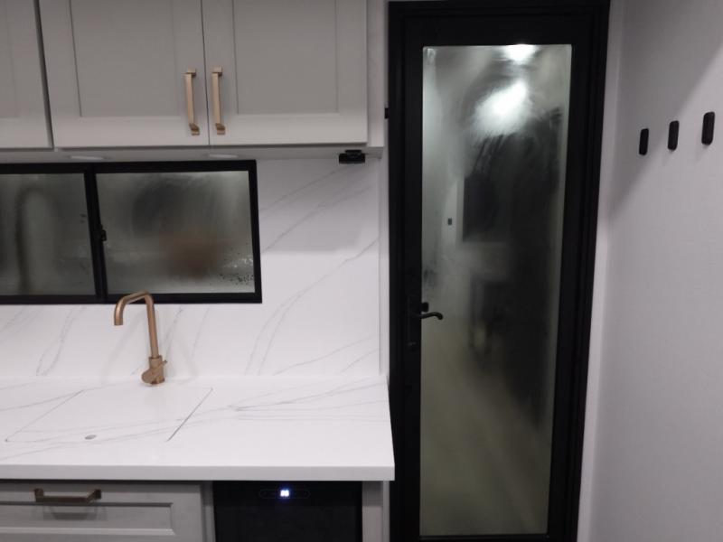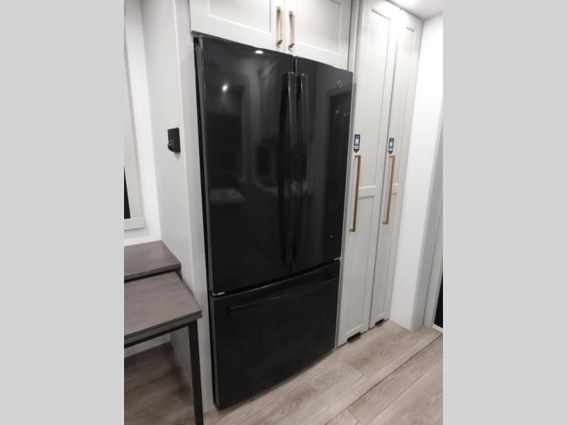 You can't imagine how much this toy hauler has to offer! The garage/outdoor kitchen/office space will allow you to utilize the garage how you need it, plus there is an adjustable tie-down system, as well as a loft for storage and a twin bed to sleep more campers! The garage patio with a 1,500 lb. capacity is another feature you are sure to love, especially with its own awning to keep you protected from the elements. Head to the kitchen to prepare meals with a 24" GE oven with a four burner range, a GE microwave with an air fryer, plus a spacious GE Energy Star 19 cu. ft. refrigerator. The island with two stools will let others visit with you while you cook, and there are even dog bowls to easily feed Frodo. You'll find the convertible dining table/L-desk will be accommodating since it can be use to dine at, and to get some work done. You may just find yourselves spending most of your time on the L-sofa in front of the entertainment center with a TV, fireplace and storage. A full bath is up front by the bedroom, and here you'll find a 30" x 42" shower and and pull-out linen storage with a trash bin to keep towels ready to use. After a day outdoors you'll love nothing more than coming back to your own bedroom with a king bed slide out, TV, a walk-in closet, and many more storage spaces. And we haven't even touched on the exterior features, like the 3-way pass-through storage, three power awnings, an air compressor to fill up tires, and the list goes on and on! This is a pre-production preview, all features and layout placement subject to change.