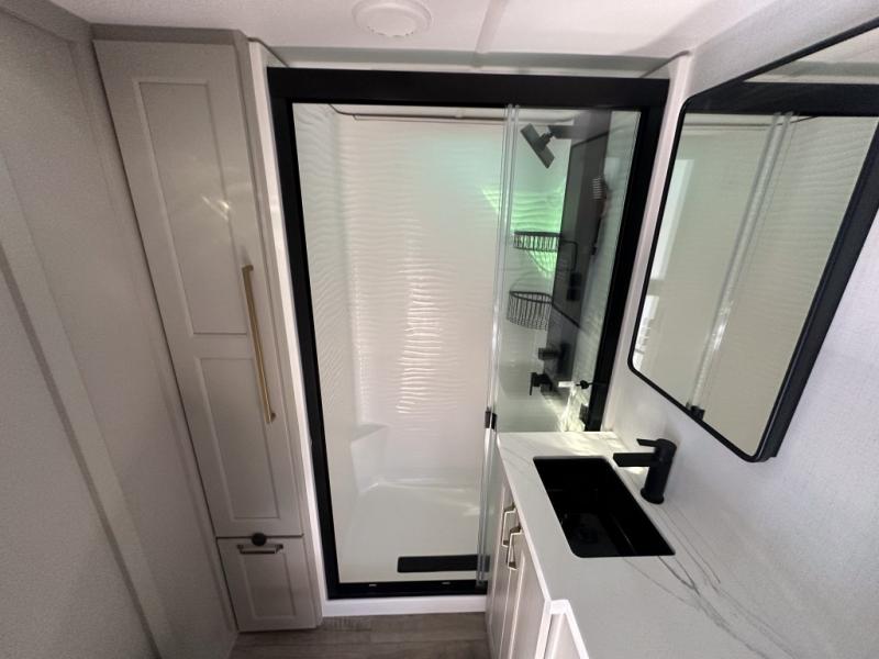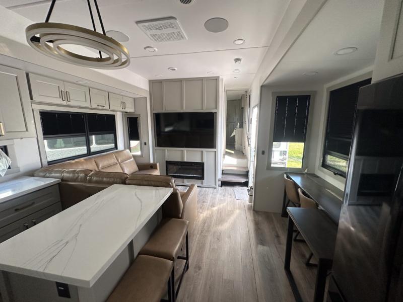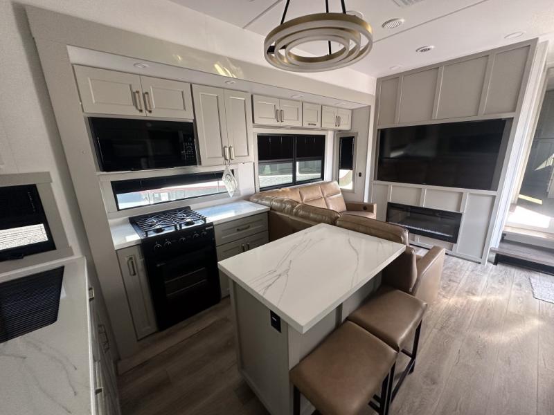 You can't imagine how much this toy hauler has to offer! The garage/outdoor kitchen/office space will allow you to utilize the garage how you need it, plus there is an adjustable tie-down system, as well as a loft for storage and a twin bed to sleep more campers! The garage patio with a 1,500 lb. capacity is another feature you are sure to love, especially with its own awning to keep you protected from the elements. Head to the kitchen to prepare meals with a 24" GE oven with a four burner range, a GE microwave with an air fryer, plus a spacious GE Energy Star 19 cu. ft. refrigerator. The island with two stools will let others visit with you while you cook, and there are even dog bowls to easily feed Frodo. You'll find the convertible dining table/L-desk will be accommodating since it can be use to dine at, and to get some work done. You may just find yourselves spending most of your time on the L-sofa in front of the entertainment center with a TV, fireplace and storage. A full bath is up front by the bedroom, and here you'll find a 30" x 42" shower and and pull-out linen storage with a trash bin to keep towels ready to use. After a day outdoors you'll love nothing more than coming back to your own bedroom with a king bed slide out, TV, a walk-in closet, and many more storage spaces. And we haven't even touched on the exterior features, like the 3-way pass-through storage, three power awnings, an air compressor to fill up tires, and the list goes on and on! This is a pre-production preview, all features and layout placement subject to change.