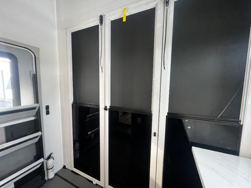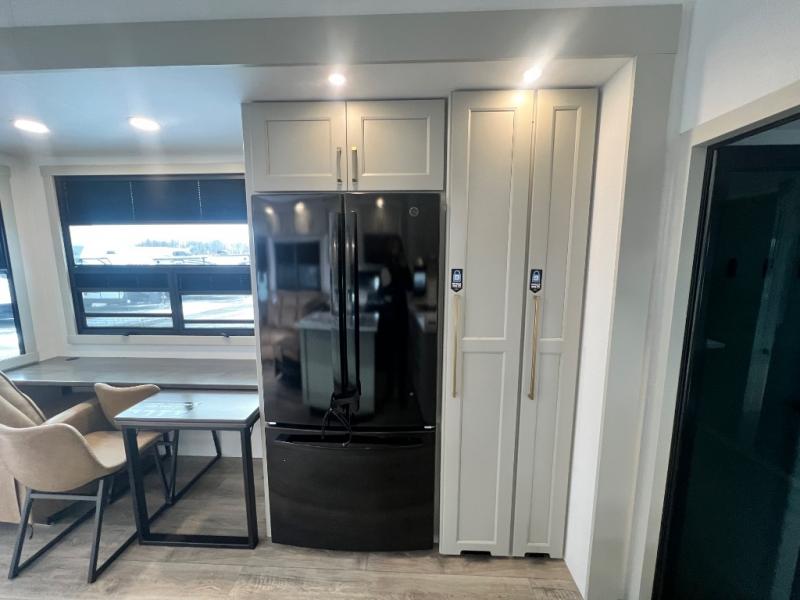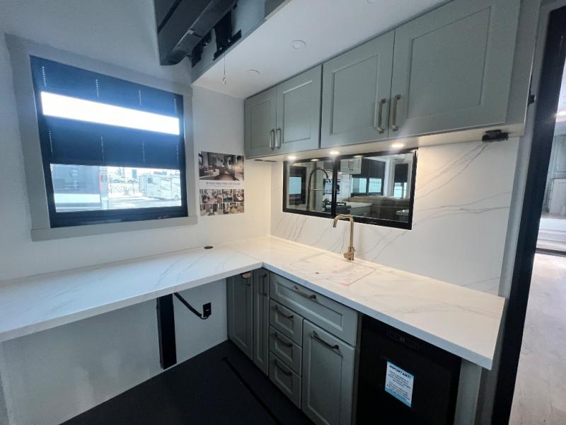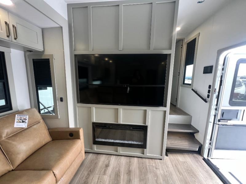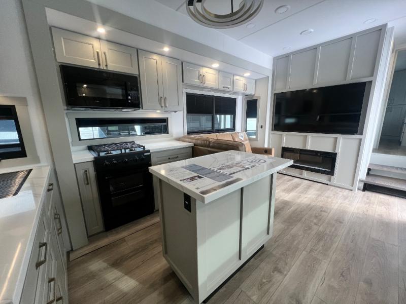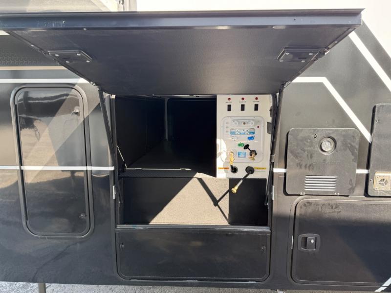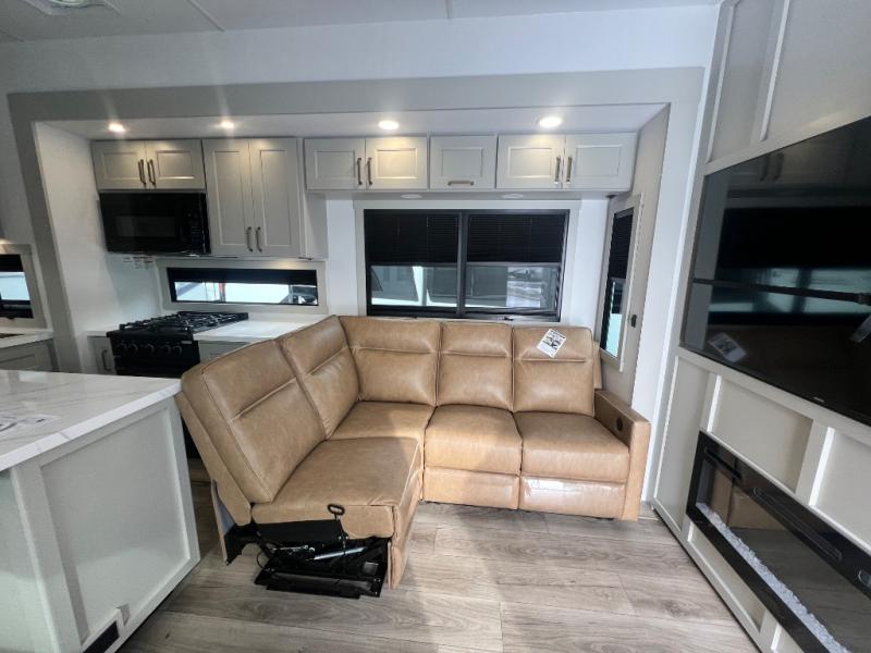 You can't imagine how much this toy hauler has to offer! The garage/outdoor kitchen/office space will allow you to utilize the garage how you need it, plus there is an adjustable tie-down system, as well as a loft for storage and a twin bed to sleep more campers! The garage patio with a 1,500 lb. capacity is another feature you are sure to love, especially with its own awning to keep you protected from the elements. Head to the kitchen to prepare meals with a 24" GE oven with a four burner range, a GE microwave with an air fryer, plus a spacious GE Energy Star 19 cu. ft. refrigerator. The island with two stools will let others visit with you while you cook, and there are even dog bowls to easily feed Frodo. You'll find the convertible dining table/L-desk will be accommodating since it can be use to dine at, and to get some work done. You may just find yourselves spending most of your time on the L-sofa in front of the entertainment center with a TV, fireplace and storage. A full bath is up front by the bedroom, and here you'll find a 30" x 42" shower and and pull-out linen storage with a trash bin to keep towels ready to use. After a day outdoors you'll love nothing more than coming back to your own bedroom with a king bed slide out, TV, a walk-in closet, and many more storage spaces. And we haven't even touched on the exterior features, like the 3-way pass-through storage, three power awnings, an air compressor to fill up tires, and the list goes on and on! This is a pre-production preview, all features and layout placement subject to change.