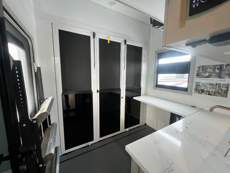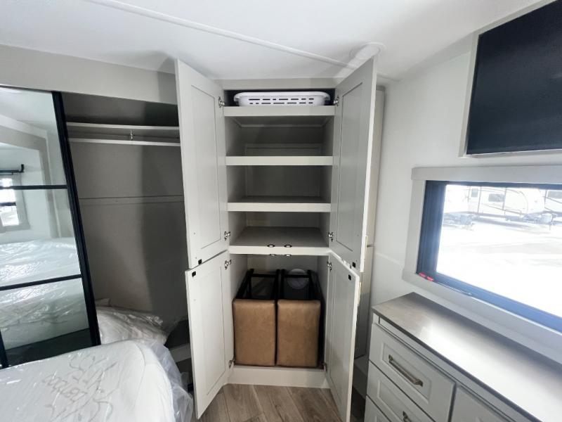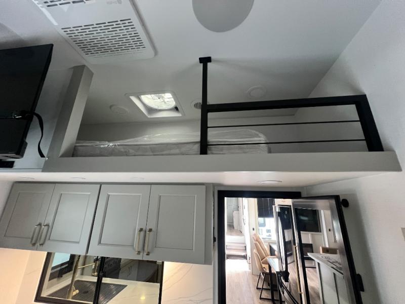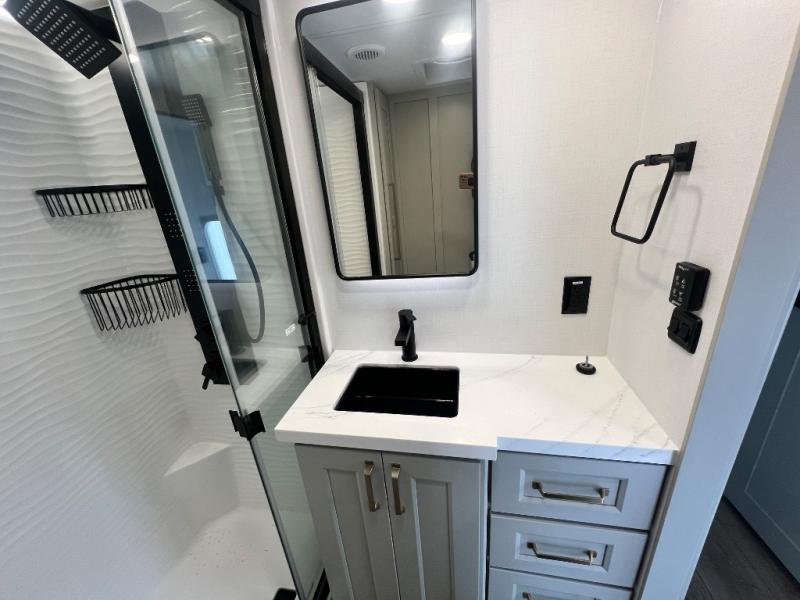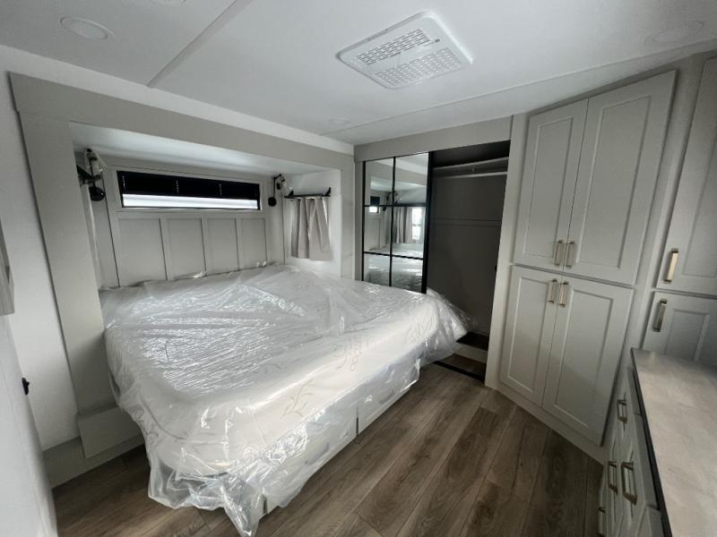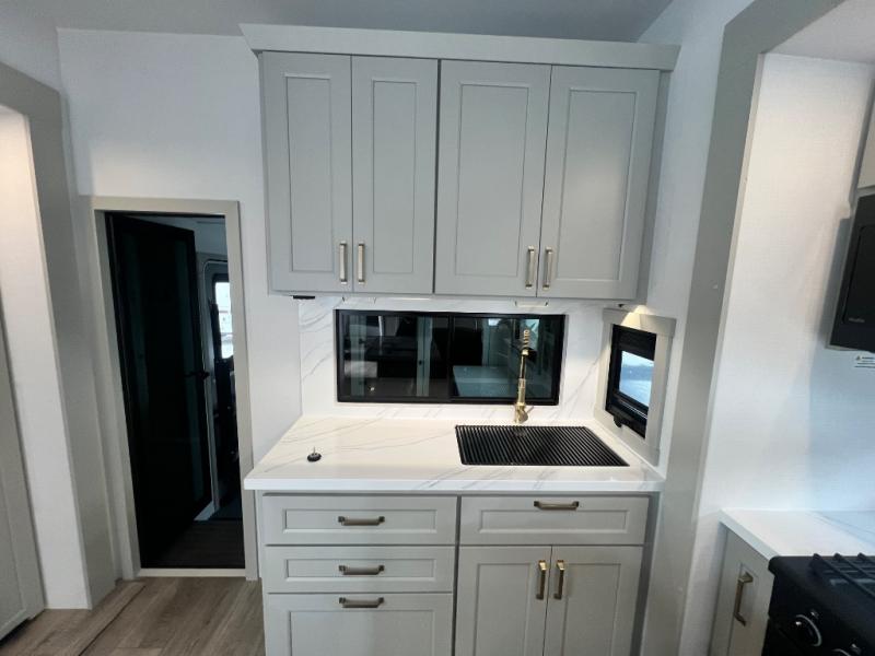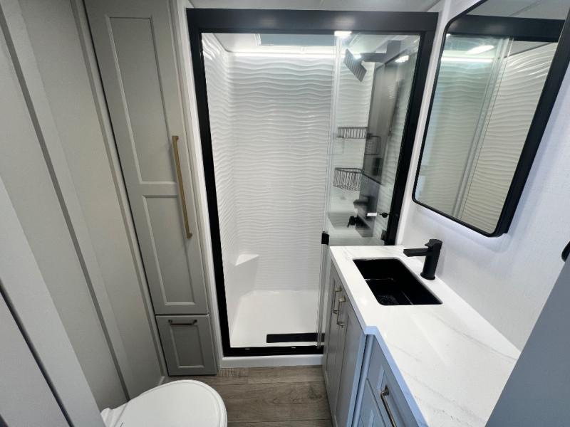 You can't imagine how much this toy hauler has to offer! The garage/outdoor kitchen/office space will allow you to utilize the garage how you need it, plus there is an adjustable tie-down system, as well as a loft for storage and a twin bed to sleep more campers! The garage patio with a 1,500 lb. capacity is another feature you are sure to love, especially with its own awning to keep you protected from the elements. Head to the kitchen to prepare meals with a 24" GE oven with a four burner range, a GE microwave with an air fryer, plus a spacious GE Energy Star 19 cu. ft. refrigerator. The island with two stools will let others visit with you while you cook, and there are even dog bowls to easily feed Frodo. You'll find the convertible dining table/L-desk will be accommodating since it can be use to dine at, and to get some work done. You may just find yourselves spending most of your time on the L-sofa in front of the entertainment center with a TV, fireplace and storage. A full bath is up front by the bedroom, and here you'll find a 30" x 42" shower and and pull-out linen storage with a trash bin to keep towels ready to use. After a day outdoors you'll love nothing more than coming back to your own bedroom with a king bed slide out, TV, a walk-in closet, and many more storage spaces. And we haven't even touched on the exterior features, like the 3-way pass-through storage, three power awnings, an air compressor to fill up tires, and the list goes on and on! This is a pre-production preview, all features and layout placement subject to change.