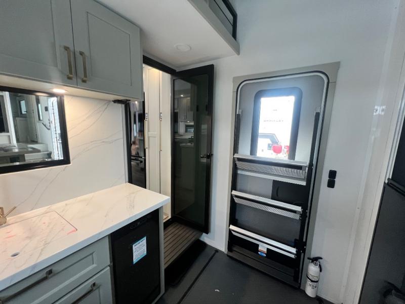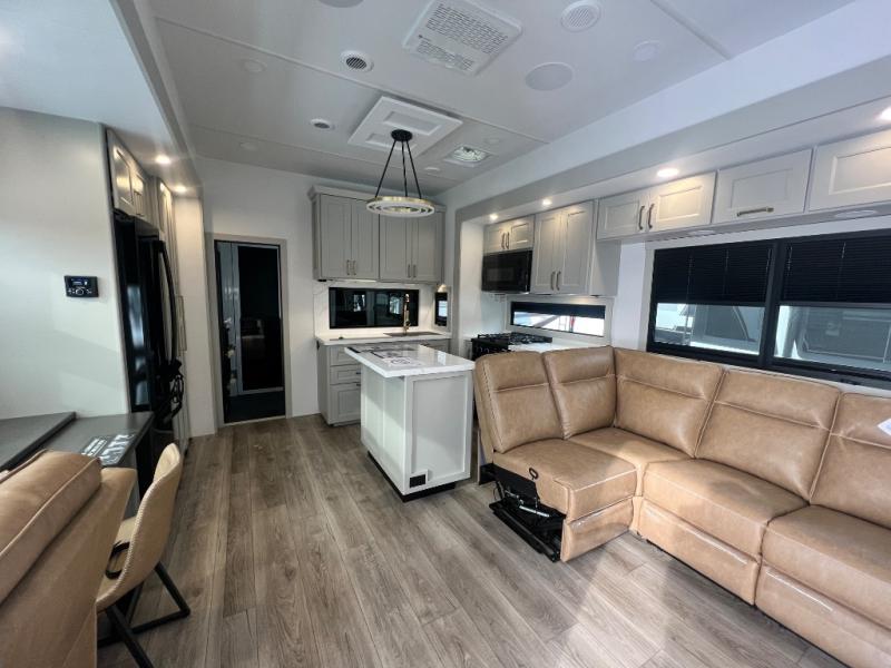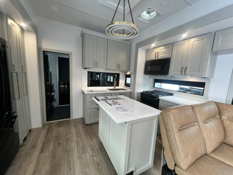 With any Model G toy hauler fifth wheel by Brinkley you will enjoy luxurious amenities, tons of storage space, and innovative features that have been developed and tested in the real world. Durable construction includes an industry leading PDI process, an industry best insulation package, and reinforced and walkable slide roofs. Some of the exterior features you'll find are a 3-way pass-through with a multi-functional flip-up bulkhead wall, under I-beam storage, a MAX-Vision reverse lighting system, and a low-maintenance roof to name a few. A Rockford Fosgate audio system comes standard, along with a Full app-based coach control system (iOS & Android) that lets you control your fifth wheel's functions right from your mobile device. You will find the solar system with a designated storage area to be ultra convenient, plus there is a FlexPower 5500 with a dual fuel inverter generator for all your power needs. Head inside to find a residential interior with Brinkley's CraftSense wood trim construction, floating entrance steps, integrated window screens and insulated blackout blinds, and residential solid surface countertops plus backsplash. You will also enjoy the neon shower lighting and recessed medicine cabinets in the bath, plus motion activated LED bed lights and dual bedside outlets in the bedroom. Choose a Model G toy hauler fifth wheel to experience all the luxury it has to offer!