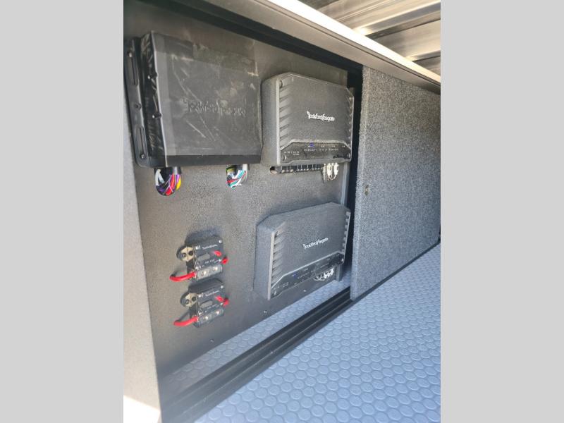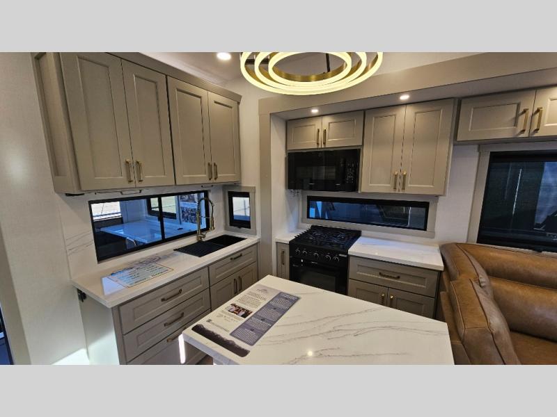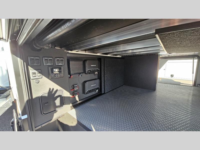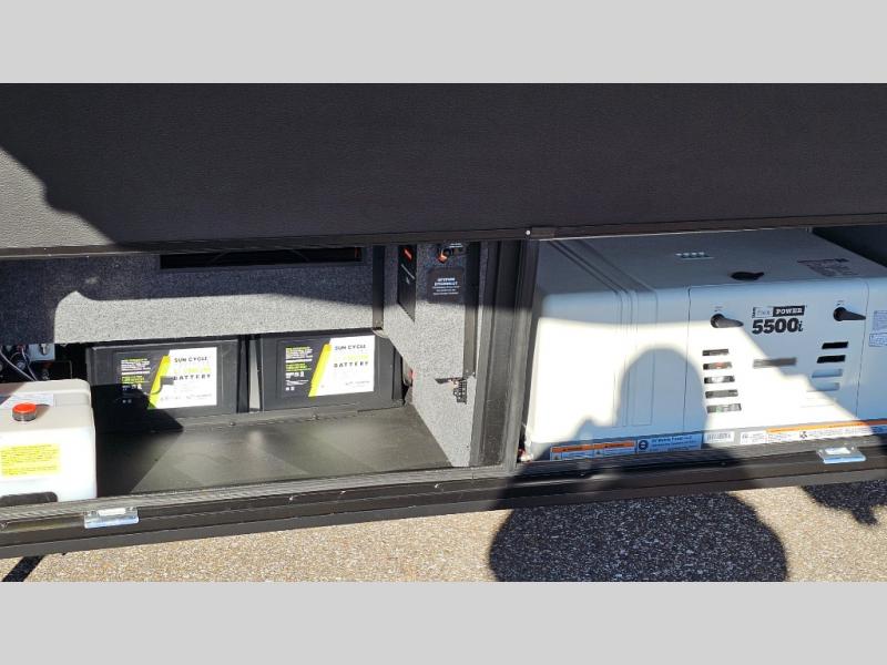 With any Model G toy hauler fifth wheel by Brinkley you will enjoy luxurious amenities, tons of storage space, and innovative features that have been developed and tested in the real world. Durable construction includes an industry leading PDI process, an industry best insulation package, and reinforced and walkable slide roofs. Some of the exterior features you'll find are a 3-way pass-through with a multi-functional flip-up bulkhead wall, under I-beam storage, a MAX-Vision reverse lighting system, and a low-maintenance roof to name a few. A Rockford Fosgate audio system comes standard, along with a Full app-based coach control system (iOS & Android) that lets you control your fifth wheel's functions right from your mobile device. You will find the solar system with a designated storage area to be ultra convenient, plus there is a FlexPower 5500 with a dual fuel inverter generator for all your power needs. Head inside to find a residential interior with Brinkley's CraftSense wood trim construction, floating entrance steps, integrated window screens and insulated blackout blinds, and residential solid surface countertops plus backsplash. You will also enjoy the neon shower lighting and recessed medicine cabinets in the bath, plus motion activated LED bed lights and dual bedside outlets in the bedroom. Choose a Model G toy hauler fifth wheel to experience all the luxury it has to offer!