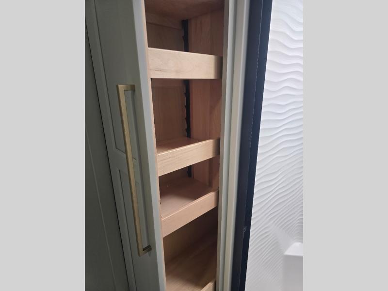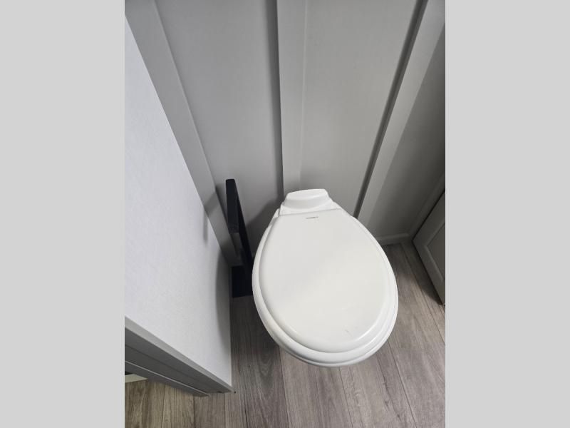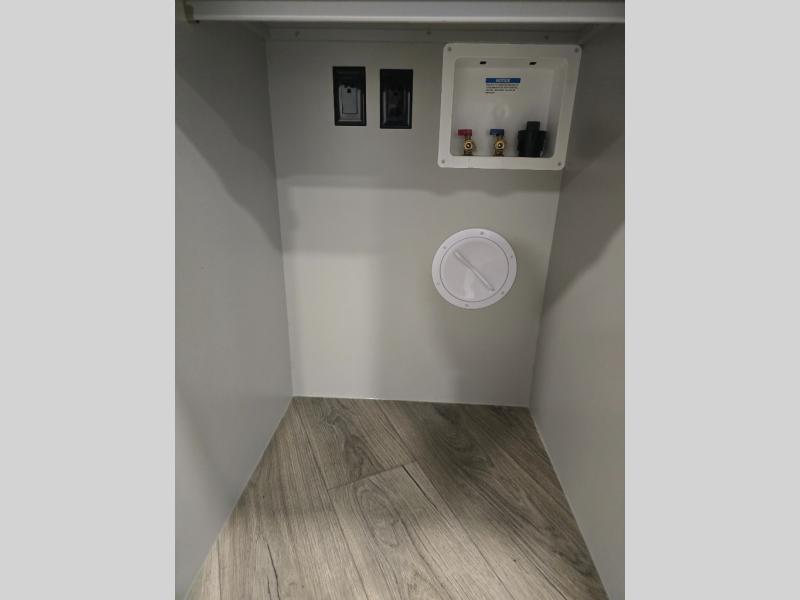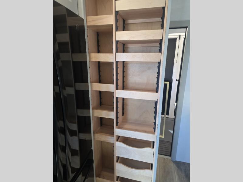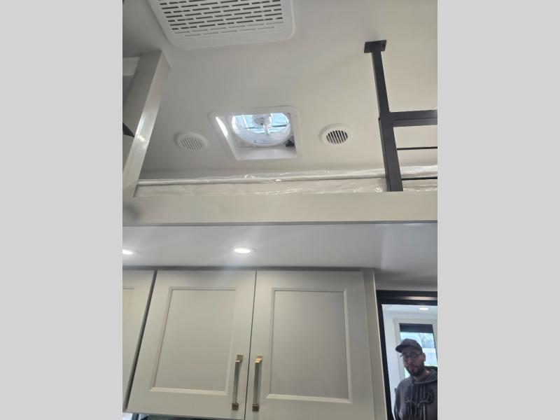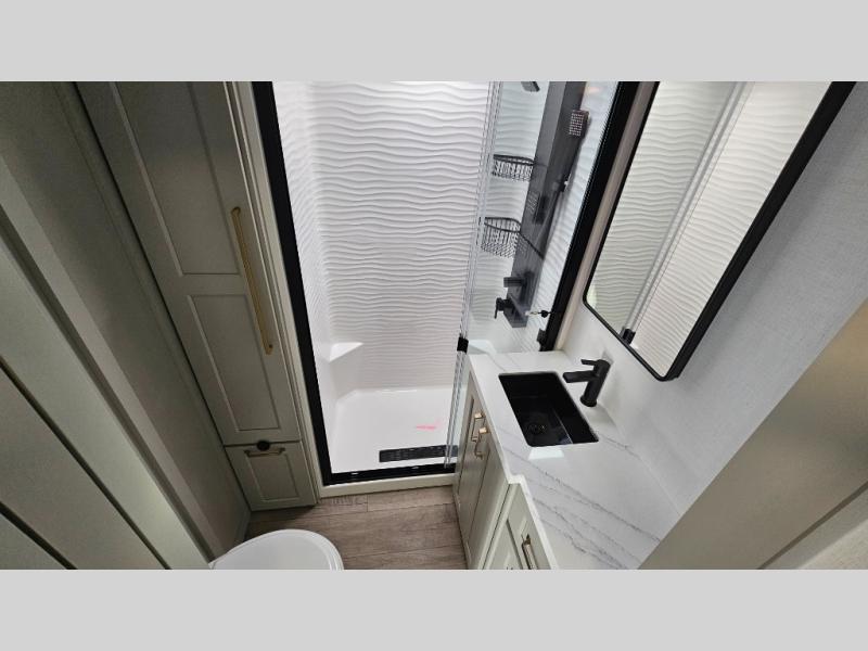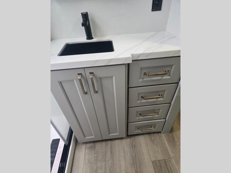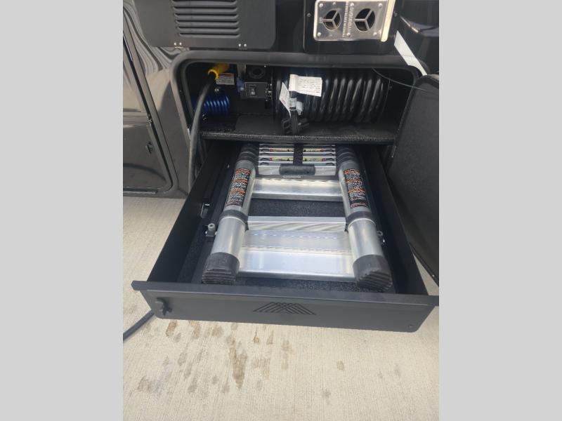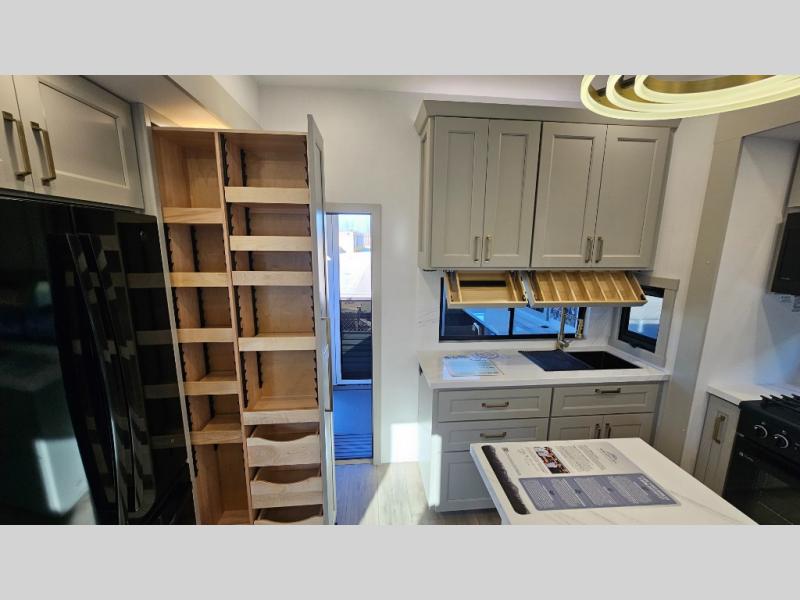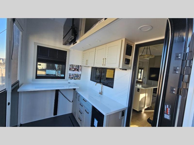You can't imagine how much this toy hauler has to offer! The garage/outdoor kitchen/office space will allow you to utilize the garage how you need it, plus there is an adjustable tie-down system, as well as a loft for storage and a twin bed to sleep more campers! The garage patio with a 1,500 lb. capacity is another feature you are sure to love, especially with its own awning to keep you protected from the elements. Head to the kitchen to prepare meals with a 24" GE oven with a four burner range, a GE microwave with an air fryer, plus a spacious GE Energy Star 19 cu. ft. refrigerator. The island with two stools will let others visit with you while you cook, and there are even dog bowls to easily feed Frodo. You'll find the convertible dining table/L-desk will be accommodating since it can be use to dine at, and to get some work done. You may just find yourselves spending most of your time on the L-sofa in front of the entertainment center with a TV, fireplace and storage. A full bath is up front by the bedroom, and here you'll find a 30" x 42" shower and and pull-out linen storage with a trash bin to keep towels ready to use. After a day outdoors you'll love nothing more than coming back to your own bedroom with a king bed slide out, TV, a walk-in closet, and many more storage spaces. And we haven't even touched on the exterior features, like the 3-way pass-through storage, three power awnings, an air compressor to fill up tires, and the list goes on and on! This is a pre-production preview, all features and layout placement subject to change.