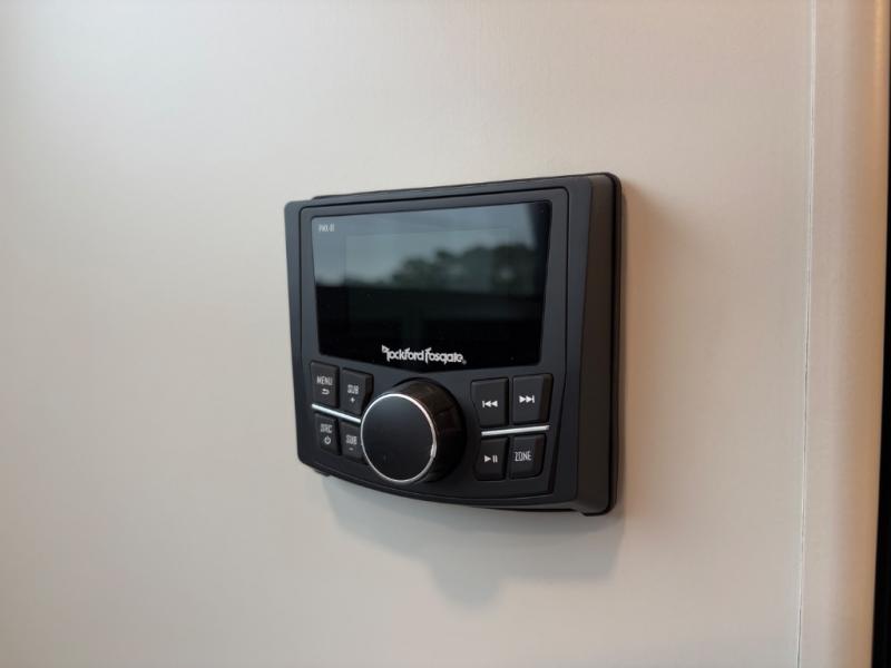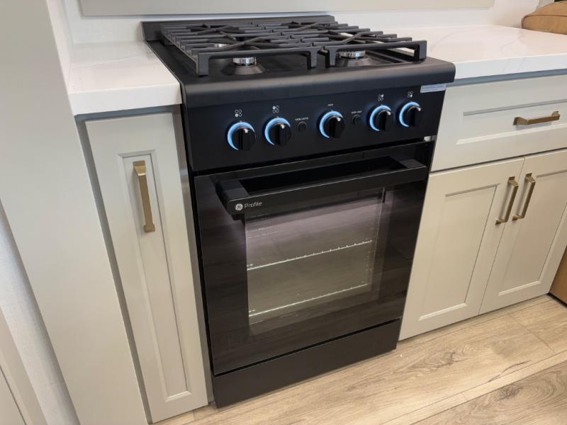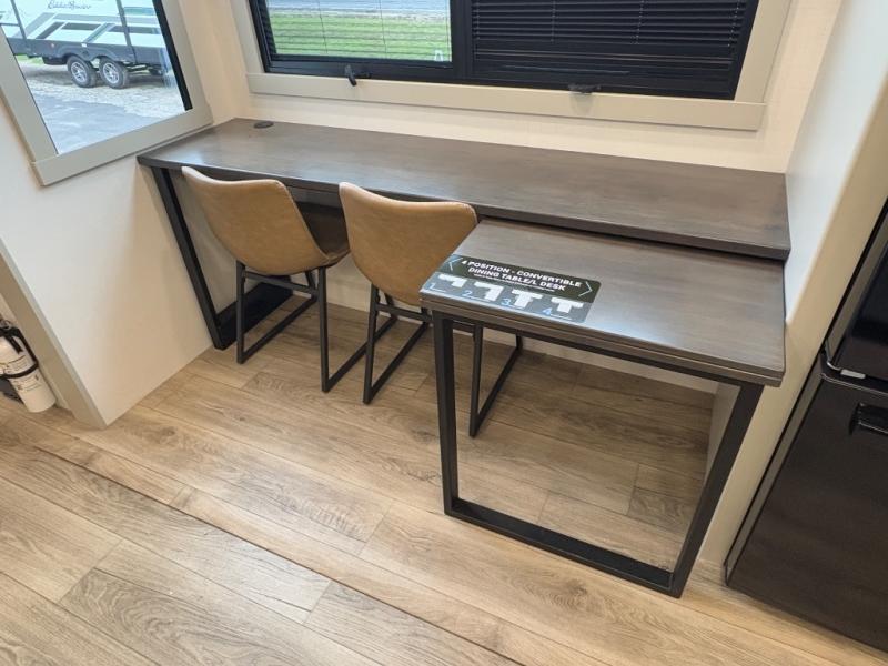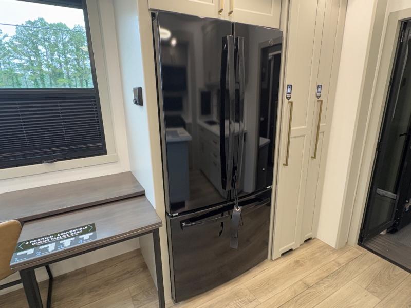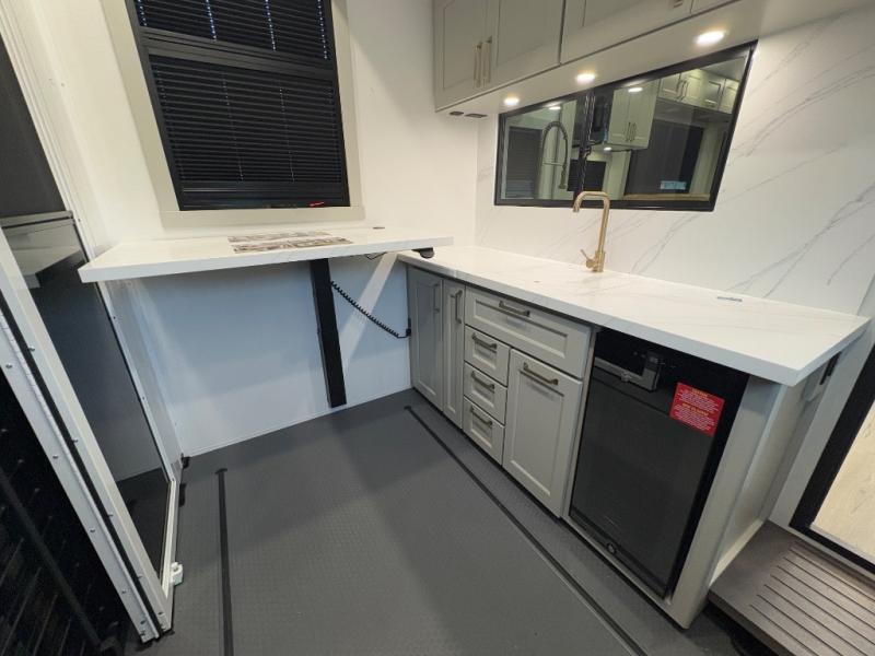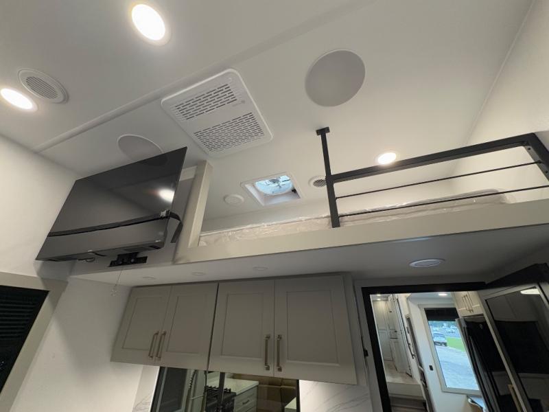 This luxury toy hauler gives you ultimate flexibility, comfort, and functionality! The garage area is more than just storage—use it as a mobile office, outdoor kitchen, or extra sleeping space thanks to the twin loft bed and adjustable tie-down system. The 1,500 lb. capacity rear patio features its own awning for outdoor entertaining. Inside, a 24" GE oven with four-burner range, air fryer microwave, and island with bar stools and pet bowls make the kitchen a dream to cook in.