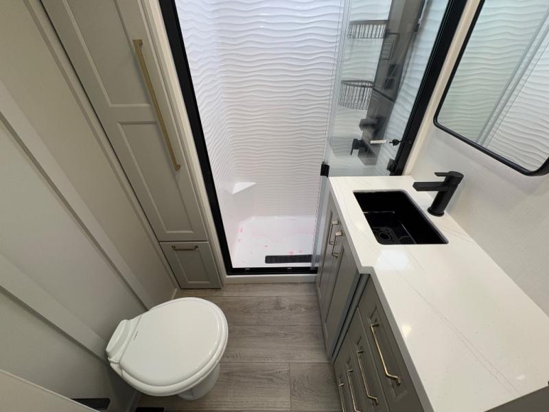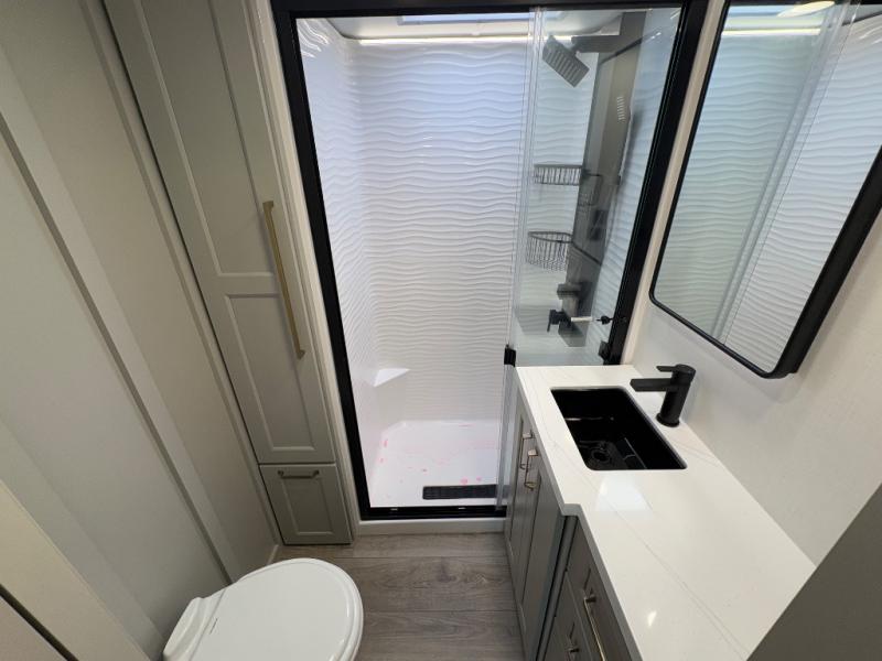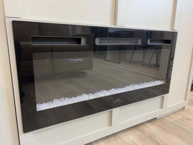 Relax on the large L-shaped sofa across from the fireplace and entertainment center, or get some work done at the convertible dining table and L-desk. The full bath features a 30" x 42" shower, pull-out linen storage, and even a built-in trash bin. Retreat to the private bedroom with a king bed slide, TV, and a massive walk-in closet for all your storage needs.