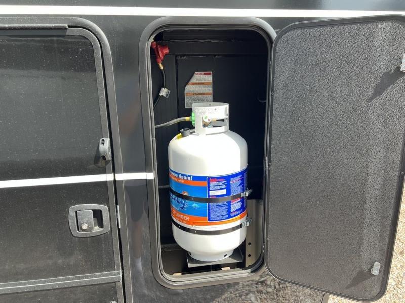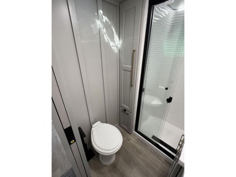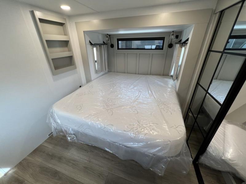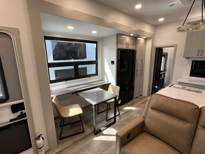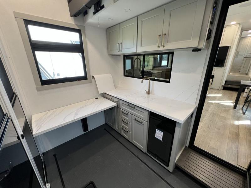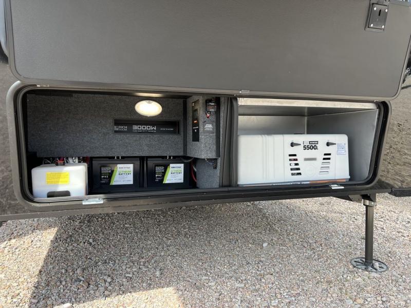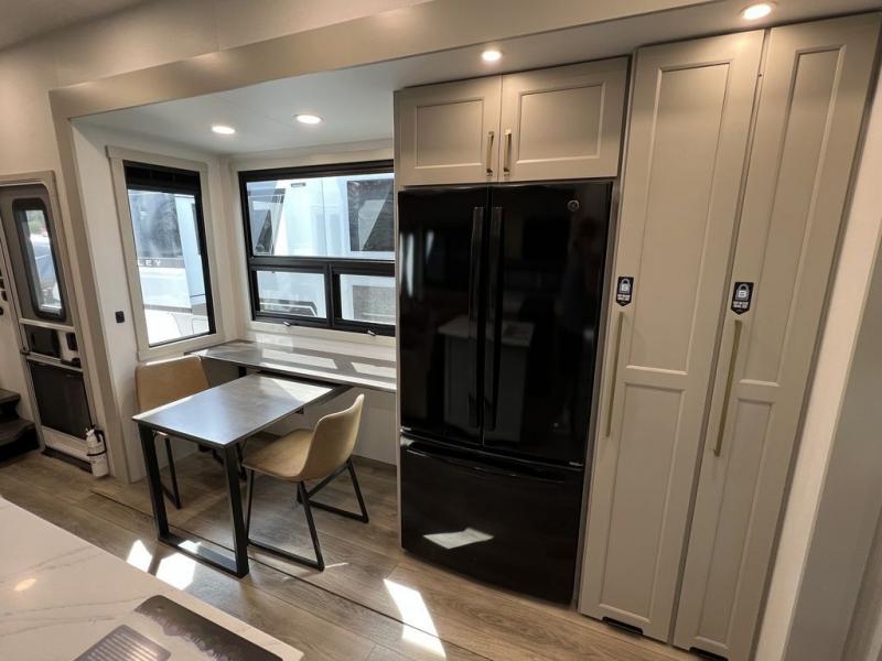 You can't imagine how much this toy hauler has to offer! The garage/outdoor kitchen/office space will allow you to utilize the garage how you need it, plus there is an adjustable tie-down system, as well as a loft for storage and a twin bed to sleep more campers! The garage patio with a 1,500 lb. capacity is another feature you are sure to love, especially with its own awning to keep you protected from the elements. Head to the kitchen to prepare meals with a 24" GE oven with a four burner range, a GE microwave with an air fryer, plus a spacious GE Energy Star 19 cu. ft. refrigerator. The island with two stools will let others visit with you while you cook, and there are even dog bowls to easily feed Frodo. You'll find the convertible dining table/L-desk will be accommodating since it can be use to dine at, and to get some work done. You may just find yourselves spending most of your time on the L-sofa in front of the entertainment center with a TV, fireplace and storage. A full bath is up front by the bedroom, and here you'll find a 30" x 42" shower and and pull-out linen storage with a trash bin to keep towels ready to use. After a day outdoors you'll love nothing more than coming back to your own bedroom with a king bed slide out, TV, a walk-in closet, and many more storage spaces. And we haven't even touched on the exterior features, like the 3-way pass-through storage, three power awnings, an air compressor to fill up tires, and the list goes on and on! This is a pre-production preview, all features and layout placement subject to change.