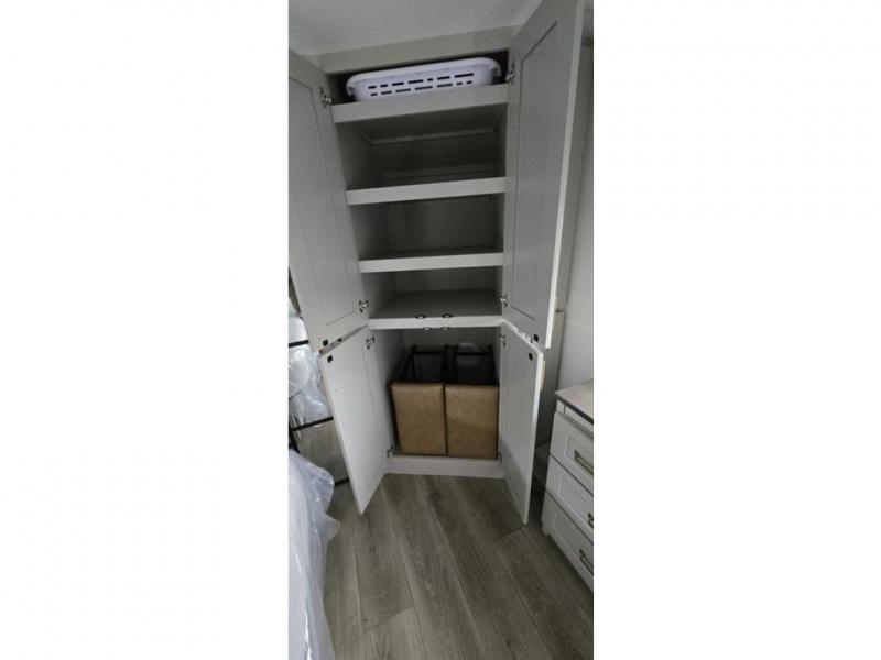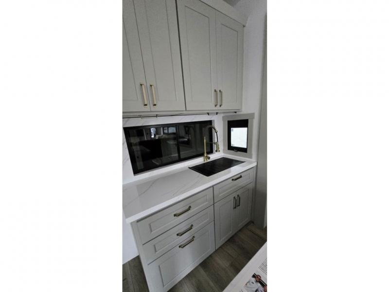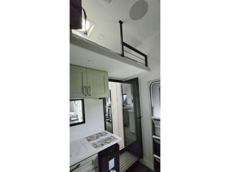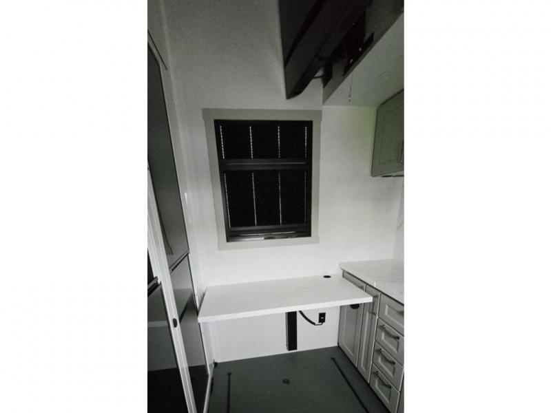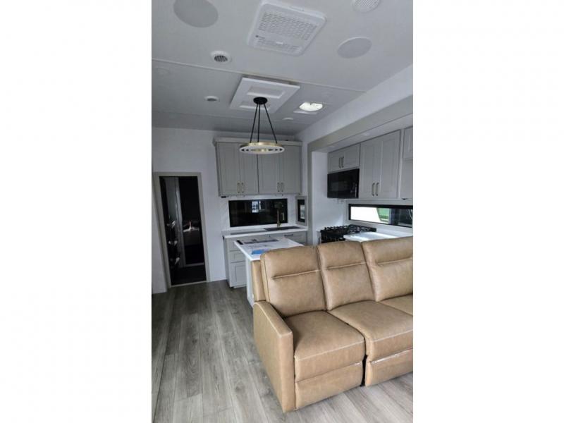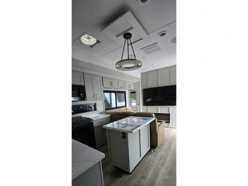 You can't imagine how much this toy hauler has to offer! The garage/outdoor kitchen/office space will allow you to utilize the garage how you need it, plus there is an adjustable tie-down system, as well as a loft for storage and a twin bed to sleep more campers! The garage patio with a 1,500 lb. capacity is another feature you are sure to love, especially with its own awning to keep you protected from the elements. Head to the kitchen to prepare meals with a 24" GE oven with a four burner range, a GE microwave with an air fryer, plus a spacious GE Energy Star 19 cu. ft. refrigerator. The island with two stools will let others visit with you while you cook, and there are even dog bowls to easily feed Frodo. You'll find the convertible dining table/L-desk will be accommodating since it can be use to dine at, and to get some work done. You may just find yourselves spending most of your time on the L-sofa in front of the entertainment center with a TV, fireplace and storage. A full bath is up front by the bedroom, and here you'll find a 30" x 42" shower and and pull-out linen storage with a trash bin to keep towels ready to use. After a day outdoors you'll love nothing more than coming back to your own bedroom with a king bed slide out, TV, a walk-in closet, and many more storage spaces. And we haven't even touched on the exterior features, like the 3-way pass-through storage, three power awnings, an air compressor to fill up tires, and the list goes on and on! This is a pre-production preview, all features and layout placement subject to change.