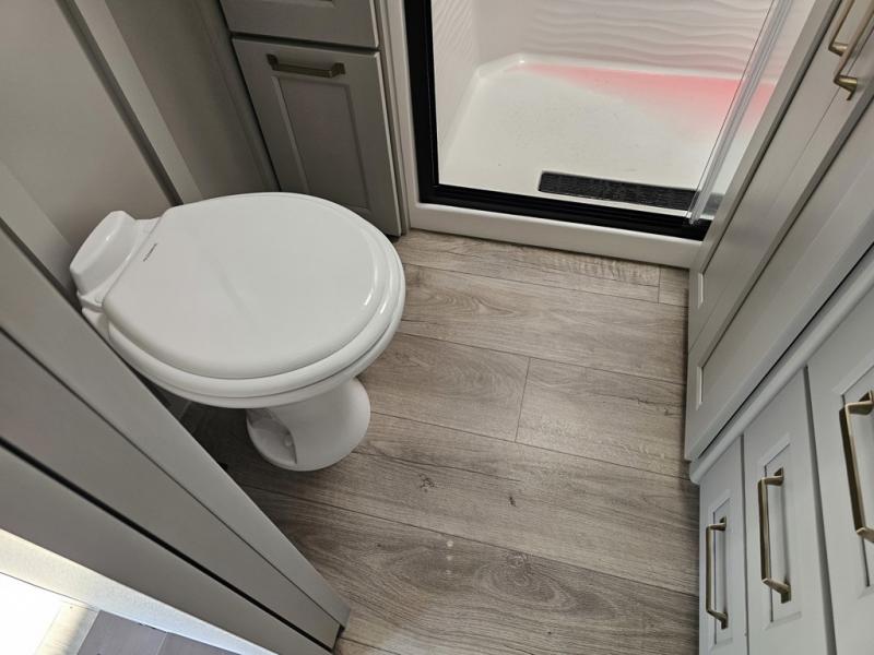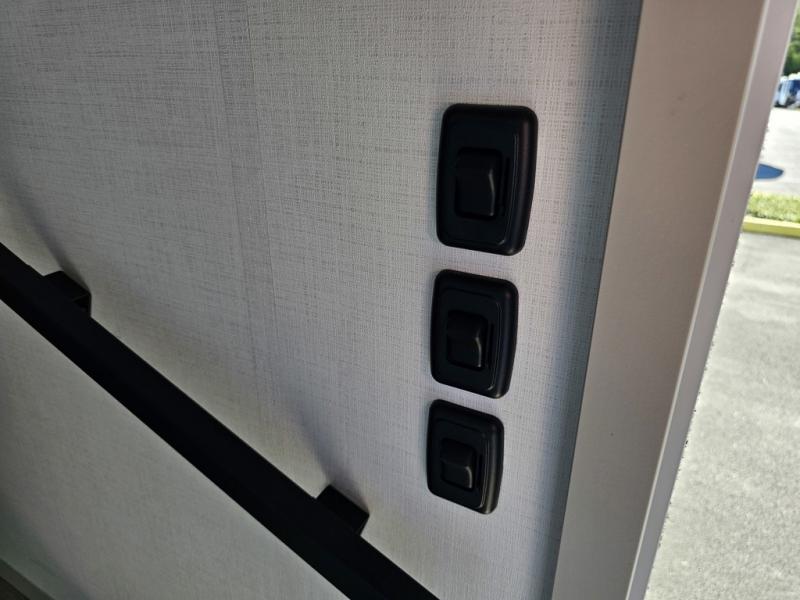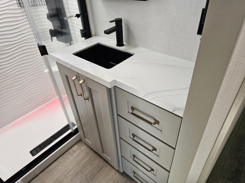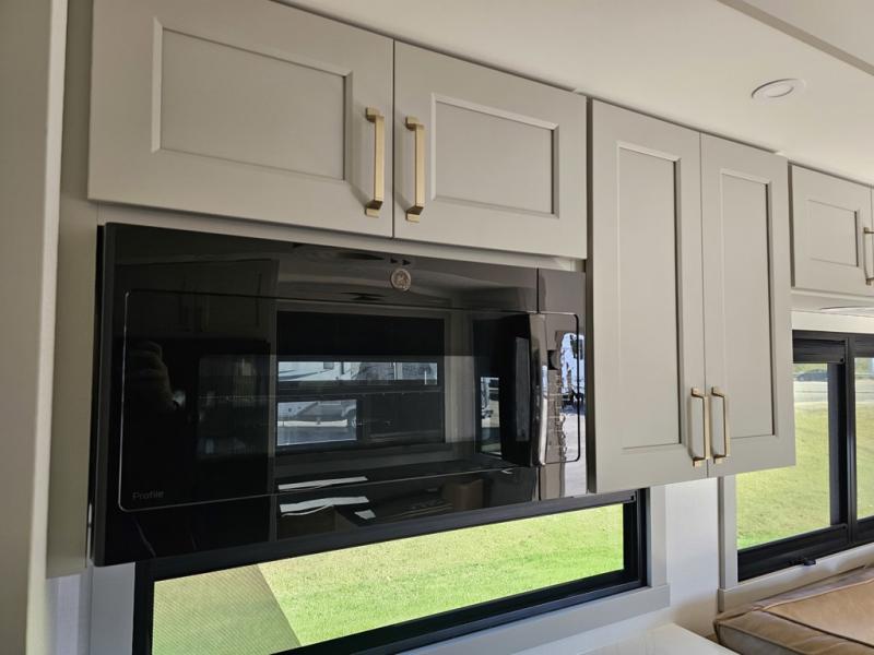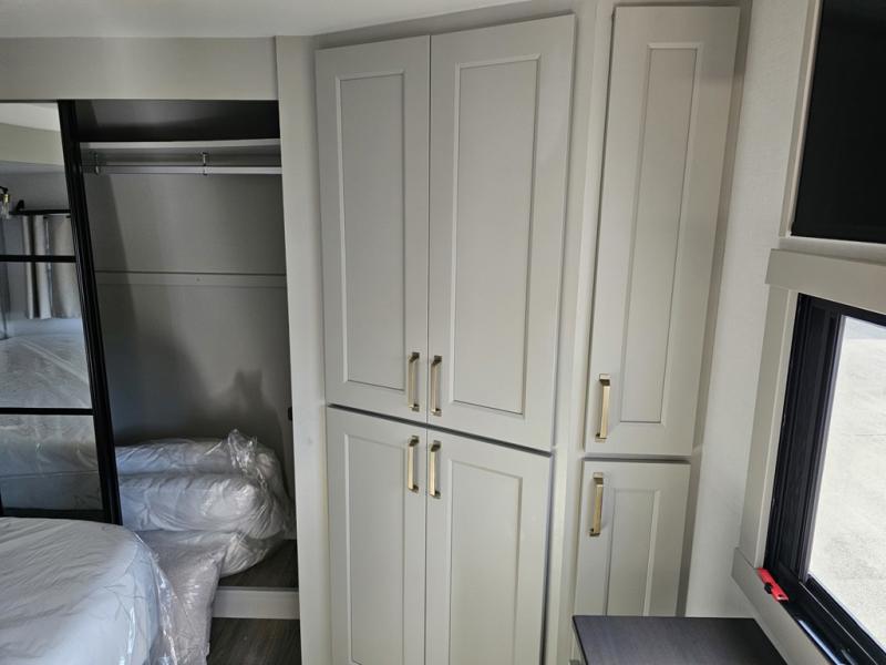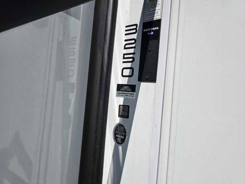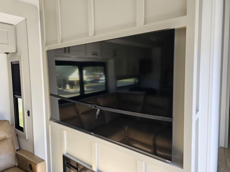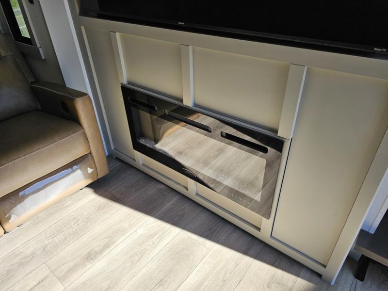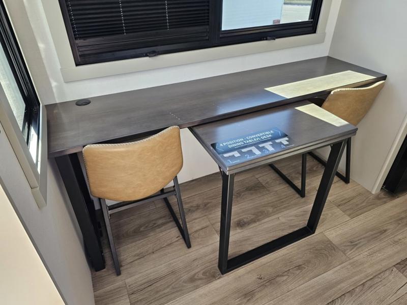 You can't imagine how much this toy hauler has to offer! The garage/outdoor kitchen/office space will allow you to utilize the garage how you need it, plus there is an adjustable tie-down system, as well as a loft for storage and a twin bed to sleep more campers! The garage patio with a 1,500 lb. capacity is another feature you are sure to love, especially with its own awning to keep you protected from the elements. Head to the kitchen to prepare meals with a 24" GE oven with a four burner range, a GE microwave with an air fryer, plus a spacious GE Energy Star 19 cu. ft. refrigerator. The island with two stools will let others visit with you while you cook, and there are even dog bowls to easily feed Frodo. You'll find the convertible dining table/L-desk will be accommodating since it can be use to dine at, and to get some work done. You may just find yourselves spending most of your time on the L-sofa in front of the entertainment center with a TV, fireplace and storage. A full bath is up front by the bedroom, and here you'll find a 30" x 42" shower and and pull-out linen storage with a trash bin to keep towels ready to use. After a day outdoors you'll love nothing more than coming back to your own bedroom with a king bed slide out, TV, a walk-in closet, and many more storage spaces. And we haven't even touched on the exterior features, like the 3-way pass-through storage, three power awnings, an air compressor to fill up tires, and the list goes on and on! This is a pre-production preview, all features and layout placement subject to change.