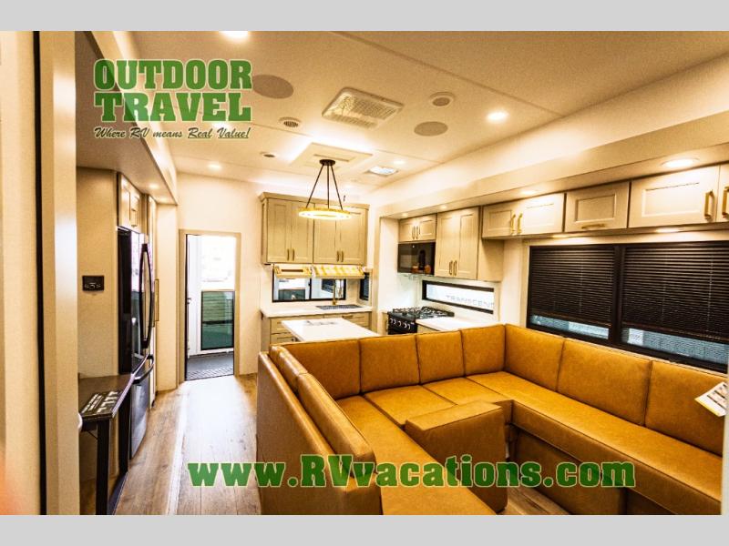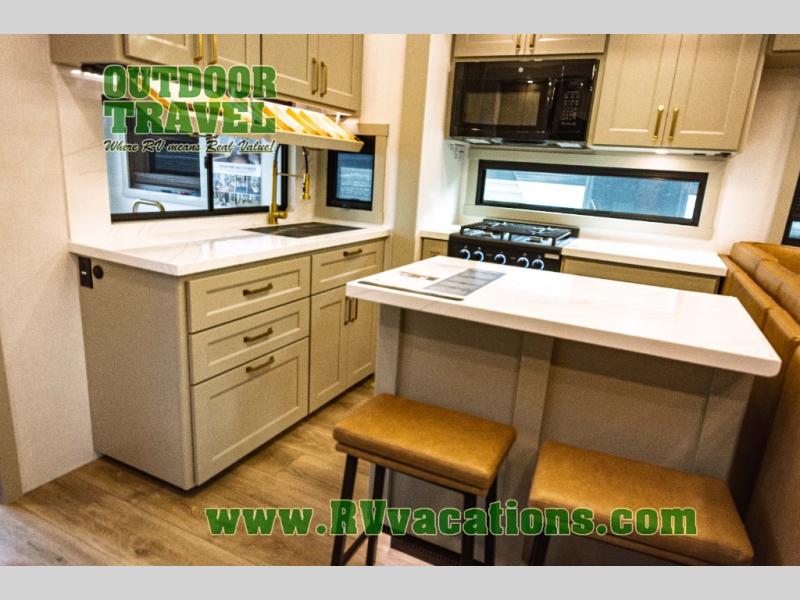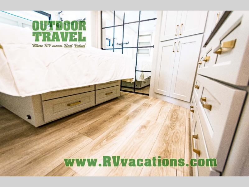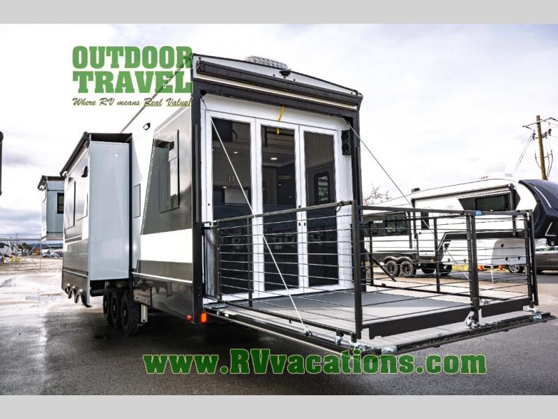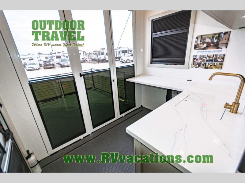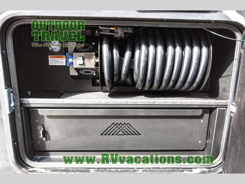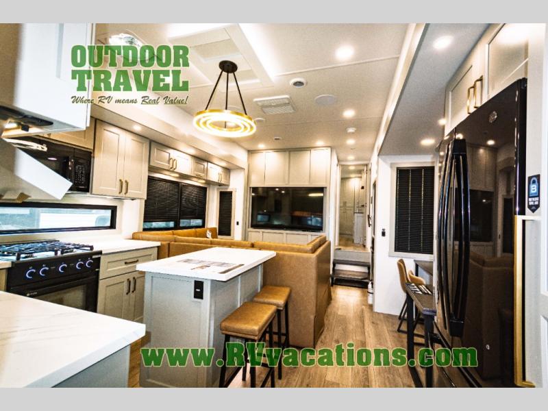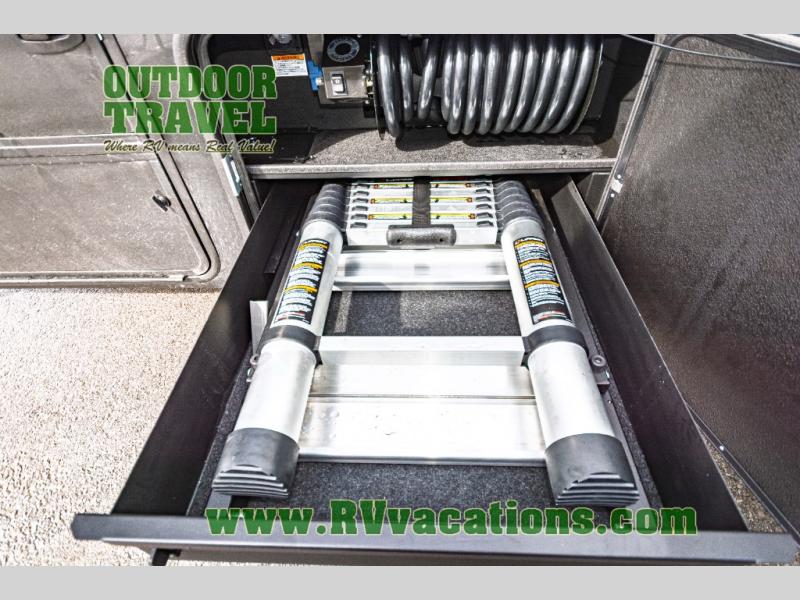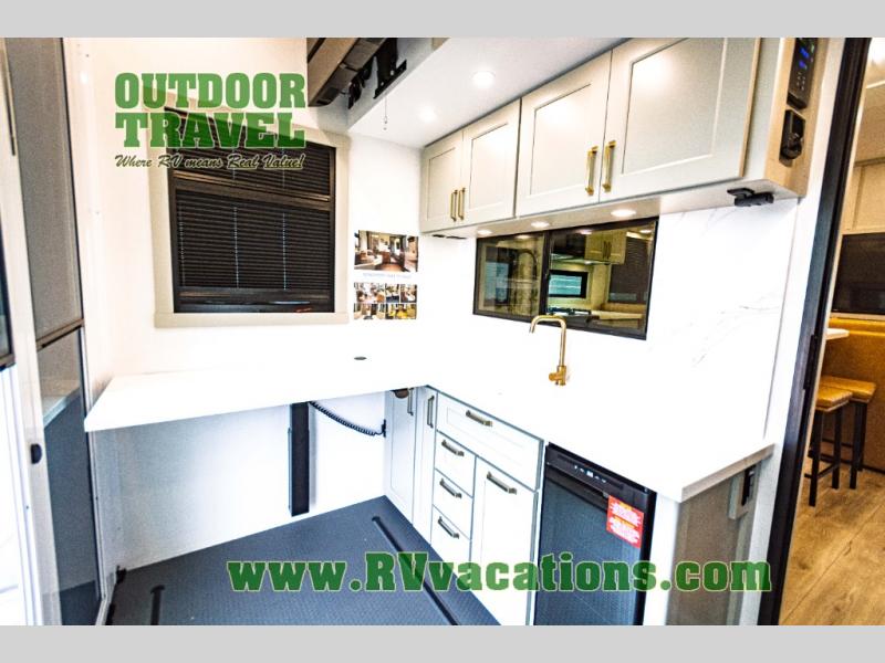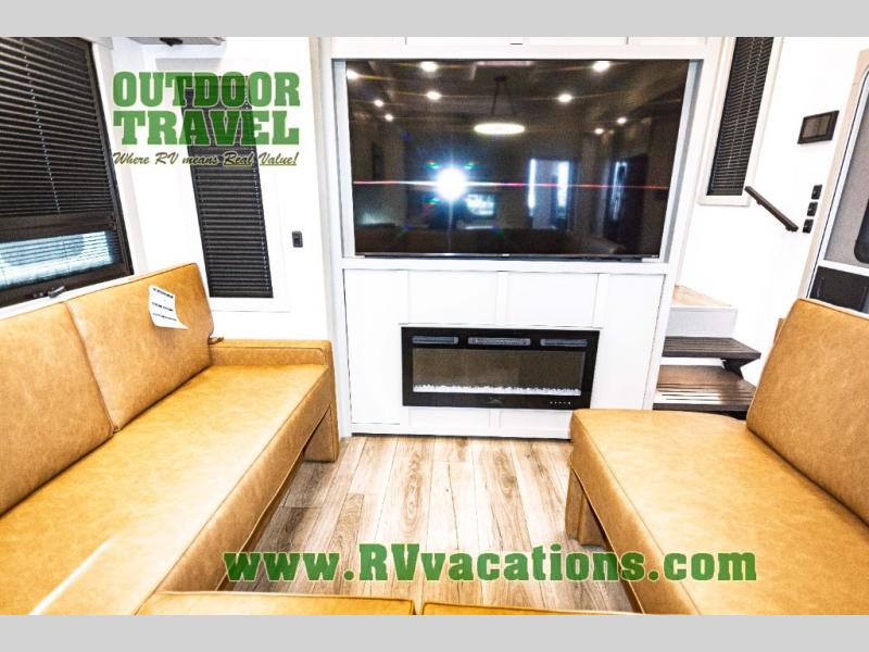 You can't imagine how much this toy hauler has to offer! The garage/outdoor kitchen/office space will allow you to utilize the garage how you need it, plus there is an adjustable tie-down system, as well as a loft for storage and a twin bed to sleep more campers! The garage patio with a 1,500 lb. capacity is another feature you are sure to love, especially with its own awning to keep you protected from the elements. Head to the kitchen to prepare meals with a 24" GE oven with a four burner range, a GE microwave with an air fryer, plus a spacious GE Energy Star 19 cu. ft. refrigerator. The island with two stools will let others visit with you while you cook, and there are even dog bowls to easily feed Frodo. You'll find the convertible dining table/L-desk will be accommodating since it can be use to dine at, and to get some work done. You may just find yourselves spending most of your time on the L-sofa in front of the entertainment center with a TV, fireplace and storage. A full bath is up front by the bedroom, and here you'll find a 30" x 42" shower and and pull-out linen storage with a trash bin to keep towels ready to use. After a day outdoors you'll love nothing more than coming back to your own bedroom with a king bed slide out, TV, a walk-in closet, and many more storage spaces. And we haven't even touched on the exterior features, like the 3-way pass-through storage, three power awnings, an air compressor to fill up tires, and the list goes on and on! This is a pre-production preview, all features and layout placement subject to change.