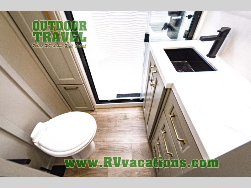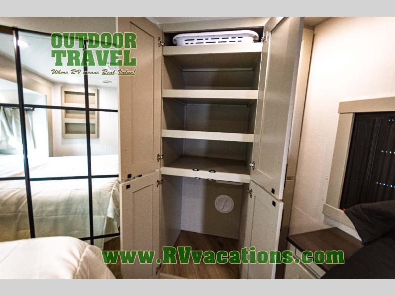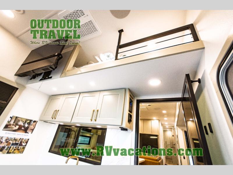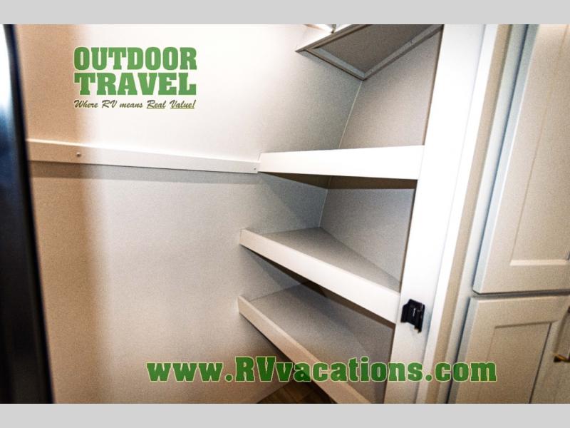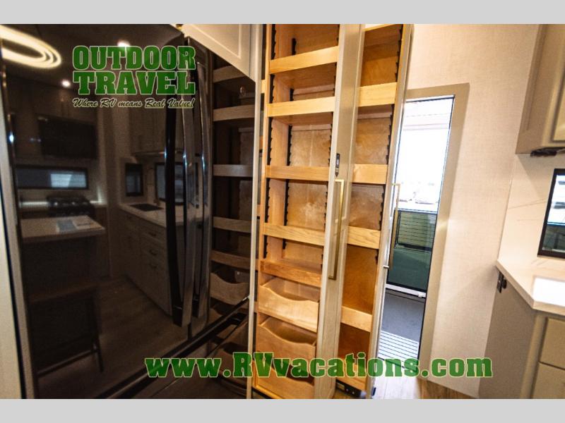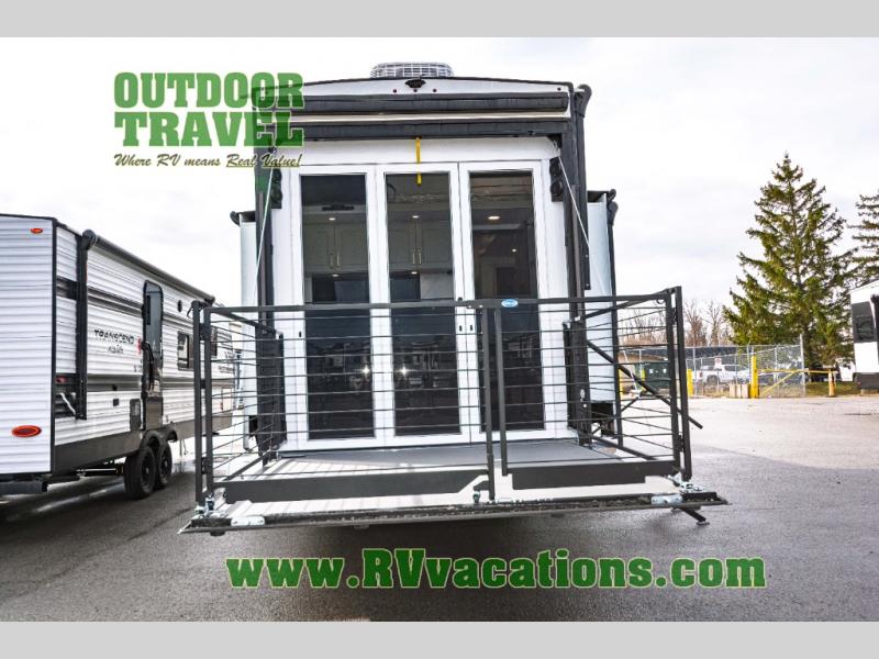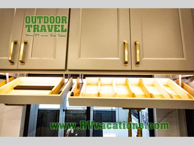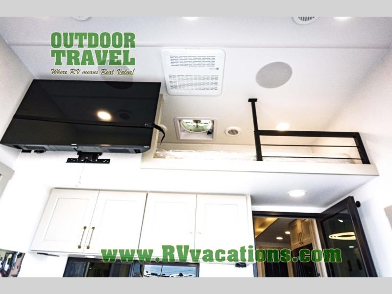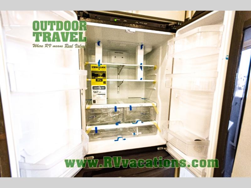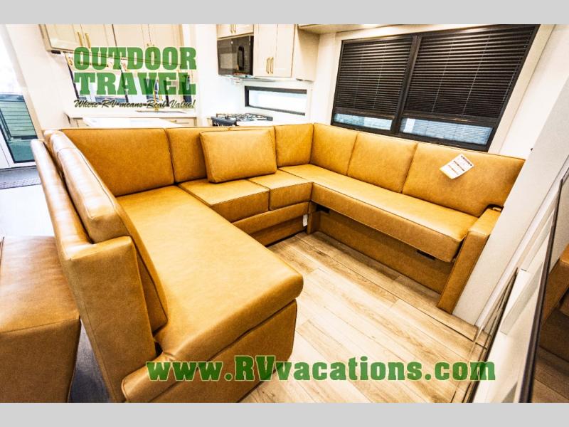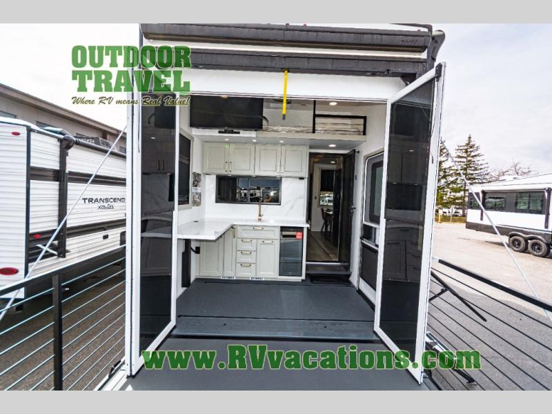 You can't imagine how much this toy hauler has to offer! The garage/outdoor kitchen/office space will allow you to utilize the garage how you need it, plus there is an adjustable tie-down system, as well as a loft for storage and a twin bed to sleep more campers! The garage patio with a 1,500 lb. capacity is another feature you are sure to love, especially with its own awning to keep you protected from the elements. Head to the kitchen to prepare meals with a 24" GE oven with a four burner range, a GE microwave with an air fryer, plus a spacious GE Energy Star 19 cu. ft. refrigerator. The island with two stools will let others visit with you while you cook, and there are even dog bowls to easily feed Frodo. You'll find the convertible dining table/L-desk will be accommodating since it can be use to dine at, and to get some work done. You may just find yourselves spending most of your time on the L-sofa in front of the entertainment center with a TV, fireplace and storage. A full bath is up front by the bedroom, and here you'll find a 30" x 42" shower and and pull-out linen storage with a trash bin to keep towels ready to use. After a day outdoors you'll love nothing more than coming back to your own bedroom with a king bed slide out, TV, a walk-in closet, and many more storage spaces. And we haven't even touched on the exterior features, like the 3-way pass-through storage, three power awnings, an air compressor to fill up tires, and the list goes on and on! This is a pre-production preview, all features and layout placement subject to change.
