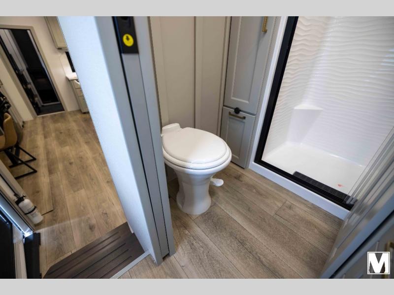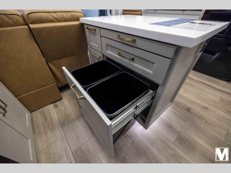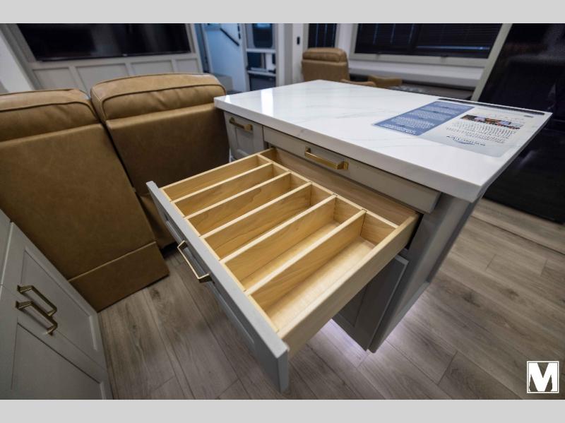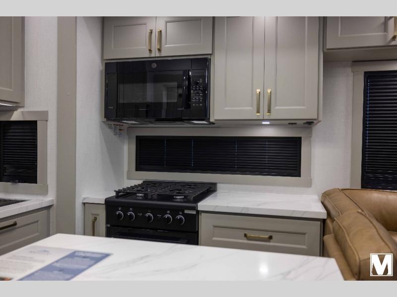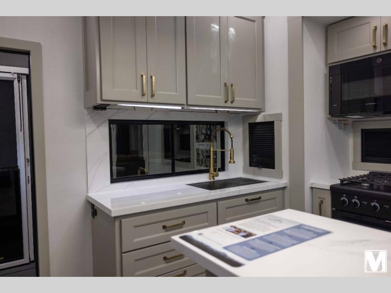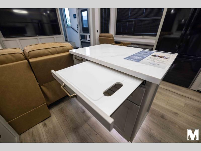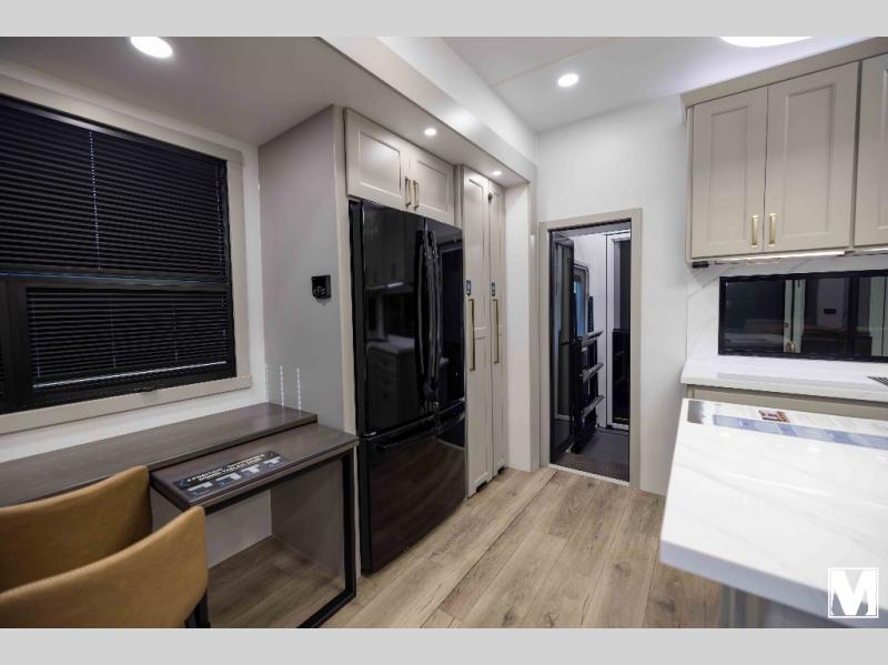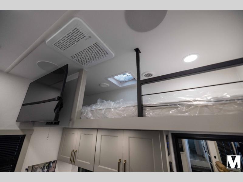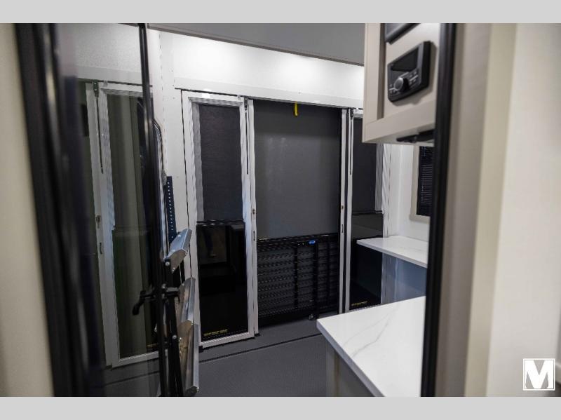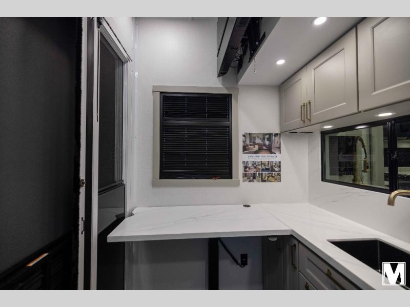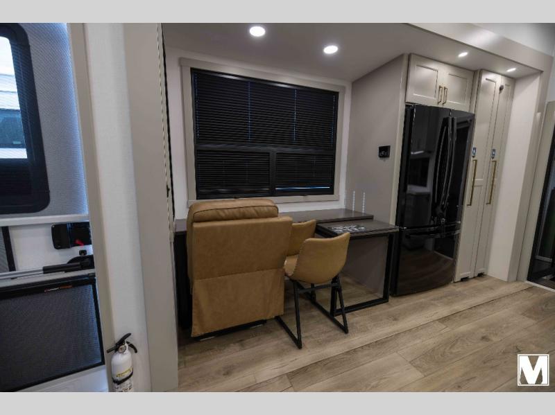 You can't imagine how much this toy hauler has to offer! The garage/outdoor kitchen/office space will allow you to utilize the garage how you need it, plus there is an adjustable tie-down system, as well as a loft for storage and a twin bed to sleep more campers! The garage patio with a 1,500 lb. capacity is another feature you are sure to love, especially with its own awning to keep you protected from the elements. Head to the kitchen to prepare meals with a 24" GE oven with a four burner range, a GE microwave with an air fryer, plus a spacious GE Energy Star 19 cu. ft. refrigerator. The island with two stools will let others visit with you while you cook, and there are even dog bowls to easily feed Frodo. You'll find the convertible dining table/L-desk will be accommodating since it can be use to dine at, and to get some work done. You may just find yourselves spending most of your time on the L-sofa in front of the entertainment center with a TV, fireplace and storage. A full bath is up front by the bedroom, and here you'll find a 30" x 42" shower and and pull-out linen storage with a trash bin to keep towels ready to use. After a day outdoors you'll love nothing more than coming back to your own bedroom with a king bed slide out, TV, a walk-in closet, and many more storage spaces. And we haven't even touched on the exterior features, like the 3-way pass-through storage, three power awnings, an air compressor to fill up tires, and the list goes on and on! This is a pre-production preview, all features and layout placement subject to change.