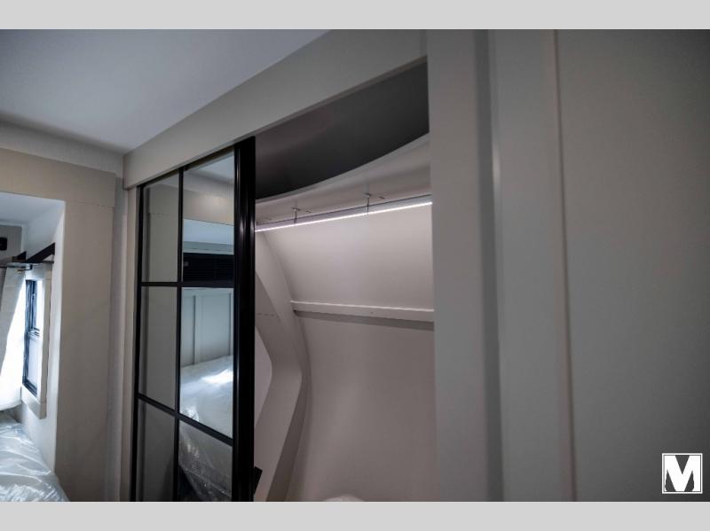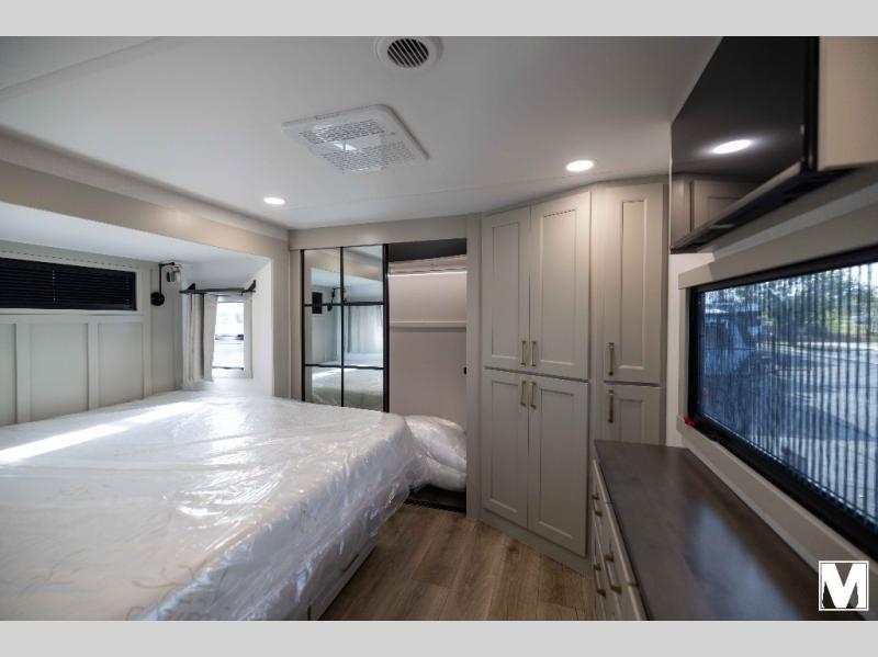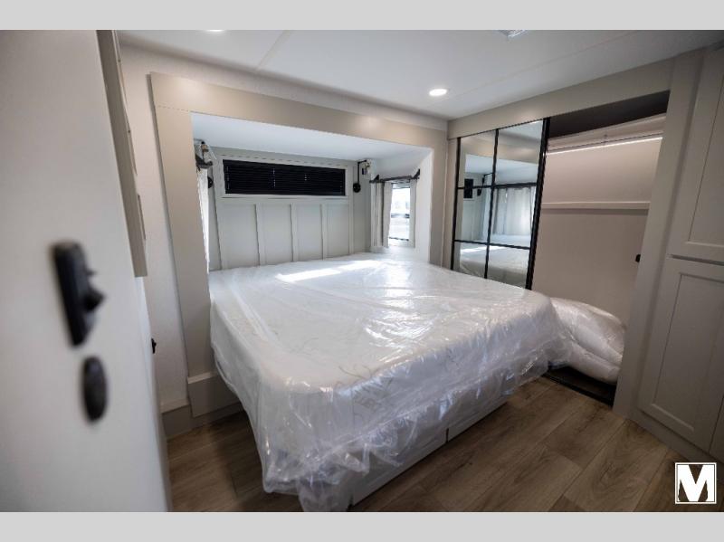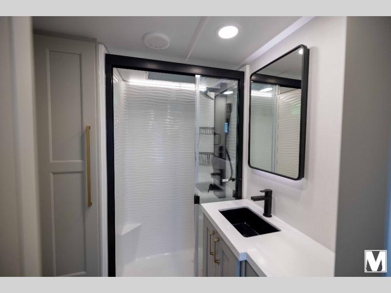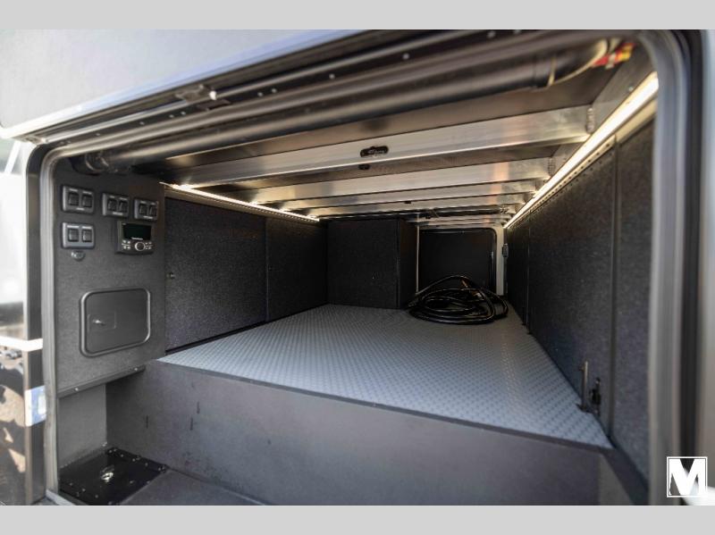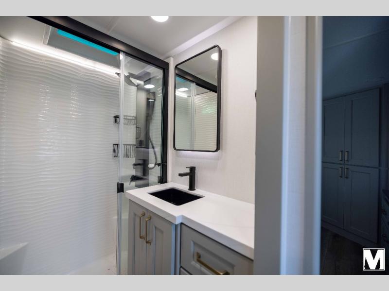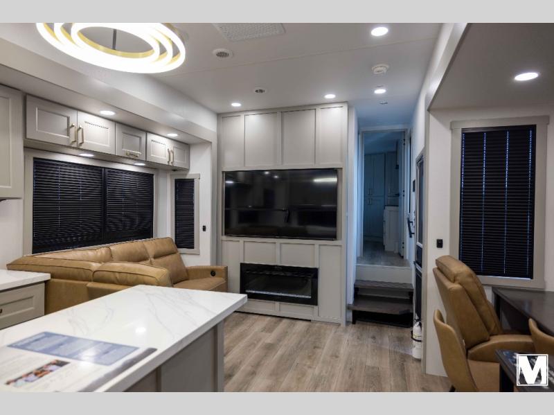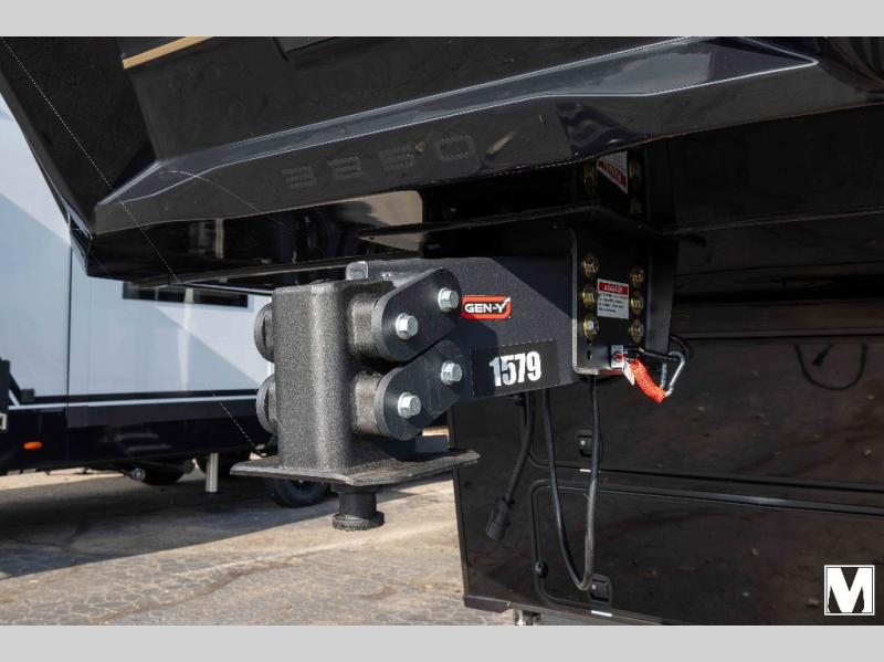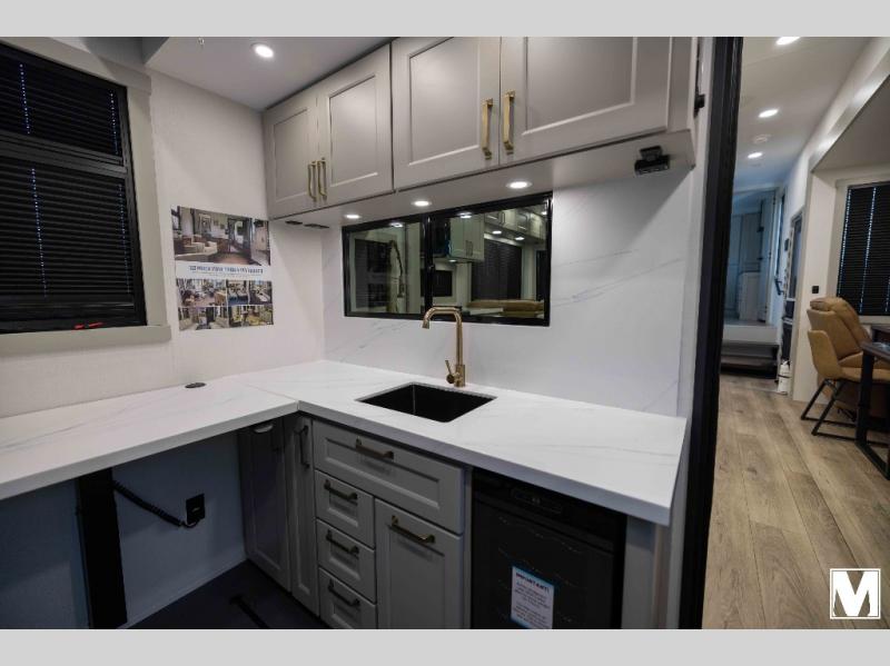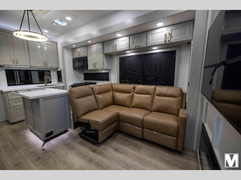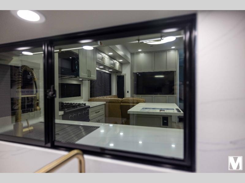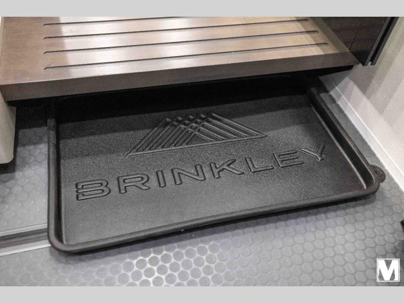 With any Model G toy hauler fifth wheel by Brinkley you will enjoy luxurious amenities, tons of storage space, and innovative features that have been developed and tested in the real world. Durable construction includes an industry leading PDI process, an industry best insulation package, and reinforced and walkable slide roofs. Some of the exterior features you'll find are a 3-way pass-through with a multi-functional flip-up bulkhead wall, under I-beam storage, a MAX-Vision reverse lighting system, and a low-maintenance roof to name a few. A Rockford Fosgate audio system comes standard, along with a Full app-based coach control system (iOS & Android) that lets you control your fifth wheel's functions right from your mobile device. You will find the solar system with a designated storage area to be ultra convenient, plus there is a FlexPower 5500 with a dual fuel inverter generator for all your power needs. Head inside to find a residential interior with Brinkley's CraftSense wood trim construction, floating entrance steps, integrated window screens and insulated blackout blinds, and residential solid surface countertops plus backsplash. You will also enjoy the neon shower lighting and recessed medicine cabinets in the bath, plus motion activated LED bed lights and dual bedside outlets in the bedroom. Choose a Model G toy hauler fifth wheel to experience all the luxury it has to offer!