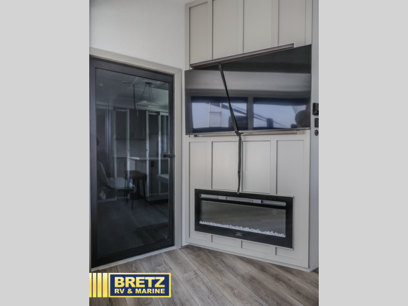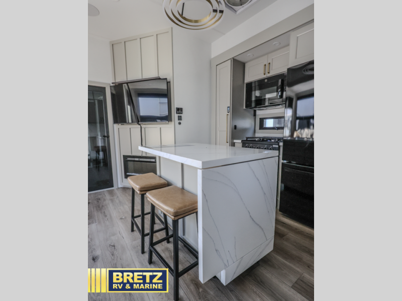 Prepare to be amazed by all the features packed into this toy hauler! There are triple slides that will provide your crew with more space, a separate garage that can sleep five with the loft included, plus a bath and a half for added convenience. The chef of your group will love the middle kitchen with a waterfall island that converts to a counter peninsula, a pull-out pantry, a GE Energy Star 19 cu. ft. refrigerator with ice and filtered water, and much more. In the combined kitchen and living space you'll find a spacious sofa with heat and massage, a fireplace, a TV, plus convenient dog bowls and shoe storage. After your toys are unloaded from the garage, you can relax on the independent dual sofas with a Fold-N-Stow table in between, and your guests can sleep on the Happijac® Sofa and Bed Lift system. You will find the front private bedroom with a king bed slide out will provide a great night's rest, and you'll also find a walk-in closet, under-bed storage, and a sliding dresser top with hidden storage for special belongings.