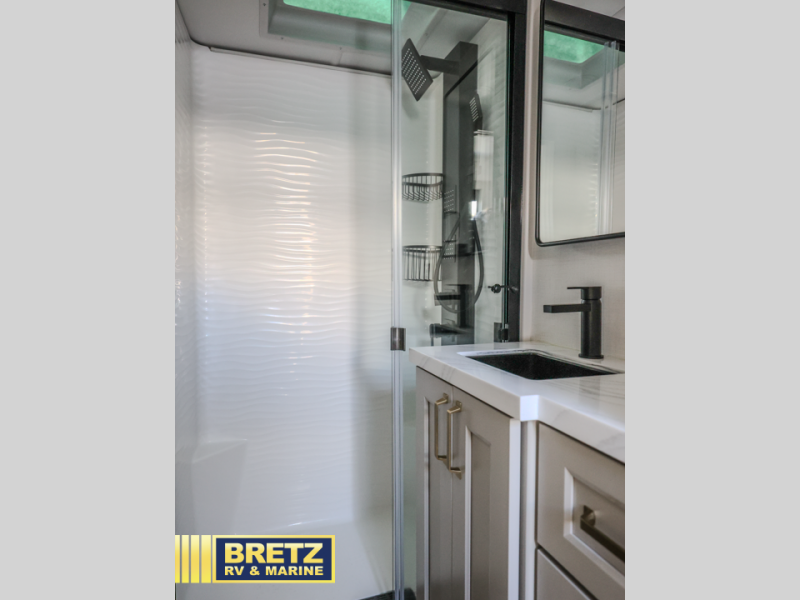 With any Model G toy hauler fifth wheel by Brinkley you will enjoy luxurious amenities, tons of storage space, and innovative features that have been developed and tested in the real world. Durable construction includes an industry leading PDI process, an industry best insulation package, and reinforced and walkable slide roofs. Some of the exterior features you'll find are a 3-way pass-through with a multi-functional flip-up bulkhead wall, under I-beam storage, a MAX-Vision reverse lighting system, and a low-maintenance roof to name a few. A Rockford Fosgate audio system comes standard, along with a OneControl app system that lets you control your fifth wheel's functions right from your mobile device. You will find the solar system with a designated storage area to be ultra convenient, plus there is a FlexPower 5500 with a dual fuel inverter generator for all your power needs. Head inside to find a residential interior with Brinkley's CraftSense wood trim construction, floating entrance steps, integrated window screens and insulated blackout blinds, and residential solid surface countertops plus backsplash. You will also enjoy the neon shower lighting and recessed medicine cabinets in the bath, plus motion activated LED bed lights and dual bedside outlets in the bedroom. Choose a Model G toy hauler fifth wheel to experience all the luxury it has to offer!