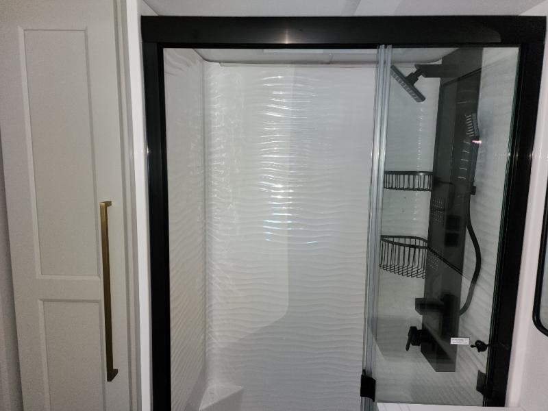 - Enjoy the full-size shower with a glass door, a vanity with ample counter space, and a porcelain toilet.
