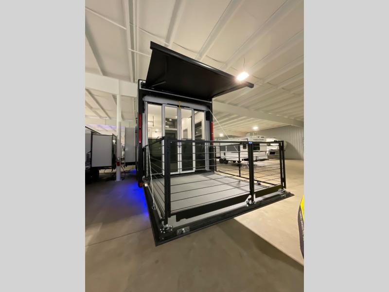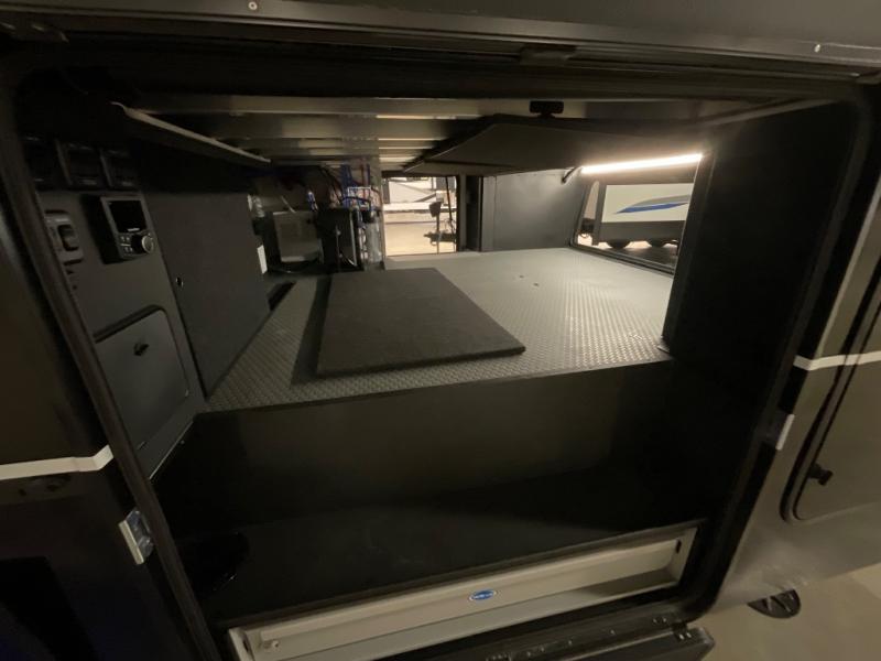 This toy hauler may just be the one you've been looking for! The garage/flex space with fold-away half bath walls will allow you to utilize the garage how you need it, plus there is an adjustable tie-down system, independent dual sofas, plus a loft for storage and a twin bed to sleep more campers! The garage patio with a 1,500 lb. capacity is another feature you are sure to love, especially with its own awning to keep you protected from the elements. Head to the kitchen to prepare meals with a 24" GE oven with a four burner range, a GE microwave with an air fryer, plus a spacious GE Energy Star 19 cu. ft. refrigerator. The island with two stools will let others visit with you while you cook, and there are even hidden dog bowls. You'll find the convertible dining table/L-desk will be accommodating since it can be use to dine at, and to get some work done. You may just find yourselves spending most of your time on the U-sofa in front of the TV and fireplace. A full bath is up front by the bedroom, and here you'll find neon shower lighting, a residential shower system, and pull-out linen storage to keep towels ready to use. After a day outdoors you'll love nothing more than coming back to your own bedroom with a king bed slide out, TV, a walk-in closet, and many more storage spaces. And we haven't even touched on the exterior features, like the 3-way pass-through storage, three power awnings, an air compressor to fill up tires, and the list goes on and on! This is a pre-production preview, all features and layout placement subject to change.