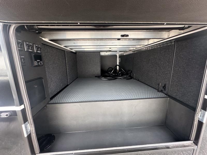 This toy hauler may just be the one you've been looking for! The garage/flex space with fold-away half bath walls will allow you to utilize the garage how you need it, plus there is an adjustable tie-down system, independent dual sofas, plus a loft for storage and a twin bed to sleep more campers! The garage patio with a 1,500 lb. capacity is another feature you are sure to love, especially with its own awning to keep you protected from the elements. Head to the kitchen to prepare meals with a 24" GE oven with a four burner range, a GE microwave with an air fryer, plus a spacious GE Energy Star 19 cu. ft. refrigerator. The island with two stools will let others visit with you while you cook, and there are even hidden dog bowls. You'll find the convertible dining table/L-desk will be accommodating since it can be use to dine at, and to get some work done. You may just find yourselves spending most of your time on the U-sofa in front of the TV and fireplace. A full bath is up front by the bedroom, and here you'll find neon shower lighting, a residential shower system, and pull-out linen storage to keep towels ready to use. After a day outdoors you'll love nothing more than coming back to your own bedroom with a king bed slide out, TV, a walk-in closet, and many more storage spaces. And we haven't even touched on the exterior features, like the 3-way pass-through storage, three power awnings, an air compressor to fill up tires, and the list goes on and on! This is a pre-production preview, all features and layout placement subject to change.