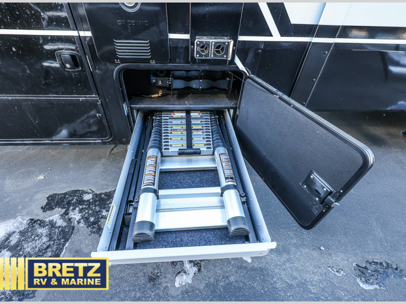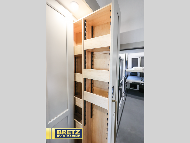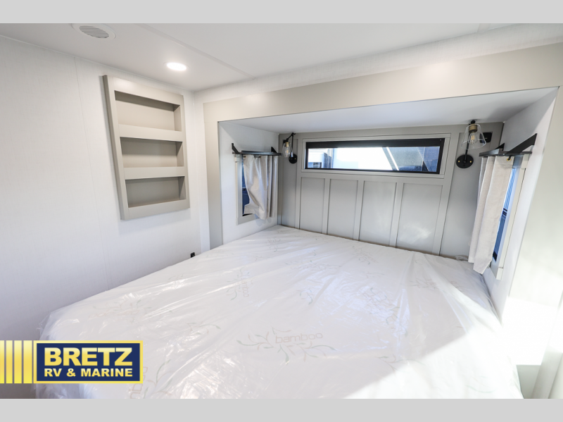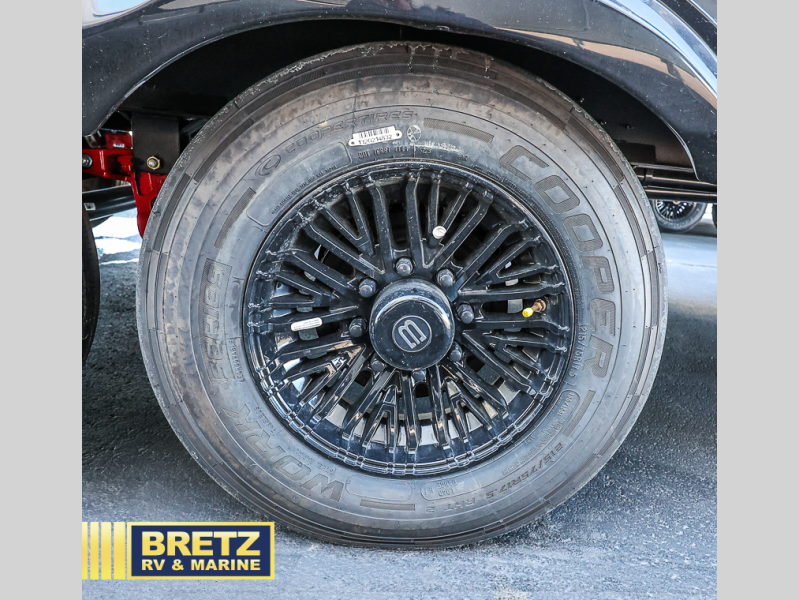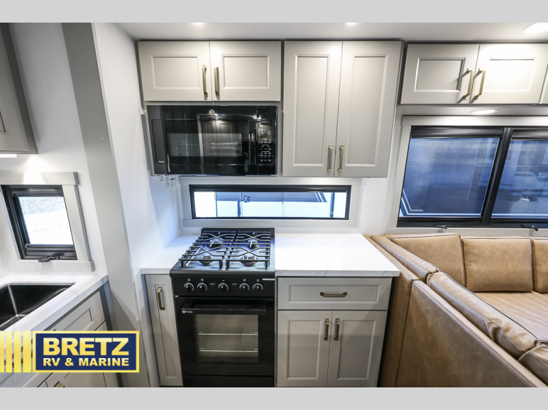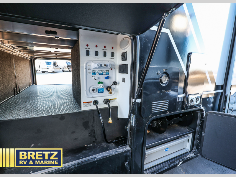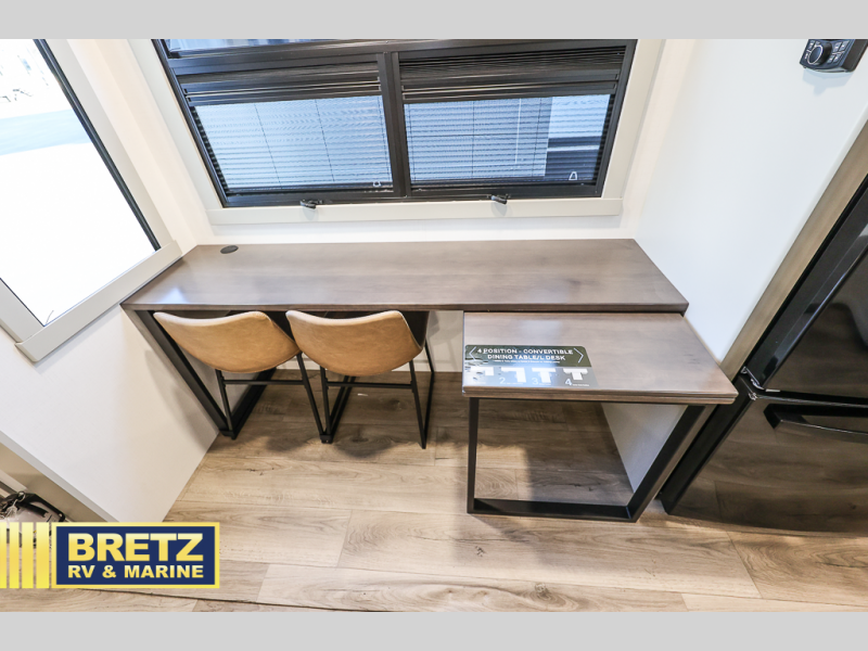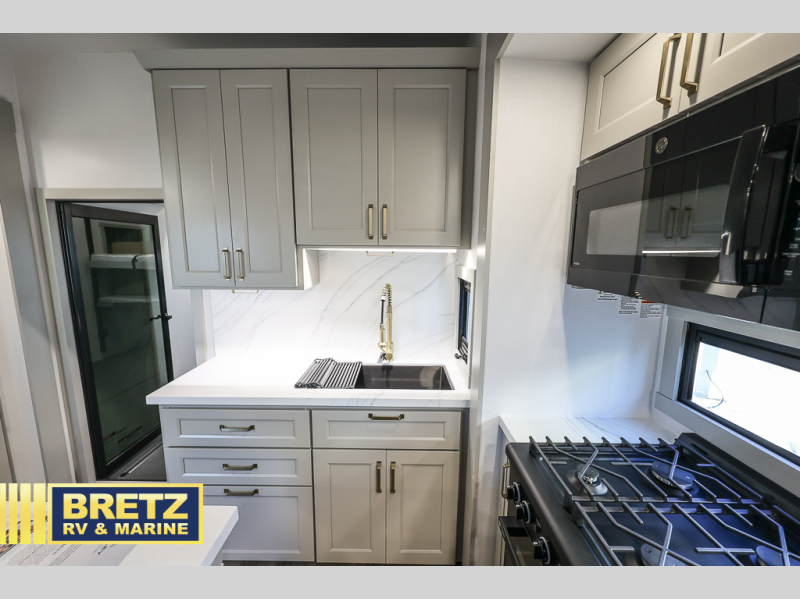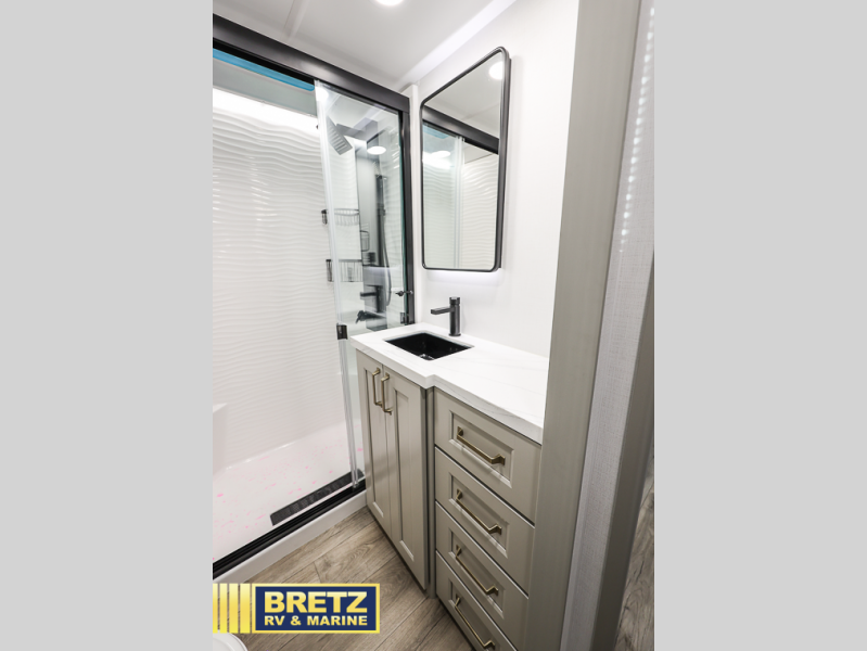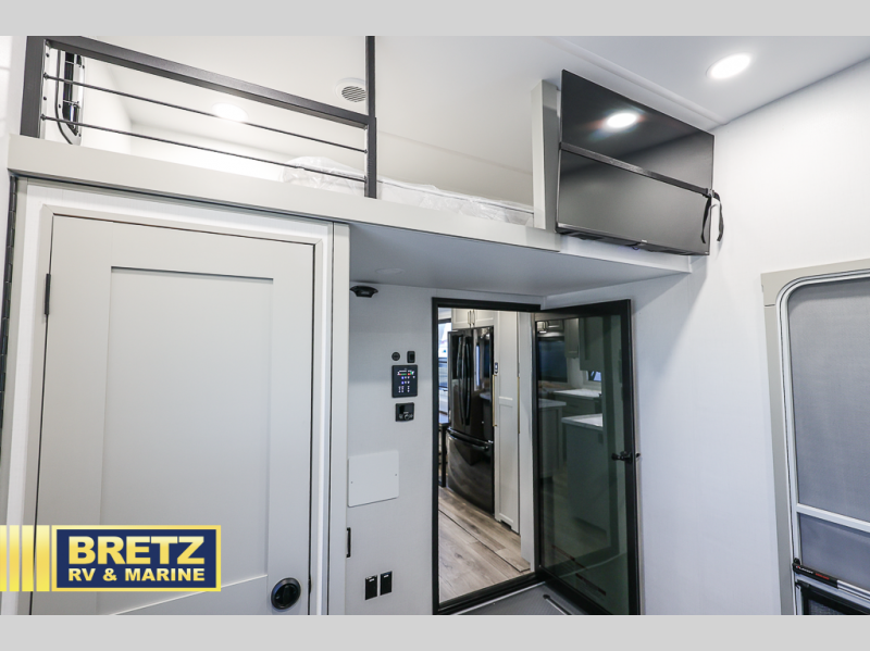 This toy hauler may just be the one you've been looking for! The garage/flex space with fold-away half bath walls will allow you to utilize the garage how you need it, plus there is an adjustable tie-down system, independent dual sofas, plus a loft for storage and a twin bed to sleep more campers! The garage patio with a 1,500 lb. capacity is another feature you are sure to love, especially with its own awning to keep you protected from the elements. Head to the kitchen to prepare meals with a 24" GE oven with a four burner range, a GE microwave with an air fryer, plus a spacious GE Energy Star 19 cu. ft. refrigerator. The island with two stools will let others visit with you while you cook, and there are even hidden dog bowls. You'll find the convertible dining table/L-desk will be accommodating since it can be use to dine at, and to get some work done. You may just find yourselves spending most of your time on the U-sofa in front of the TV and fireplace. A full bath is up front by the bedroom, and here you'll find neon shower lighting, a residential shower system, and pull-out linen storage to keep towels ready to use. After a day outdoors you'll love nothing more than coming back to your own bedroom with a king bed slide out, TV, a walk-in closet, and many more storage spaces. And we haven't even touched on the exterior features, like the 3-way pass-through storage, three power awnings, an air compressor to fill up tires, and the list goes on and on! This is a pre-production preview, all features and layout placement subject to change.
